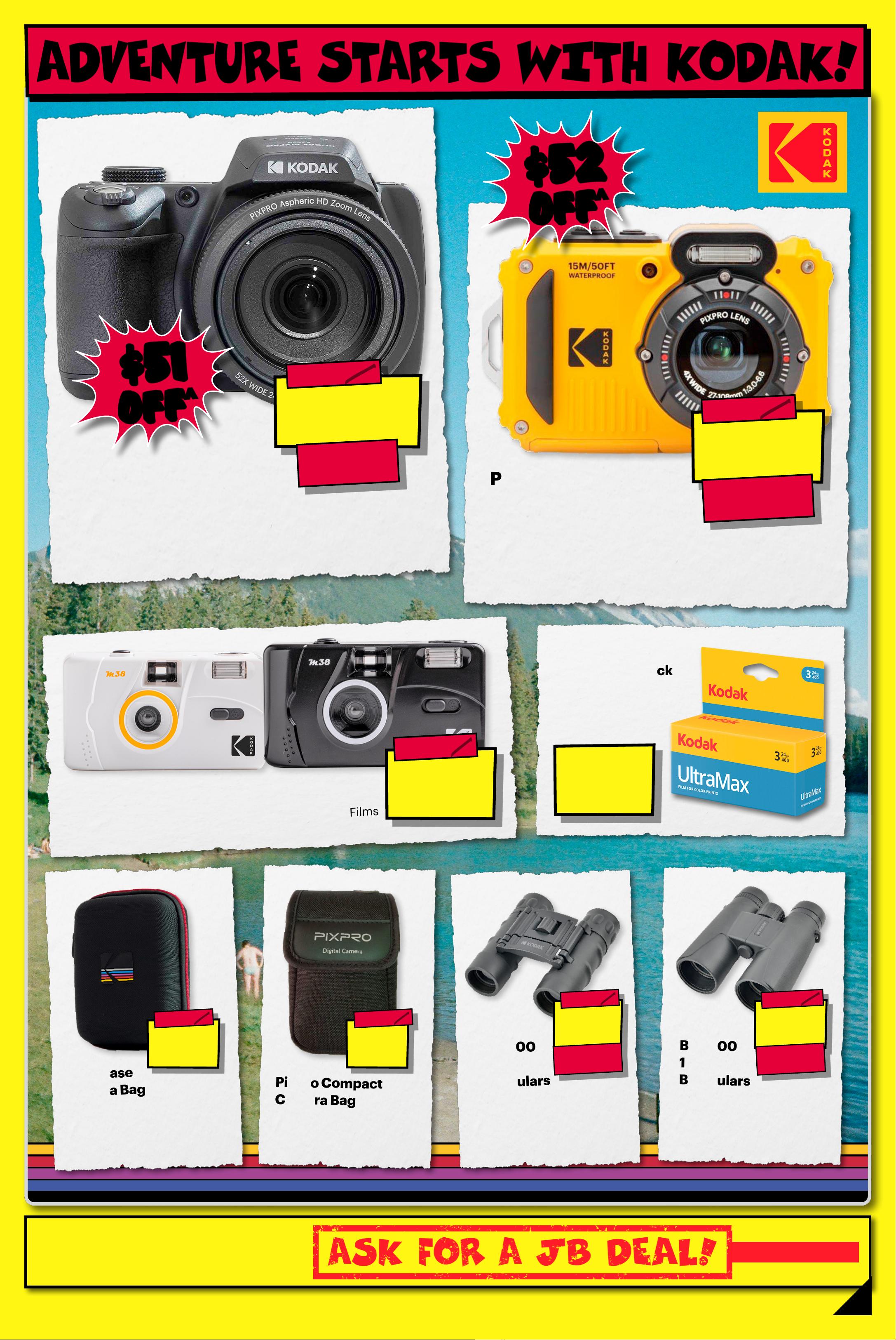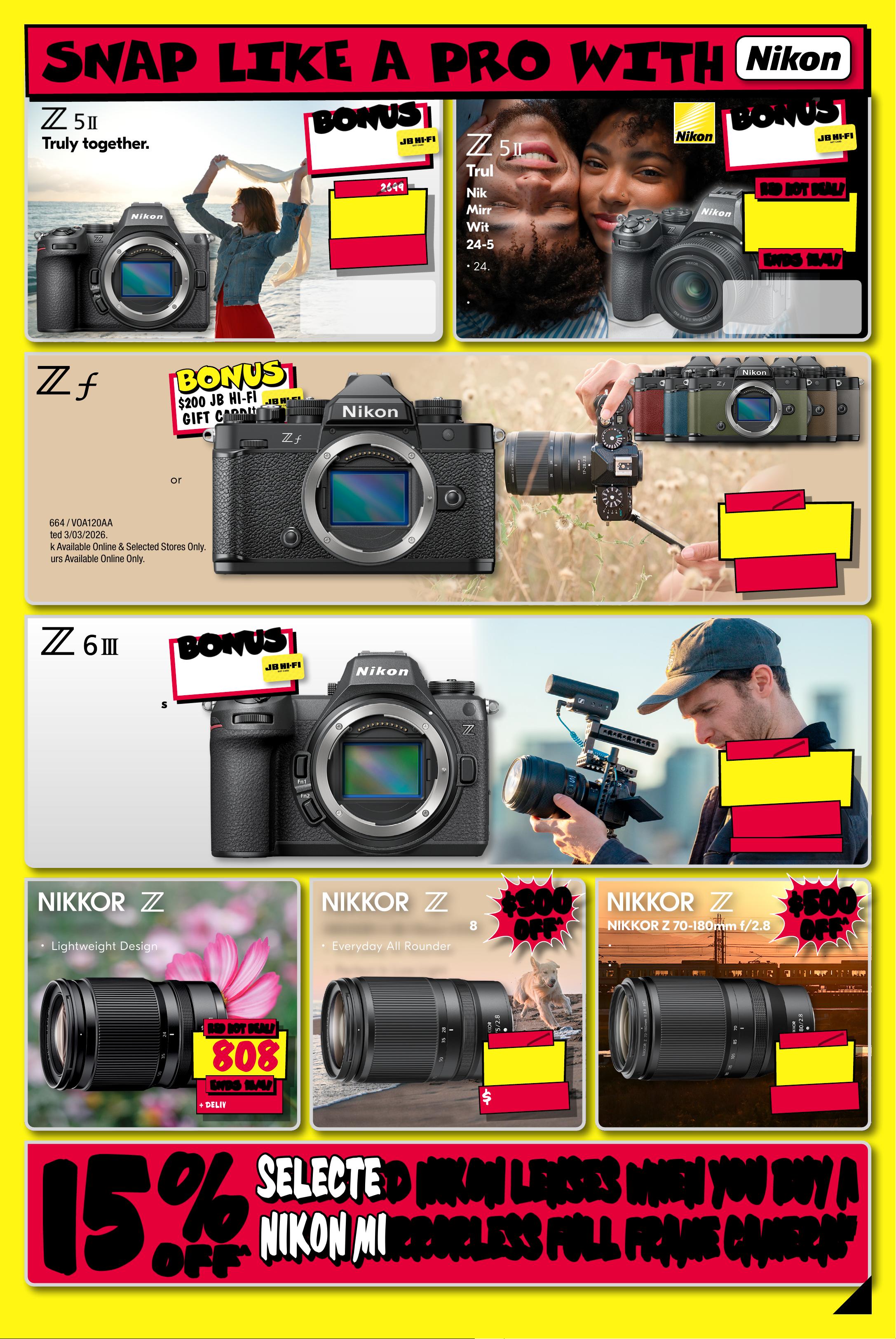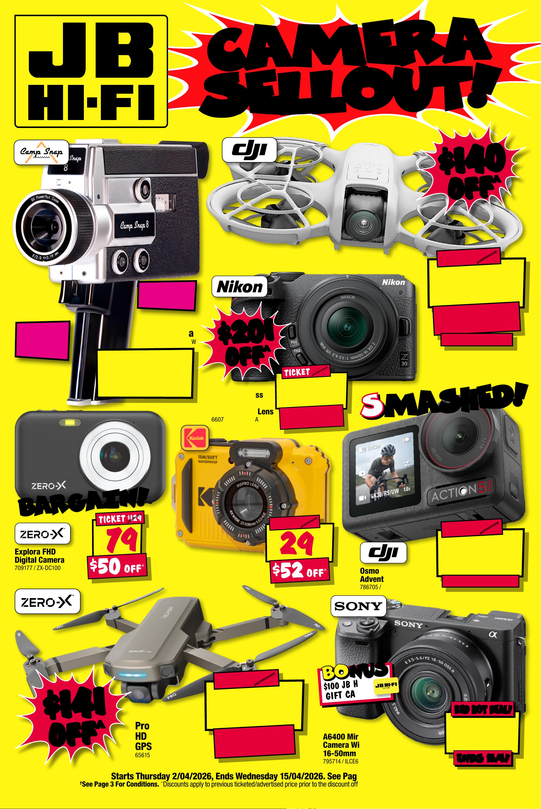 C A MER A C A MER A S E L L O U T! S E L L O U T! $ 24 9 CS-8 Di gi ta l Vide o C ame r a 88831 2 / CS-VC8-BK -W W 5 B U ILT- I N 5 B U ILT- I N VI N TAG E VI N TAG E FI L TERS! FI L TERS! JB JB EXC LUSIV E! EXC LUSIV E! $ 6 49 ADVENTU RE COMBO T ICK E T $ 709 O s m o Actio n 5 PRO Ad v e n t ure Combo78 6 7 05 / CP . OS. 00000350. 01 S M A S H E D! S M A S H E D! $ 79 $ 50 O FF ^ T I C K E T $ 12 9 E x p l o ra F HD D ig i t a l C am e r a 7 0 9 17 7 / Z X - D C 10 0 B A RG AI N ! B A RG AI N ! $ 1 347 ENDS 15/4! ENDS 15/4! RED HO T DE AL! RED HO T DE AL! A 6 4 0 0 M i r rorlessC am e r a W i th E 3. 5- 5.6 /P Z 1 6 - 5 0 m m OSS II L ens 7 9 5 7 14 / I L C E 6 400KB B O NUS B O NUS $100 JB H I-FIGIFT CA RD! † $ 29 7$ 5 2 O FF ^ TI CK ET $ 349 S t a r ts T h u r s d a y 2 / 0 4 / 2 0 2 6, E n ds W e d n e s d a y 1 5 / 0 4 / 20 26 . See P a g e 19 For Conditions . † S e e P a g e 3 F o r C o nd i t io ns . ^ D i s c o un t s a p p l y t o p r e v i o u s t ic k e t e d / a d v er t is e d p r i c e p r i o r t o t h e d i s c o u n t o f f er at the tim e of pub lica tio n 27 /03/2026. A s we nego tia te, pr odu ct s will lik ely have b een so or tld below ticketed/ adver tised price pri o the di sco unt o ff er. Pric es may di f fer at airport stores. Z 30 M irr orle s s Came ra Wi th 16-5 0mm V R L e ns 6 6 0 7 97/ V O K 110 U A $ 99 8 $ 201 OFF ^ T I C K E T $ 1199 $ 328 $ 141 OFF ^ T ICK E T $ 469 P r o Levion Full H D Drone With G P S &Wi-F i 656 1 5 6/ ZXP-D R3 $ $ 141 141 OFF OFF ^ ^ $ 39 9 $ 14 0 OFF ^ FLY MOR E C OMBO T ICK E T $ 5 39 Neo F ly More C ombo 7 8 2 313 / CP .FP .00000 1 85 .03 $ $ 140 140 OFF OFF ^ ^ $ $ 201 201 OFF OFF ^ ^ WP Z2 16MP 4X O pt ica l Zoom Waterproof Dig it al Ca mer a 653250 / WPZ2YL -