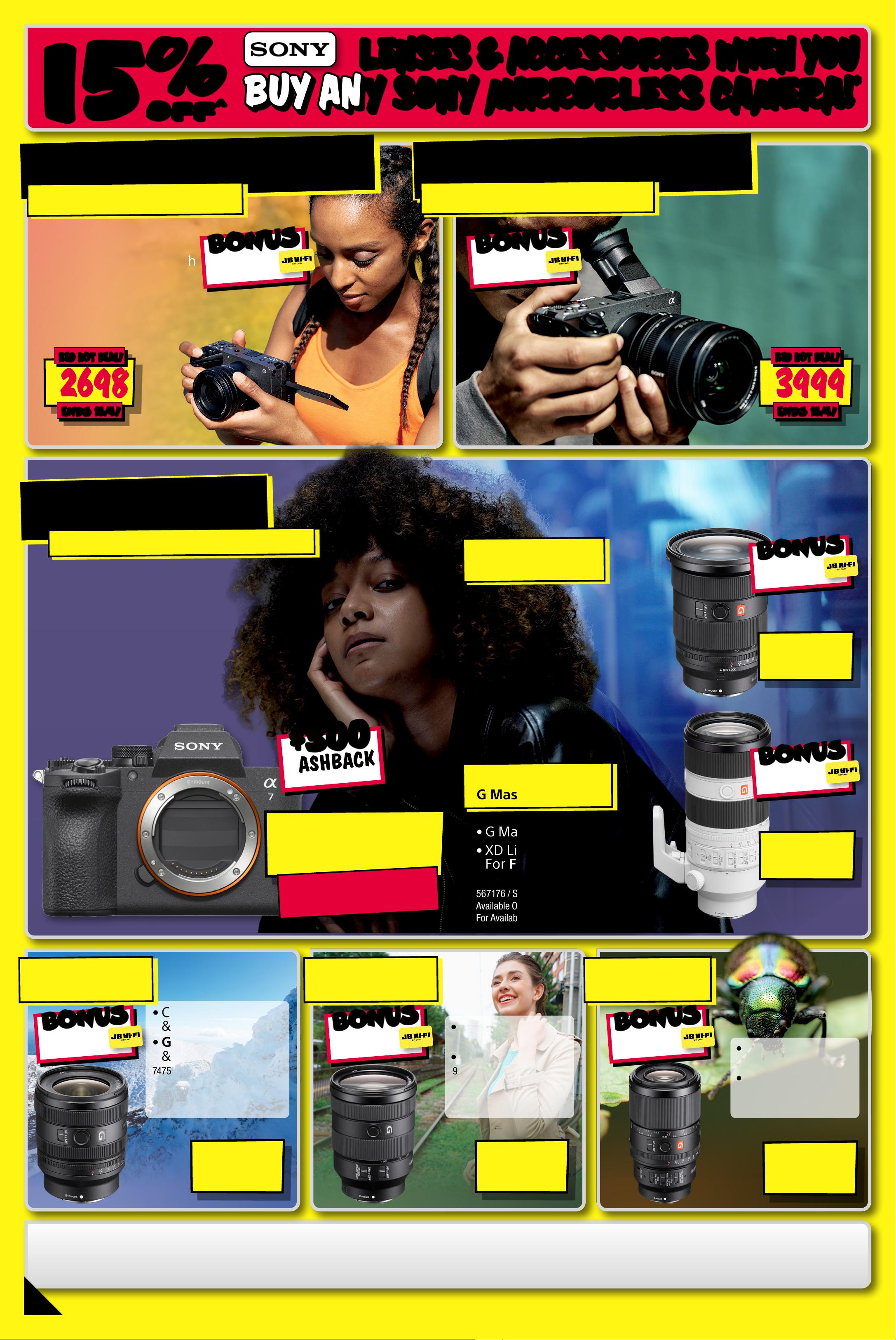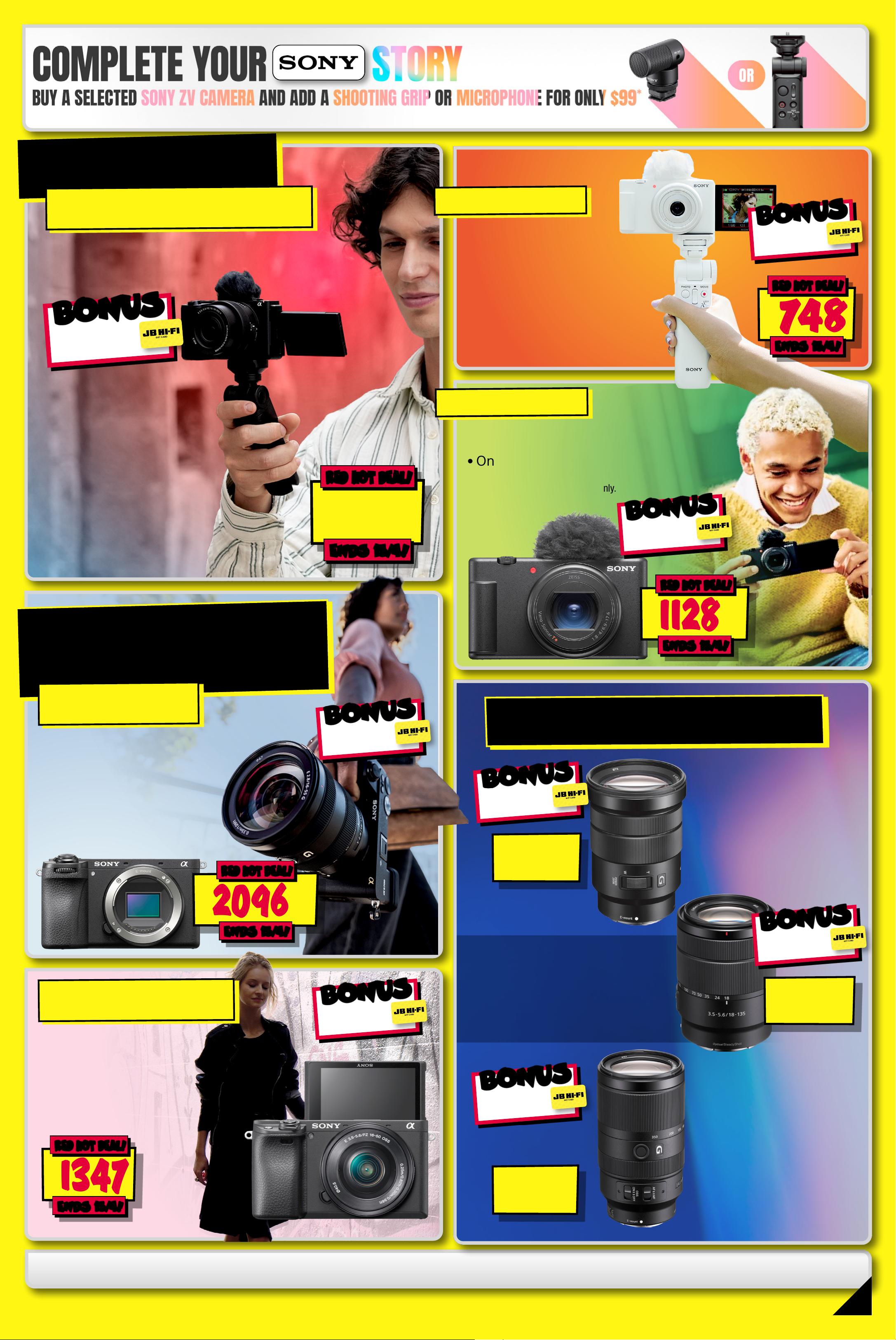 FX2 Full-F r ame Cinema Camer a Enhanc ed solo shooting FX30 APS-C Cinema Camer a Captur e stories your way • Up T o 4K 120p Video With Autofocus • Cage-Free Design Wit h Built-In C ooling F an • Tilt able HDViewfinder • Inst ant Switch Between Movie & Stills Mode • Up T o 30 fps High- Speed Continuous Shooting • Enhanced Subject Recognition Capability Driven By AI T echnology • G M a ster T elephoto • X D L i near M oto rs For F ast Fo c u s FE 24- 7 0mm F2.8 G Master II Lens FE 70- 200mm F2.8 G Mas ter II Lens• E -Mount Full Frame Format • G Mas ter St an dar d F 2 .8 Z oo m • C ompact For T ravel & Landscapes• G Lens Resolution & Performance• The Great All-Rounder • A Mus t In A ny K i t FE 16-25mm F2. 8 G Lens FE 24- 105mm F4 G Lens • Ultra Mac ro x 1.4 Magnif ication • XD L in ear F or Silent Focus FE 100mm F2.8 GM Macro L ens $ 26 9 8 ENDS 15/ 4! ENDS 15/ 4! RED H OT DE AL ! RED H OT DE AL ! 803357 / ILMEFX30B Bo dy O nly, Len s So ld Separately. Availab le On line & S ele cte d Stores Only . Fo r Av aila bilit y Visi t jbhi.fi/ 80 33 57 B O N US B O N US $200 JB HI-FI GIFT CA RD! † $ 3 999 ENDS 15/ 4! ENDS 15/4! RED H OT DE AL ! R ED HO T DE AL! 814 4 2 9 / ILMEF X2B B od y Only, L ens S old S eparately . Availabl e Onli ne & Se lec ted S tores Only . Fo r Ava il abilit y Visi t jbhi.fi/ 81442 9 B O N US B O N US $200 JB HI-FI GIFT CA RD! † $ 269 9 595855 / SEL24 70GM2 Ava ilab le Onl ine & Selected Stores Only . For Ava ilabilit y V isi t jbhi.fi/5 958 55 B O N US B O NUS $200 JB HI-FI GIFT CA RD! † $ 3 299 5 6 7 17 6 / S EL70200GM2A v a i l a b l e O nline& Selected Stores Onl y. F o r A v a il a b ility Visi t jbhi.fi/5 67176 B O N US B O NUS $200 JB HI-FI GIFT CA RD! † $ 1 599 74 7 5 9 7 / S E L16 2 5 G A vail able O nlin e & Se lec ted St ore s Onl y. For Availa bilit y Visi t jbhi.fi/ 7 47597 B O NUS B O N US $150 JB HI-FI GIFT CA RD! † $ 1499 9 2410 5 / SE L 2 410 5 G Ava ilab le Onl ine & S elected Stores Only . For Availa bilit y Vi sit jbhi.fi/9 241 05 B O NUS B O NUS $150 JB HI-FI GIFT CA RD! † $ 2199 8 4 4 2 15 / SEL 1 00M28GM B O NUS B O NUS $200 JB HI-FI GIFT CA RD! † † Se e Pag e 3 For D e ta i ls. * When purchased in t he s ame tr an sac ti on. L imit o f 1 Le ns & Ac ces so r y Mod el Type pe r Trans ac tio n . Ex c l u de s GPVPT2 BT , GPVPT2 BTW , GPVPT 3, GP V P T3 W, EC MG 1 & pro duc ts s old by 3 rd p ar t y (JB H i- Fi M ar ket place) sellers. ◊ Off er vali d for A U re sid ent s 18+ (or w it h p arental consent) who purchase a new (pai d in f ull ) So ny A lpha 7 V c ame ra be t ween 2 /04/2026 an d 30/06/2026. Custo mer m ust maint ain receipt an d su bmit t hei r claim a omt sonypromotions.c .au /di cas hba ck by 1 1 :59pm AEST 2 8 / 0 7/ 2 0 26 . Elig ible m odel s eerial number requir d for c laim . Ap prov ed cla ims wi ll be se nt c ash back f und s via E F T wi thi n 28 bu sine ss d ays of c laim a pproval. Cashback wi ll be $3 00 p er A lph a 7 V came ra pu rch ase d. To view f ull T& C s visit sonypromotion s.com. au/dicashback . Limi t of on e claim p er eligible model, ma ximum o f t wo eli gi ble model claims per cus patome r and p er ho use hold a ddr ess . By rticipating claima nt s agr ee to r ece ive mar tioketing communica ns fr om S ony. If eligible model is re turned f or r efu nd, S ony may r ecla im ca shb ack or r equ est p ayme nt o f valu e of any c as hba ck pai d to cu s tomer. Excludes refurbished products, bo x damage d pro duc ts , com merc ial s ale s and d ut y fr ee pur cha ses . No t ava ilab le in conjunc tion wit h any other offer or prom otion. ^ Dis coun ts appl y to pr evio us ti cketed/adver ice ptised pr rio r to th e disc oun t of fer a t the t ime of pu blic ati on 2 7 /03/2026. A s we nego tia te, pr odu ct s will lik ely have b een so or tld below ticketed/ adver tised price pri o the di sco unt o ff er. Pric es may di f fer at airport stores. LEN SE S & ACCE S SOR I E S LEN SE S & ACCE S SOR I E S WHEN Y OU WHEN Y OU B U Y AN Y S B U Y AN Y S ON Y MIR R ORLE S S CA MER A! ON Y MIRR ORLE S S CA MER A! * * E xclud es J B Hi- Fi M ar ket pla ce Pr odu ct s 15 15 % % OFF OFF ^ ^ Pur e expr ession Alpha 7 V Full-F r ame Hybrid Camer a YO U PAY $ 4 39 9 $ 4 0 99 AF TER CASHBACK ◊ 868605 / ILCE7M5B Availa ble O nline & S ele ct e d Stores Only . Fo r A vailability Visi t jbhi. fi/8 68 605 C A S H B A CK VIA REDEMPTION ◊ $ $ 30 0 30 0 2 Page contents: Sony ZV-E10 II Mirrorless Vlog Camera with 16-50mm Lens Kit (Black), Sony ZV-1 II 18-50mm Vlogging Camera (Black), Sony Alpha A6700 Mirrorless Camera [4K Video](Body Only), Sony Alpha A6400 Mirrorless Camera with 16-50mm II Lens (Black), Sony CyberShot ZV-1F 4K Vlog Camera (Black), Sony E 18-135mm F3.5-5.6 OSS Camera Lens, Sony SELP18105G E-Mount PZ 18-105MM F4 G OSS Camera Lens, Sony 70-350mm f/4.5-6.3 E Mount OSS G Camera Lens, Sony ECMG1 Big Capsule Shotgun Microphone, Sony GP-VPT3 Wireless Multi-function Shooting Grip (Black),• Innovative AI Pr ocessing Unit For Enhanc ed Subject Recognition, AF & T racking • In-Body 5 -Axis Image Stabilisation With Active Mode For Movie Shoo ting PZ 18- 105mm F4 G OSS Lens • 6x P ower Z oom G Lens, Perf ect For Vide o • E-Mount, APS-C Forma t Y our journey , beautifully c aptur ed Alpha 6 700 P remium APS-C Camer a • Phenomenal 0.02 Sec AF Perf ormance & Real- Time T r acking • High-Resolution 4K Movie Recor ding E 70-350mm F4.5- 6.3 G OSS L ens • The Versatile T raveller • XD Line ar For F ast, Quiet F ocus E 18- 135mm F3.5-5 .6 OSS • E-Mount, APS-C F ormat • 7 .5x Standard Z oom Lens • Wide Angle Shooting, F ace P riority AE & Soft Skin Effects • Smooth Motion Shooting Up T o 5x Slower , Or Up T o 60x Fast er • Real time Eye AF/Real- Time T r acking F or Movies • On e Touch Bok eh & Pr oduct Showcase Shooting Grip Sold Separately • Stunning 4K Footage At Up T o 60p • Creative Look & Cinematic Vlog Setting F or Gre ater Expres sive Fr eedom St ories