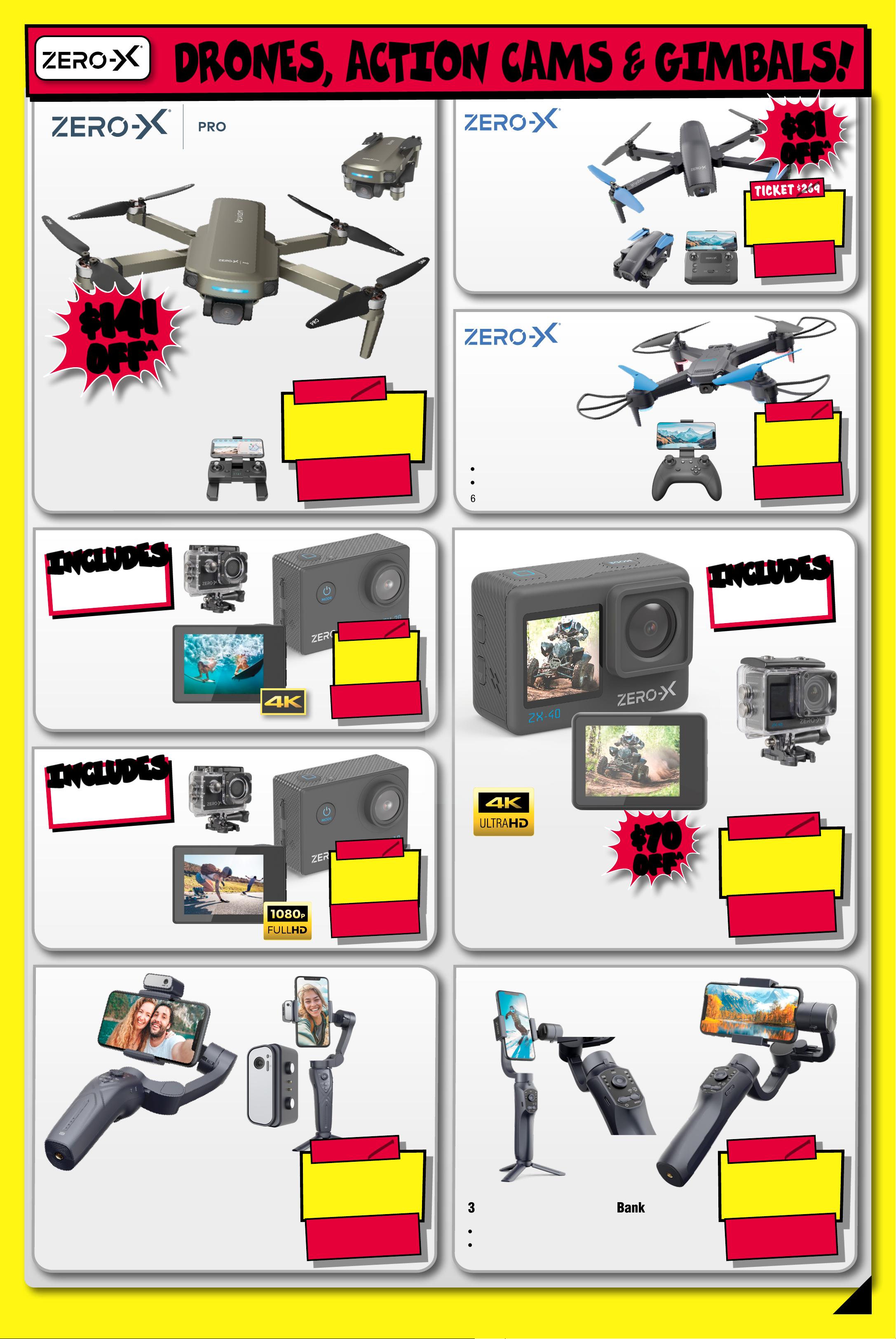 Page contents: Camp Snap CS-8 Digital Video Camera, Zero-X Explora FHD Digital Compact Camera (Black), Sony Alpha A6400 Mirrorless Camera with 16-50mm II Lens (Black), Kodak Pixpro WPZ2 Waterproof Digital Compact Camera (Yellow), Nikon Z30 Mirrorless Camera with 16-50mm VR Lens, DJI Neo Fly More Combo, DJI Osmo Action 5 Pro Adventure Combo, Zero-X Pro Levion Full HD Drone with GPS & WiFi,