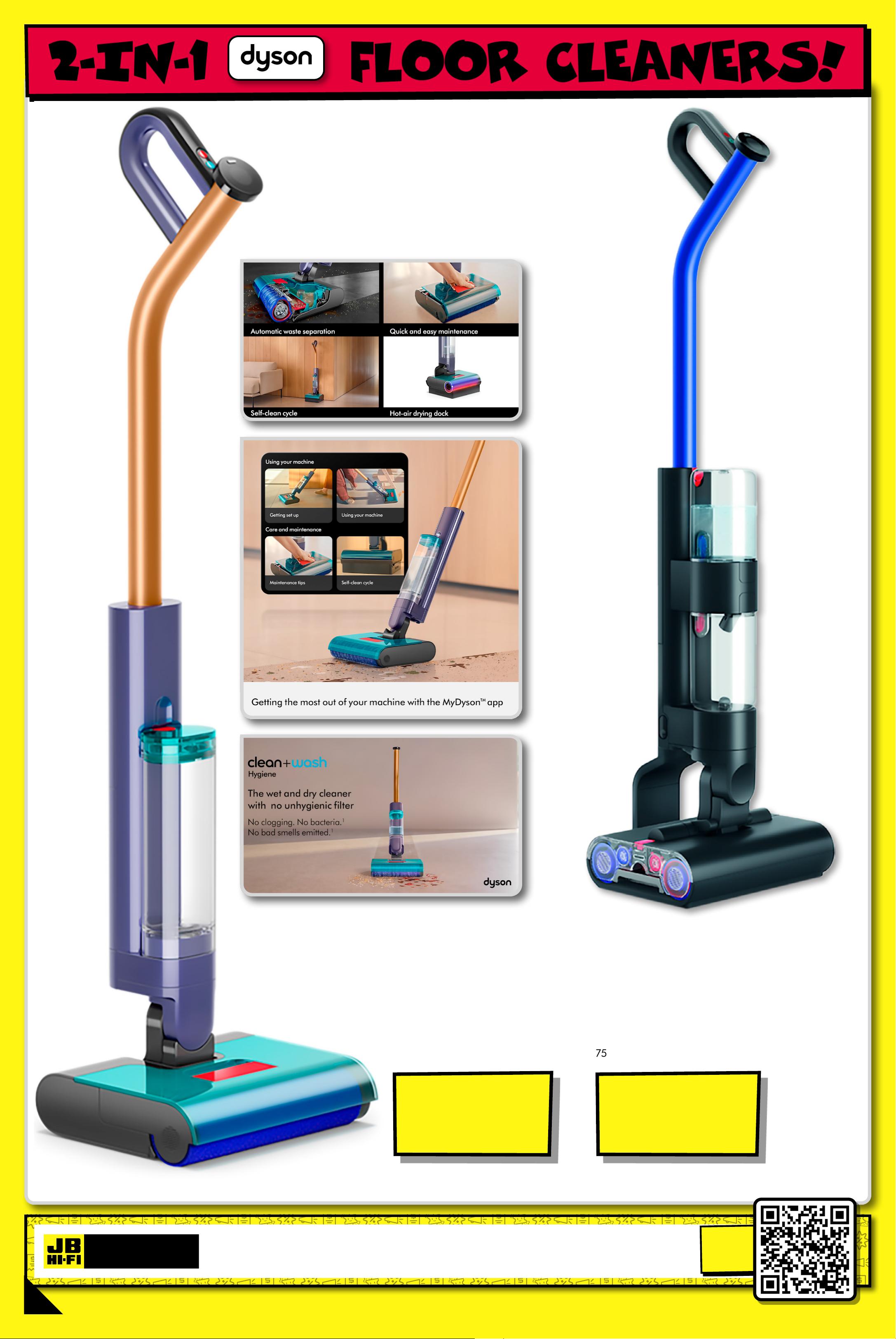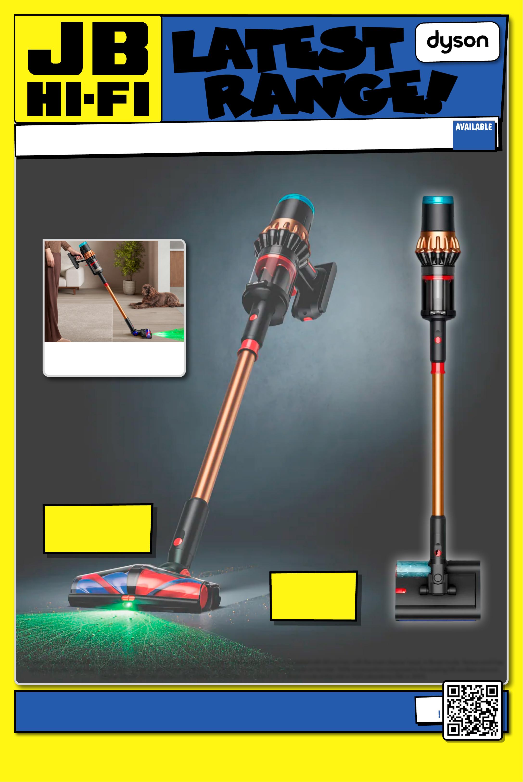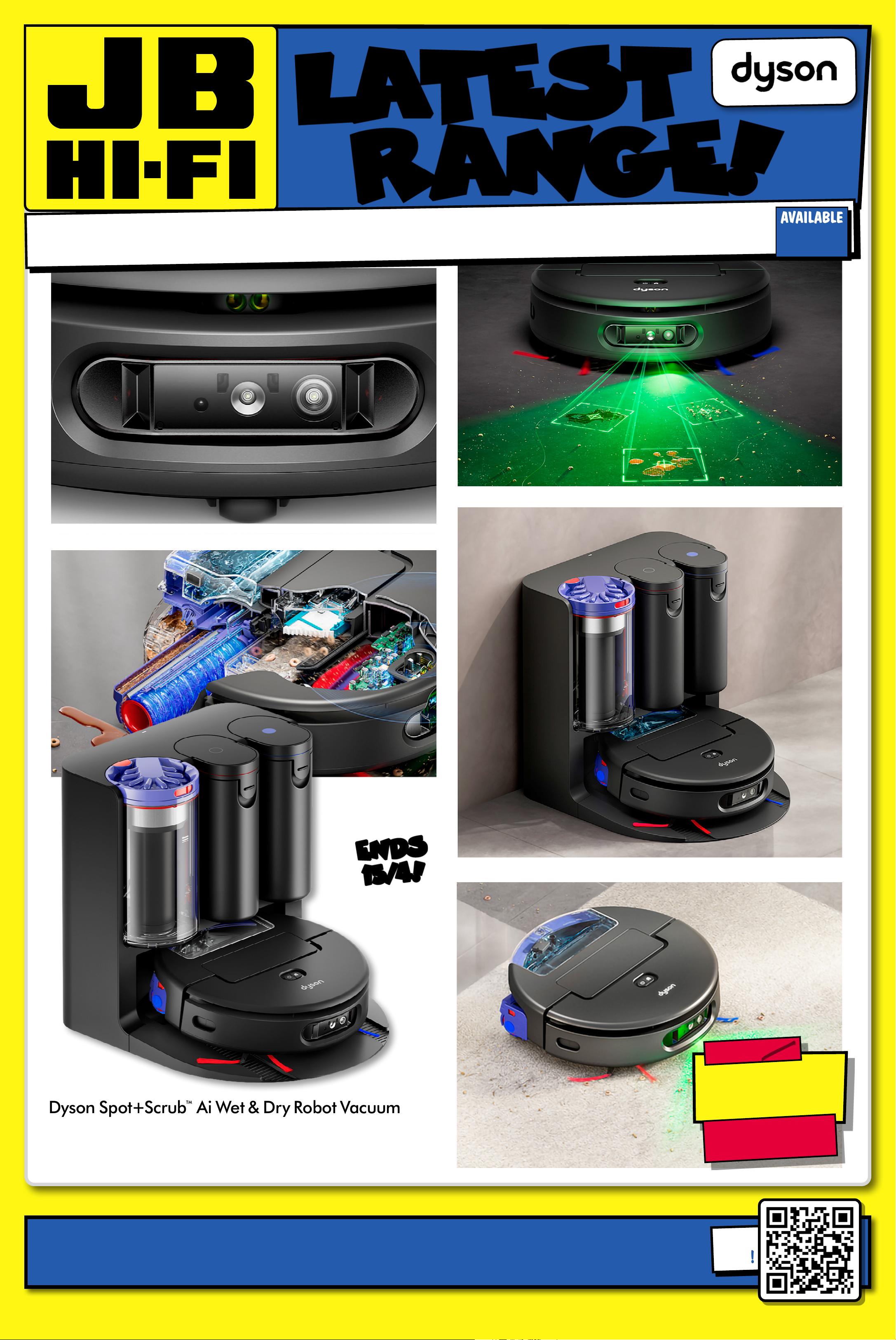CHECK OUT THE LATEST FLOOR CLEANERS, HAIR CARE, HEATING & COOLING! A V AI L A B LE INSTORE & ONLINE! S H O P THE F U LL R ANG E O F D YSON! SCAN HERE ! Applianc es available at JB H OM E st or es , selected JB stores & o nline at jbhifi.co m. jbhifi.com.au . Fin d st or es a t au/pages /smalls- stor es. ^ Di sco unt s app ly to pr e vious ticketed/adver thtised price prior to e disc oun t of fe r at th e time o f prin t ing 27 /03/2026. A s we neg oti ate, p rod uct s will l ikely h ave bee n sol d belo w tic ke ted prio/advertis ed price r to th e disc oun t of fe r . Pr ice s may differ at airport stores. L AT E S T L AT E S T R A NG E ! R A NG E ! D y s o n S p o t + Sc ru b ™ Ai W e t & D r y Ro b o t V a c uum • Cleaning 1 8,0 0 0 Pa Su ct ion Power • V a cuums. W ashe s Stains A gain & Again. Unt il Gone 883629 / 2 1 8087 -0 1 En ds 15/04/ 2026 $ 1 79 9 EA $ 20 0 OFF ^ T ICK E T $ 1999 E NDS E N DS 1 5 /4 ! 1 5 /4 !