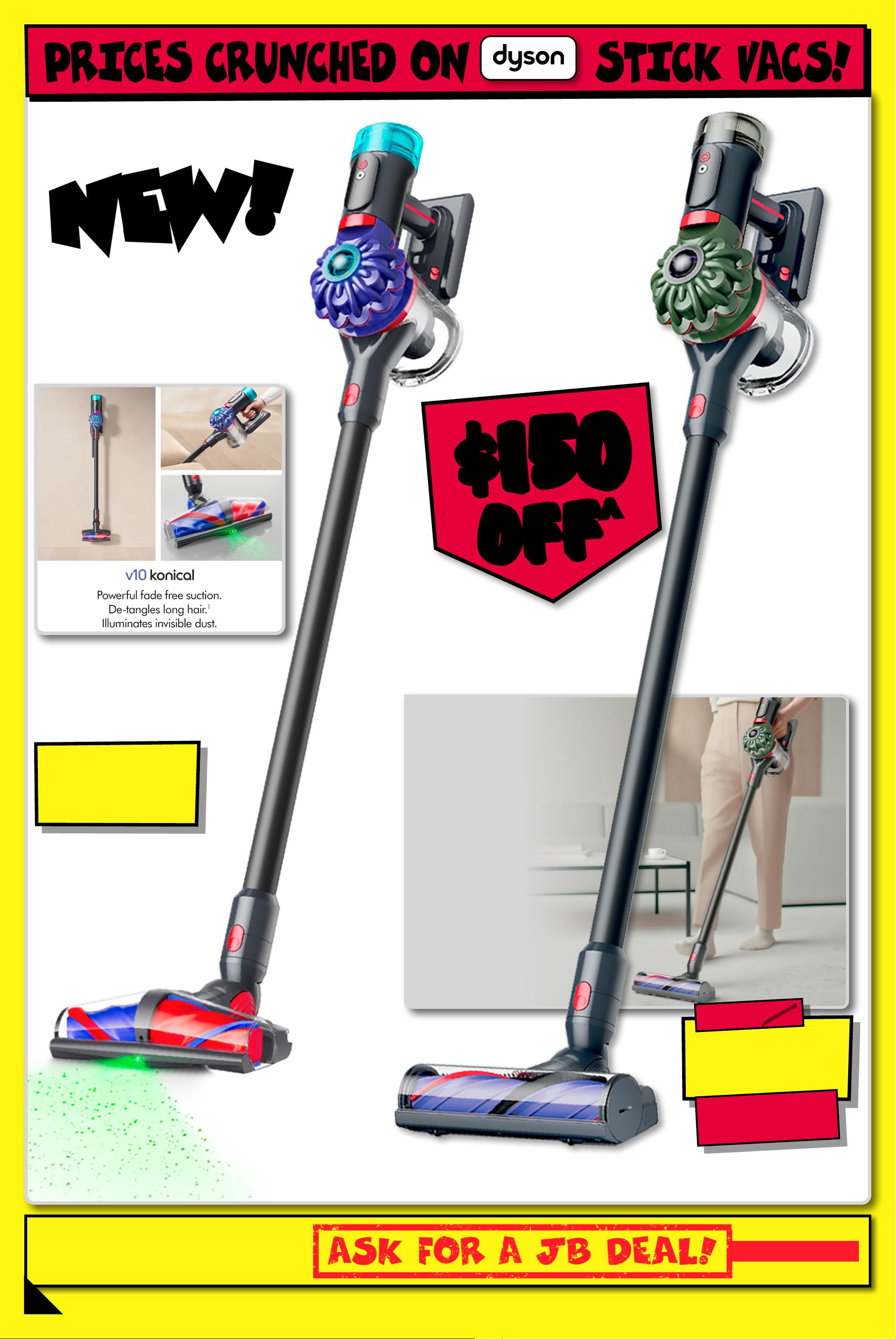 SE EN IT C HE A PE R ? INSTOR E | ONLINE E xclud es J B Hi- Fi M ar ket plac e Pr oduc t s P R I C E S C RU N CHE D ON ST I C K V A C S ! $ 79 9 EA Dy son V1 0 Konic al • Power ful Fa de- Free S uc t ion • Illumina tes D u st 88865 7 / 626 4 07- 01N E W! N E W! Applianc es available at JB H OM E st or es , selected JB stores & o nline at jbhifi.co m. jbhifi.com.au . Fin d st or es a t au/pages /smalls- stor es. ^ Dis coun ts a pply t o prev ious ticketed/advert ised price prior to the dis co unt o f fer at t he ti me of pr int ing 2 7 /0 3 /2 02 6. A s we nego en stiate, products will like ly have be old b elow t icke t ed prio/advertise d price r to th e disc oun t of fe r . Pr ice s may dif f er at a irp or t st ores. $ 49 9 EA $ 15 0 OFF ^ T ICK E T $ 649 D ys on V8 Cyc lon e Sti c k Va c • Ne w Ge nera tion V8 Wi th 30 % M ore Suc tion ³ • Enhanced Feat ure: Capture s 99 . 99 % Micros copic P ar ticles 5 81 775 4 / 2 2 6 8 9 0 - 01 $ $ 150 150 OFF OFF ^ ^ ¹Tes te d wi th ha ir to 6 0 cm, in B oo s t mo de. ³ 3 0% m ore s uc ti on c omp ar ed to t he e xi st in g V8 co rdl es s va cuu m cle an er ( SV 25). S u ct io n te st ed t o IE C 628 85 - 4:20 23 S ec . 5.1 1 and 5.1 2, in B oo st mo de a t th e inl et in S GS L ab or at or y U S A in 20 25. 5 Te s te d to ASTM 19 77 - 04 Boos t mod e in S GS L ab ora to r y U SA i n 202 5. Fi lt rat io n ef f ic ien c y is ca lcu la te d by co mp ar ing t he nu mb er o f standard dust par tic le s ab sor b ed by t he v acu um cl ea ne r to t he nu mb er of s t an dar d dust par ticles discharg ed. 2 -