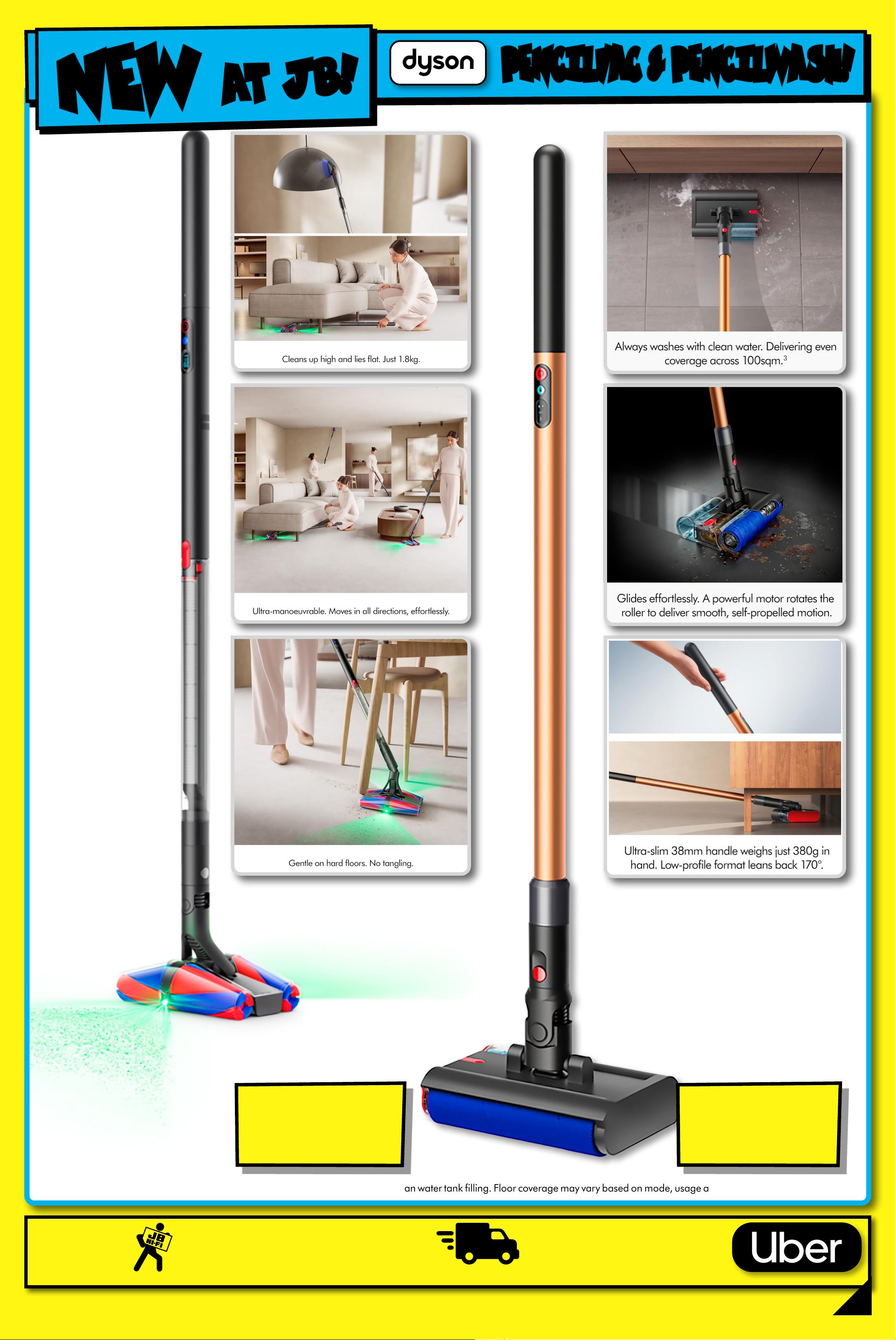 EXPRES S EXPRES S DELIVE R Y WIT H DELIVE R Y WIT H FA S T DE LIVER Y FA S T DE LIVER Y OP TIO NS AVAILA BLE OP TIO NS AVAILA BLE CLI CK & CLI CK & CO LLECT CO LLECT Onli ne or der s onl y on se lec ted p rod uct s. W her e avai lab le, 'U ber ' will s how a s a deli ver y op tio n in che ckou t. V is it jbh ifi .com .au /ub er fo r mor e det ail s. ³ Flo or co ver ag e is si mul at ed i n low h ydr at ion m od e ba se d on s ing le cl e a n w a t e r t a n k f illin g . F l o o r c o v e r a g e m a y v a r y b a s e d o n m o d e , u s a g e a nd cl ean ing r ou tin e. Appliances availa ble a t JB H OM E stores, selected J B stores & o nli ne a t jbhifi.com. stoau. Find re s at j bhi fi .co m.au/p ages/ smal ls-stores. PE NC I LV AC & P E NC I L W A S H! PE NC I LV AC & P E NC I L W A S H! N EW N EW AT J B ! AT J B ! $ 849 EA Dyson Penci lV ac Fluf f yc one s ™ Cleaner • Cleaning T ech: 14 0 , 000 rp m Dyso n Hy p erd ymiu m M otor • Enhanced Fe a t u re: LE D Illumi nat ion For ward & B ac k wards 8 3 17 3 4/ 4 9 2 7 14 - 01 $ 549 EA Dyson PencilW ash ™ W et Cle aner • Cleani ng T e ch : Li ght Weigh t Floor Cleaner • Enhanced Fea ture: Le ans Ba ck 1 70 Degr ees Fo r Eas y Cle aning U nd er Low Furnitur e 8 9 0 512 / 6 3 72 4 5 - 01 5 -