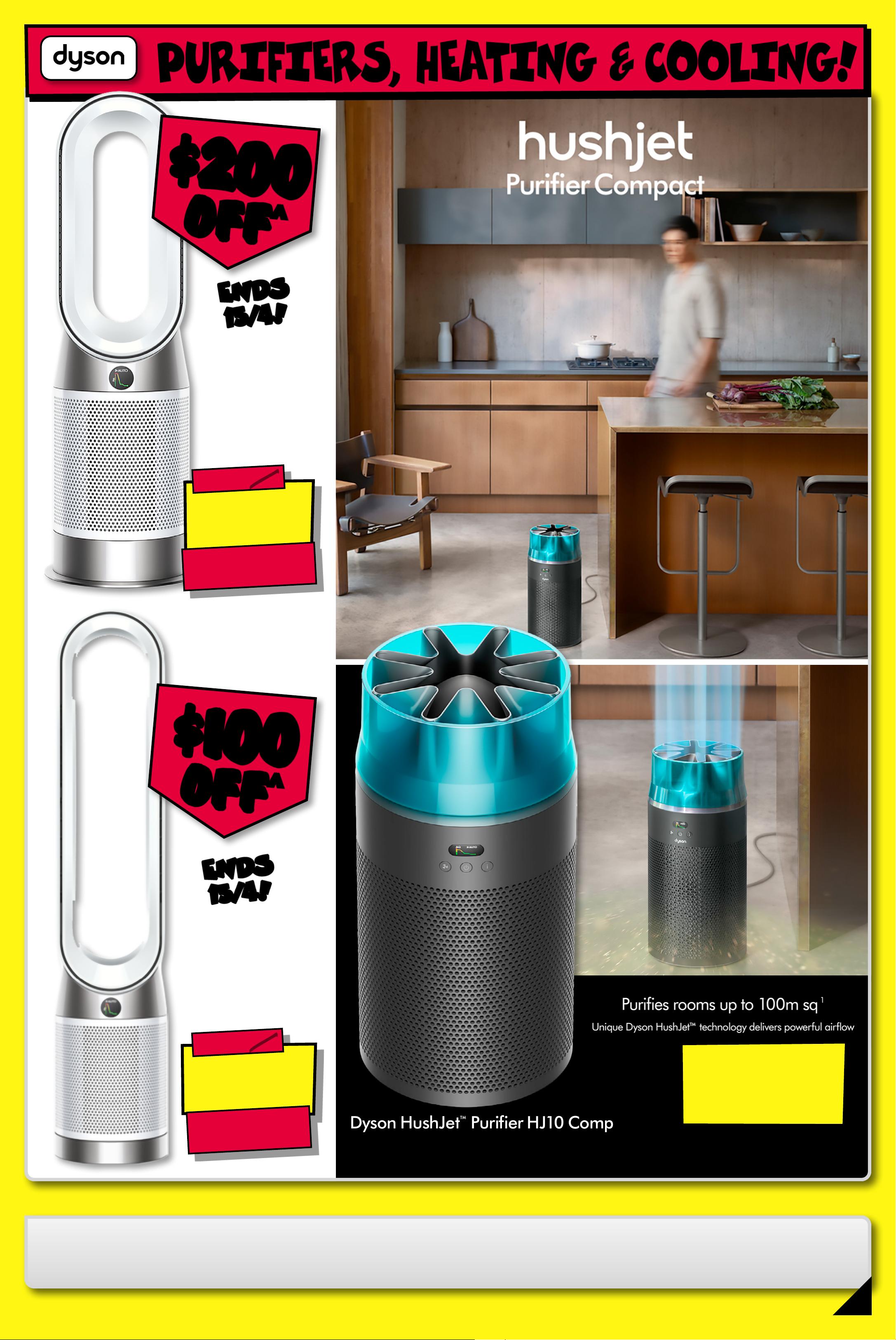 P URI F IE R S , HE A T I N G & C OOL I N G ! $ 699 $ 100 OFF ^ T ICK E T $ 799 Dy son Purifier Cool P C1 ( W hi t e) 8 314 8 5 / 5 4 49 2 9 - 01 En ds 15/04/ 2026 E NDS E N DS 1 5 /4 ! 1 5 /4 ! $ $ 100 100 OFF OFF ^ ^ $ 699 $ 20 0 OFF ^ T ICK E T $ 899 D y s on H P1 Purifier H ot + Cool Pur if y ing Fan He ater 796724 / 544 880-0 1 En ds 15/04/ 2026 E NDS E N DS 1 5 /4 ! 1 5 /4 ! $ $ 200 200 OFF OFF ^ ^ $ 549 EA D y s o n Hu s h J et ™ Pu r if i e r H J 1 0 Co m p act • D y son's M os t Power ful & Q uiet, Small-Fo r mat Purifier 8 862 57 ¹B as ed o n 1 ACH Applianc es available at JB H OM E st or es , selected JB stores & o nline at jbhifi.co m. jbhifi.com.au . Fin d st or es a t au/pages /smalls- stor es. Un less speci fied, all pro duct s on sa le until the end d ate on the f ron t cover , or unle ss so ld out. A ll pro duct s in this cat alo gue are adver t ised in goo d fait h to b e available at t he time of sale. P urchas e limit right s reser ved, t ied. Orade not suppl f fer s not available a t Air por t & E xpr ess s tore s. All o f fer s exclude Ma rke t place produc ts . Corr e ctions: We res er ve the right t o corr ect any . This cprint ing err or s ata logue mus t be read in conjunc tion w ith c atal ogue terms & condition s p ublishe d at jbhif i.c om.au/terms-conditio ns/ ^ Discounts appl y t edo pre viou s tic ket /advert ised price prio r to t he dis cou nt of f er at t he tim e of pri nting 27 /03/2 0 26. A s we neg oti ate, p rod uct s wil l likely h ave bee n sol d be low ticketed se/adver ti d pric e pri or to t he dis co unt o ff er. Pric es may d if fer a t air por t s to res . 7 -