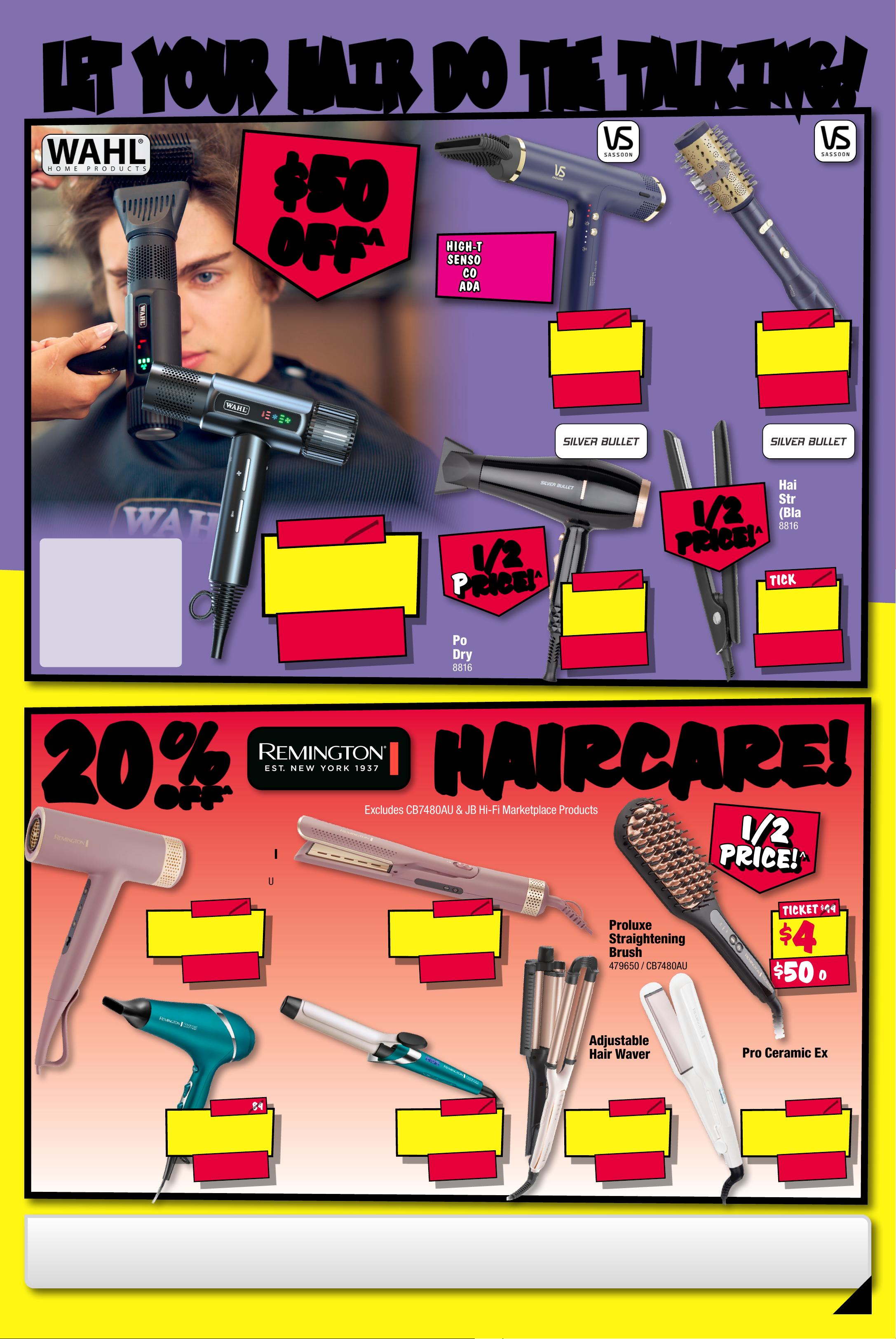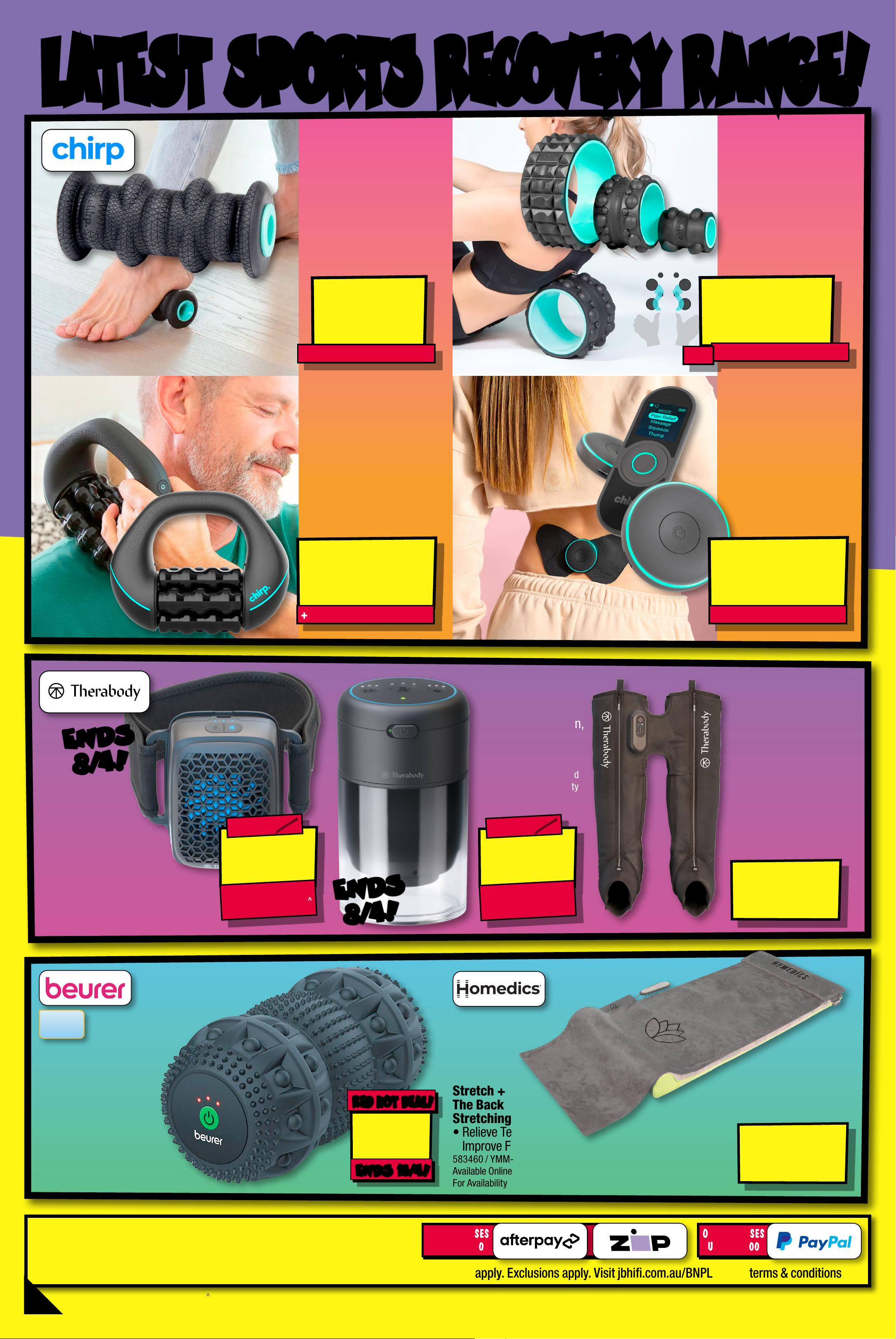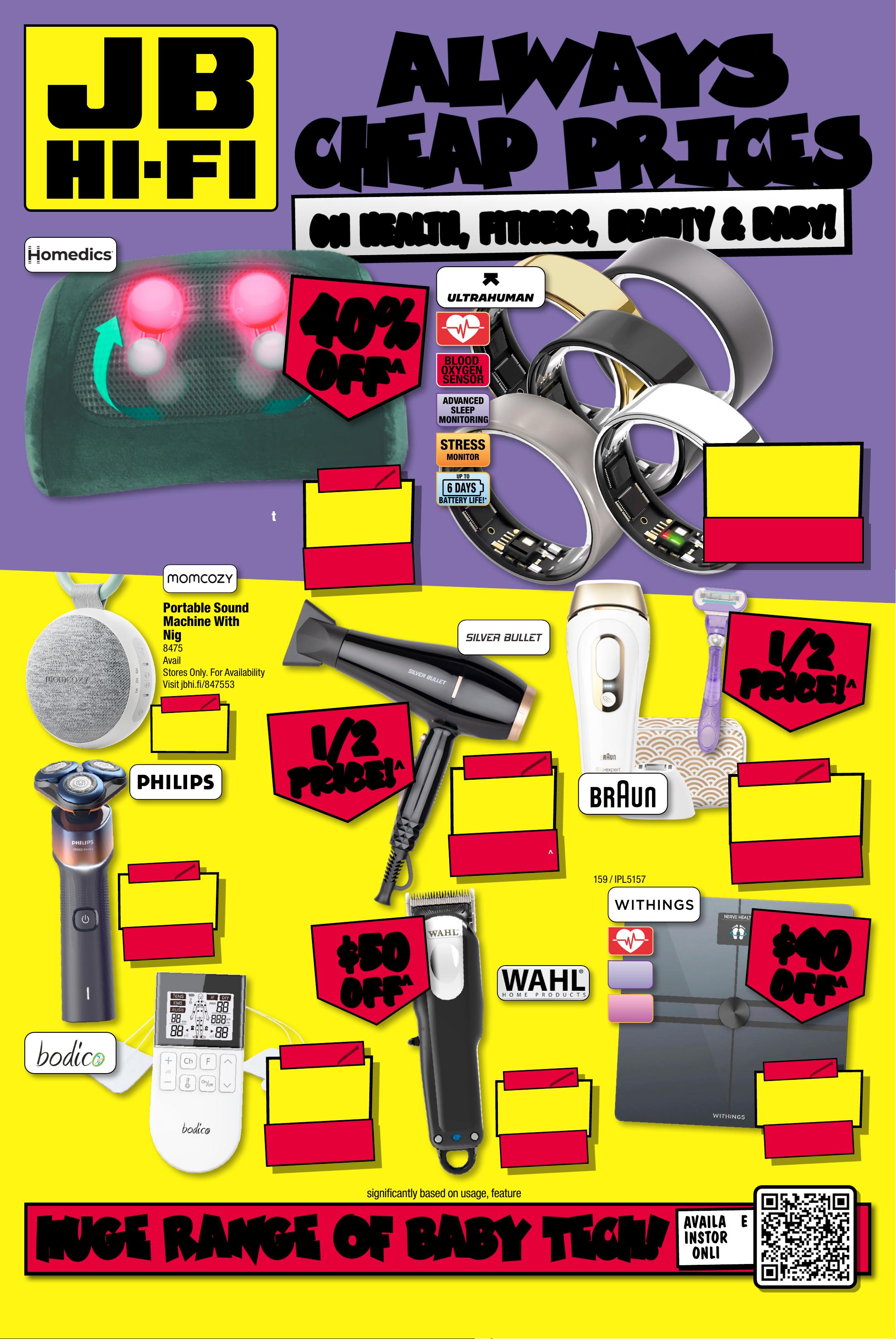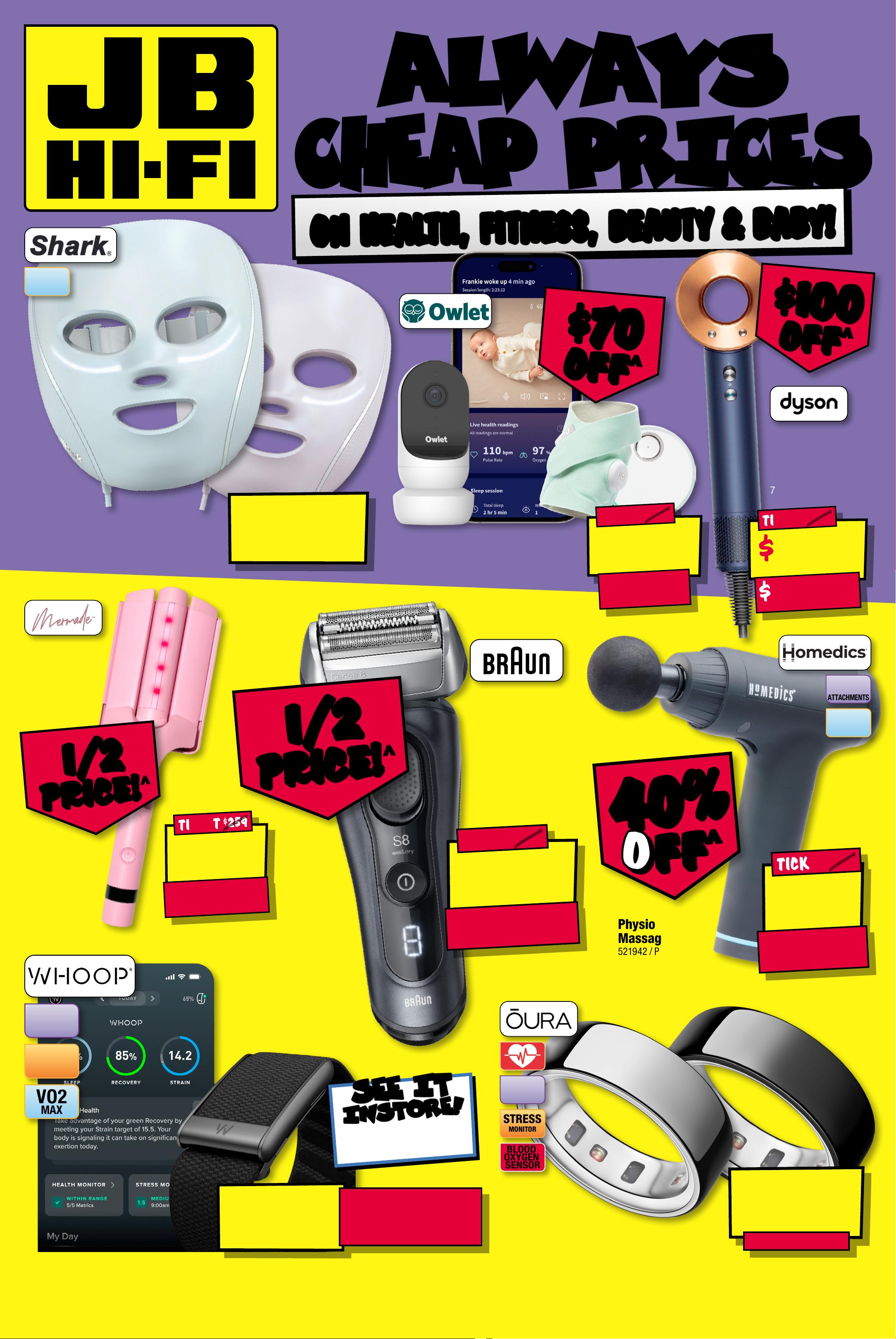 A L W AY S A L W AY S C H E AP P R IC E S C H E AP P R IC E S ON H EA L TH , F IT NE SS , BE AU T Y & B A BY! ON H EA L TH , F IT NE SS , BE AU T Y & B A BY! VO2 MAX PACE OF AGING 1 HEAL TH MONITOR WHO OP Peak ° 81 4068 / 973-004-000 Phone Not Included. Avail able Onl ine & S elec t ed Stores Only . Fo r A vailability Visi t jbhi. fi /81406 8 SEE IT SEE IT INSTORE! INSTORE! EXCL USIVELY AT JB! Selected Stores Only. For Availability Visit jbhi.fi/814069 $ 39 9 INC LUD ES 12 M ONT H " PE AK " MEMBERSHIP . DEVICE REQUIRES ONGOING ANNUAL MEMBERSHIP OF $399° $ 569 EA BL A CK OR S I LVE R BLOOD OXYGEN SENSOR STRESS MONIT OR 1 1 SIZES AVAILABLE Our a Rin g 4 † 80869 2 / JZ90-54 21 7 -08 C olo ur s & Size s May V ar y By S t ore. A vail abl e Onli ne & Select e d St ore s Onl y. For A vailability Visit jbhi.fi/8 08 692 $ 89 $ 60 OFF ^ T I CK E T $ 149 40 40 % % O FFO FF^ ^ 6 MASSAGE ATTACHMENTS 6 INTENSITY LEVELS P hy s i o M a s s a g e Gun 521 9 42 / P GM -74 5 - A U $ 699 EA LED LIGHT THERAPY Cr yoG low ™ Co olin g + LE D Fac e Mas k * 883533 / F W 3 12 A N Z Available Online & Selected Stores On ly. For Availab ility Visit jbh i.fi/883533 $ 49 9 $ 100 OFF ^ T I CK E T $ 599 Dyson Supersonic Hai r Dryer (Prus sian Bl ue/ Rich Copper) 7 96866/ 113 2 9 7- 0 1 $ $ 100 100 OFF OFF ^ ^ $ 129 $ 130 OFF ^ T I CK E T $ 2 59 M In fra re d Waver Pi n k 8 174 8 6 / M H 7 118 1/2 1/2 PRICE! PRICE! ^ ^ $ 3 79 $ 380 OFF ^ T ICK E T $ 759 Ser ies 8663 CC Wet & Dr y Elec tric Shaver 81 7045 / 8663CC 1/2 1/2 PRICE! PRICE! ^ ^ Starts Thu rsday 2/04 /202 6, Ends W edne sda y 1 5/04/2026. See Pa ge 23 F or Conditions . † Se e Pag e 6 For D e tails. ° See Pa ge 7 Fo r De t ails . * Alw ays Read T he L ab el & F oll ow Th e Dir e ct ion s Fo r Us e. A ppl ian ce s avail abl e at JB H OM E stores, selected JB s tores & onl ine a t jbh if i.c om .au . Fin d st or es a t jbh if i.c om . au /pages/smalls-s tor e s. ^ Discounts app l y to pr evio us ti cke ted prio/advert ised price r to t he dis cou nt of f er at t he tim e o f printin g 19/03/202 6. A s we neg ot iate , produ ly hct s will like ave bee n sol d be low ticketed sed p/advert i ric e pri or to t he dis cou nt of f er. Pric es may di f fer a t airport stores. $ 6 29 $ 70 OFF ^ TI CK E T $ 699 Dr eam Si gh t + Soc k Du o - Min t * 884 076 Phone Not Included. Ava ilab le On line & Selected Stores Only . F or A vail abil it y V isit jbhi.fi/ 88 40 76 $ $ 70 70 OFF OFF ^ ^ -