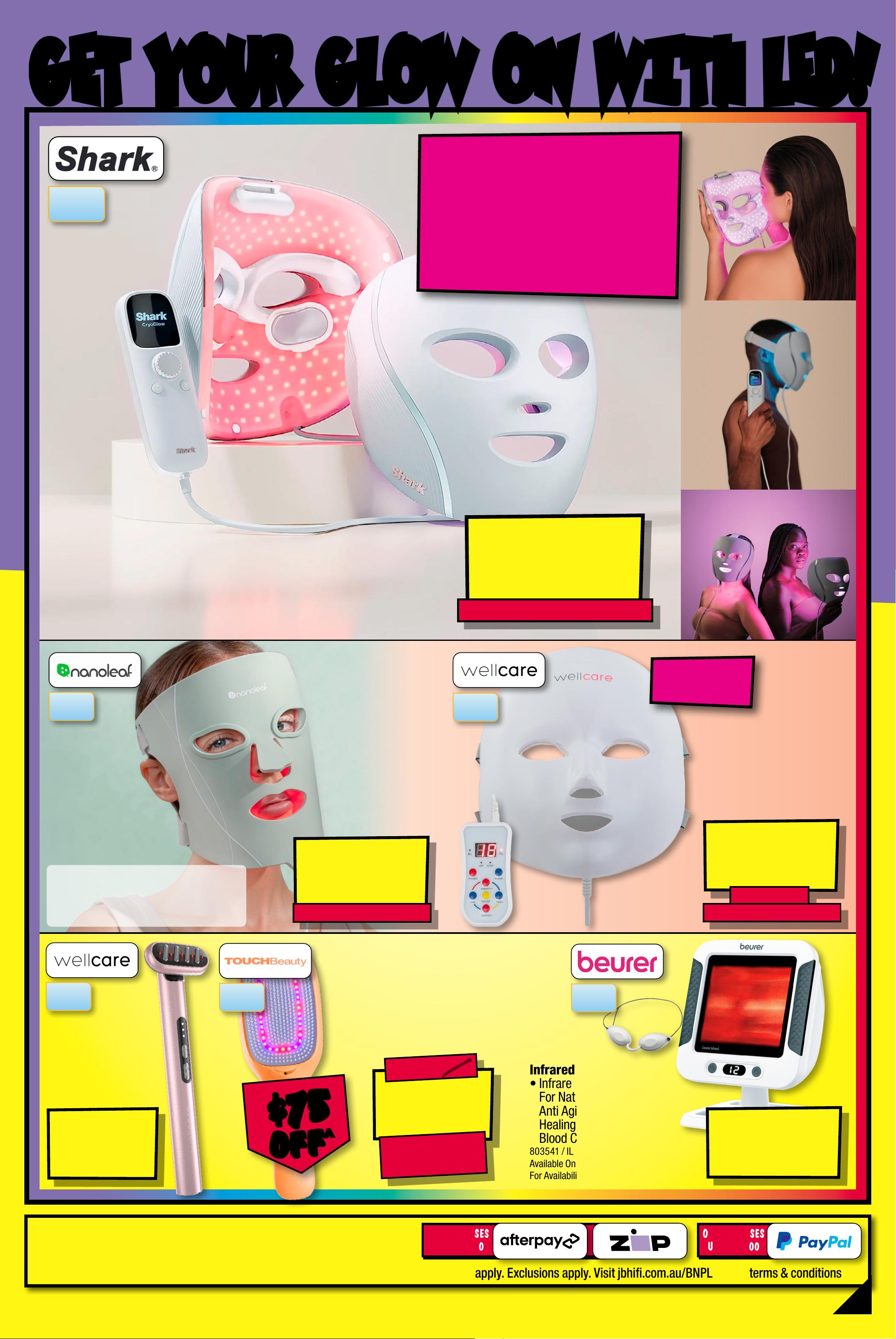 BU Y N OW , PA Y L AT ER Ca nno t be sp lit w ith o the r pay men t t ype s. Af terpa y lat e fees a pp ly. ZIP f ees & c har ges a p p l y . E x c l u s i o n s a p p l y . V i s i t j b h i fi . c o m . a u / B N P L for full t e r m s & c o n d i t i o n s O N PURCHA SE S U P TO $20 0 0 ON PURCH A SE S UP TO $ 30 0 0 * Alway s Re ad Th e L abe l & Fol low T he D ir ec ti ons F or U se . ^ Dis cou nt s appl y to pr ev ious ticketed/advert ised pr ice p rio r to th e disc oun t of fe r at th e time o f prin ti ng 1 9/03/2026. A s we negotiate, product en sos will likely have be ld bel ow tic ket ed/adver pritised price or to t he dis co unt o ff er. Pric es may dif fer at airpor t stores. $ 99 LED LIGHT THERAPY 90 R ot ar y Red & Blue LED F aci al Bea ut y W and 7 9 5 274 / WEHT M 03 Available Online & Selected Stores O nly. For Availa bilit y Visi t jbhi.fi/ 795 27 4 $ 26 9 LED LIGHT THERAPY In f r a r e d Lamp* • I n f r a r e d Hea t L amps A re Us ed F o r N a t ura l Pain R elief, Sk in A nti A g i ng & Heal th, Woun d H e a l i n g , Skin In fec tion s & Bl o o d C irculat ion 8 0 3 5 41 / IL 60Av a i l a b le O n line & S ele ct ed S tor e s O n l y. F o r A v a i l a b i l i ty V isi t jbhi .fi /8 03 5 41 $ 39 9 ONLIN E ONL Y + DEL IV E RY F R OM $5 . 9 9 LED LIGHT THERAPY Well car e LE D Fac e Ma sk * • 8 L ight Fr eque n cies, 5 Lig ht In ten sit y Modes 814 01 2 / SP-LM-002 Avail a ble O nline & S el ect ed Stores Only . Fo r Availability Visit jbhi.fi/814012 8 COLOURS 8 COLOURS OF LED! OF LED! $ 299 + DEL IV E RY F R OM $5 . 9 9 LED LIGHT THERAPY LE D Li ght T he rapy F ace M ask * • 7 T a rge te d T reatment Modes • Us es L ED & N ear I nf rar ed Lig ht ( NI R ) 883543 / NLED K00- 1T F M Availa ble Online Only $ 69 9 EA LI L A C CHIL L OR BL UE F RO ST LED LIGHT THERAPY Cr yo Gl ow ™ C ool ing + LED Fac e Mask * 883533 / F W 3 12 A N Z Available Online & S el ect ed S to res O n ly. For Availa bilit y Visi t jb hi. fi/88353 3 ¹Ba se d on re sul ts f ro m 12-week s tu dy wi th 6 0 su bjec ts a nd 1x per d ail y use in B ett er Ageing T reat m ent M ode . Ind ivi dual r es ult s may va r y ba sed o n dif fe ren t sk in t yp es BLUE, RED & I NFRARED LED LIGHTS. BLUE, RED & I NFRARED LED LIGHTS. REDUCE FI NE LINES & FI R REDUCE FI NE LINES & FI R M M SKIN¹ WITH A D AIL Y 6 -MINUTE SKIN¹ WITH A D AIL Y 6 -MINUTE TREATME NT TREATME NT . . CR YO -INS PIRED INTEG RAT CRYO -IN SPIRE D INT EGR AT ED ED COOLING TREA TMENT . COOLING TREA TMENT . $ 1 74 $ 75 OFF ^ T ICK E T $ 249 LED LIGHT THERAPY $ $ 75 75 OFF OFF ^ ^ LED Multi- Function H air Comb • Vibr ati on , Blue & R ed L ED L ig ht T herapy • Help Regula te Oil P rodu ct ion, Boost Co llagen Production, Stim ulat e Hair Gr ow th & E nha nce Scalp Health 8 117 2 0 / TB- 2343 A vaila ble O nline & S e lected St or es On ly. For Availability Visit jbhi.fi/811 720 G E T Y OU R G L O W O N W I T H L E D ! G E T Y OU R G L O W ON WI T H L E D ! 3 -