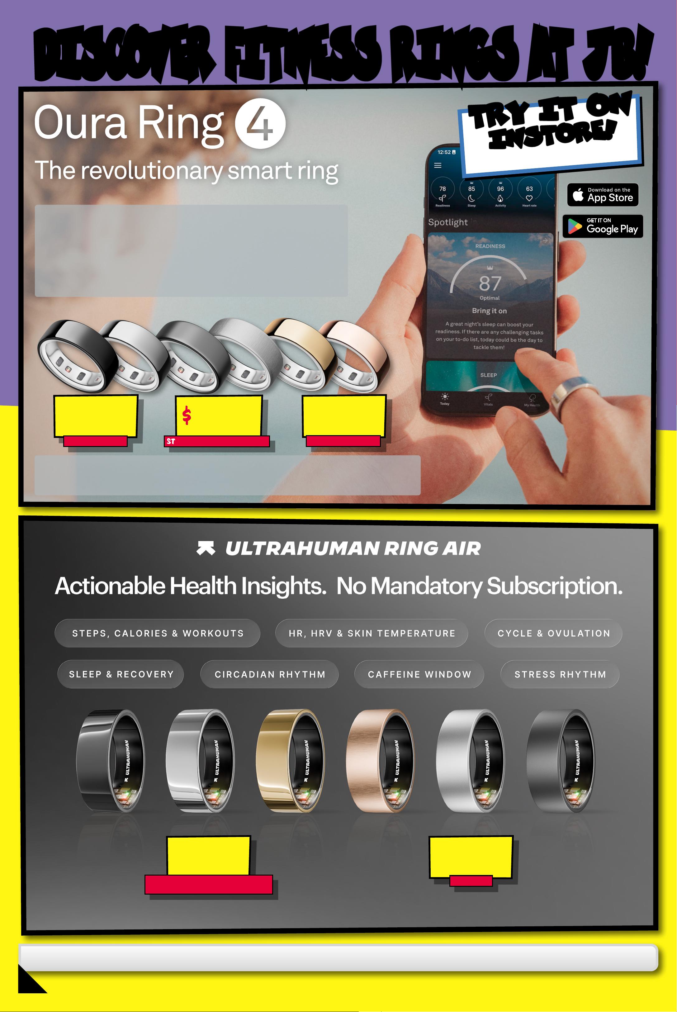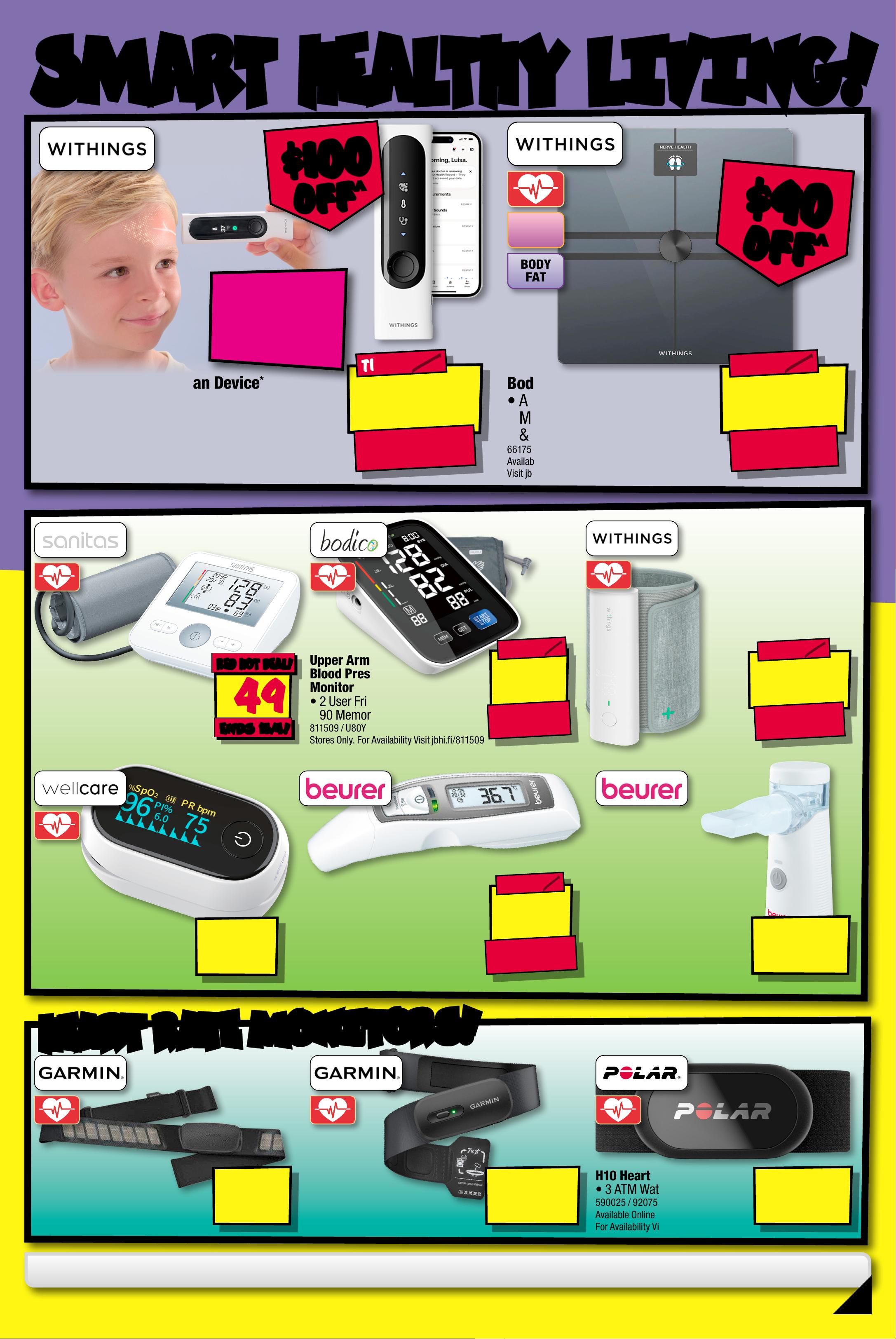 $ 57 $ 12 OFF ^ TI CK E T $ 69 U pp e r A rm B l o o d Pr e s su re Mon i t or • 2 U s e r F r i endly Wit h 9 0 M e m o r y Records 81 1 5 0 9 / le OnlU 8 0Y Availab ine & S elec te d S t o r e s O n l y . F o r A v a il a b ili t y V i s i t j b h i . fi / 8 1 1 5 0 9 $ 143 $ 36 OFF ^ TI CK E T $ 179 Connec t Wireless Upp er A rm Bl ood Pressu r e Monitor * • Re sult s A ppea r Ins ta ntl y On Scr e en Vi a Ea sy- To-R ead Colour - Coded Feedba ck . 4052 61 / WPM-05- AU Available Online & S el ect ed S to res O nl y. For Ava ilabilit y V isi t jbhi .fi /40 52 61 $ 49 Pulse Oximeter * • Measurement Of S pO ², Puls e Rat e & Per f usio n In dex 8 4 5 17 2 / AO J70B Available O nlin e & Se lec ted S to res Only . For Availa bili t y Vi sit j bhi.fi / 84 5172 $ 49 $ 30 OFF ^ TI CK E T $ 79 Multi Funct ion Digit al Thermome ter * • Measures Fore head & E ar Te mper at ures & S ur fac e T empe rat ures O f Ob j ect s & Liquids 48 8 647 / F T65 Av aila ble O nlin e & Se l ected Stores Only. F or Availability Visit jbhi.fi/488 647 $ 129 Rechargeable Nebulis er * • He lps Relie ve Co lds, A st hma & Other Re spiratory Diseases • In cludes M esh A to mis er With Medicatio n C ont ainer , Mout hpi ece, A dult & C hild M ask s & A St ora ge Bag 8 12 8 7 3 / IH 51 Available Online & S el ect ed S to res O nl y. For Ava ilabilit y V isi t jbhi .fi /8127 83 $ 99 HRM-Dual Heart Rate Monitor † • 1 ATM Wa ter R ating 393884 / 01 0- 1 2883-00 Ava ila ble O nline & S el e cted Stores Only. Fo r Availabilit y Vi sit jbhi.fi /39 38 84 HE A R T RA TE M ON IT OR S ! HE A R T RA TE M ON IT OR S ! $ 149 H 1 0 H e a r t Rate S en so r † • 3 A T M W a t er Rating 5 9 0 0 2 5 / 9 20 75 957 Av a i l a b le O n l i n e & Sele ct ed S tor e s O n l y. F o r A v a i l a b i l i t y V i sit jbhi .fi /5 90025 † This p rod uct c on ta ins a bu t ton /co in ba t ter y an d is ha za rdo us. K eep ba t ter ies aw ay fr om chil dren ( wh e new or uther the batter y is sed ). B at te rie s can c aus e seve re or f at al inju rie s in 2 hou rs o r les s if swallowed or placed insid tention shoulde any pa r t of t he bo dy. Medi cal a t be so ug it is suspectedht imme diat ely i f t he battery has been swallowed or placed in side any p ar t of t he body. * Always Read The L a bel & F ol low T he Di re c tio ns F or U se. ^ Discounts apply to previous tic kete d /advertis ed price p rior t o the d isc oun t of fer a t the t ime of printing 1 9/03 /2026. A s we neg oti ate, p rod uct s wil l likely h ave be en sol d bel ow ticketed pric/advertised e pri or to t he d iscoun s may dift offer. Price f er at a irp or t st ore s. $ 26 9 $ 90 OFF ^ TI CK ET $ 359 BODY FAT BMI Bod y Comp Scale* • A dvanced Body C omposition M etrics,C ard iovasc u lar Insight s & Nerve Heal th A ss essment 6 6 17 5 8 / WBS 12 - B L AC K Av a i l a b leOnlin e & Sel ec ted S to res O nly. F or Av ail a bilit y V i s i t jb hi.fi/661758 $ $ 90 90 OFF OFF ^ ^ $ 39 9 EA $ 100 OFF ^ T I CK ET $ 499 BeamO 4 -In - 1 Mul tisc a n D ev i c e * • P rovides A Full View Of Your Heart , Lungs & Te m p e r a ture A t Home Or On- T he -G o • Oximeter, S teth oscope, EC G & T emp era tur e Read ings 816 6 2 6 / SC T 02-02 P hon e No t Inc lude d EXPOR T A PDF EXPOR T A PDF OF YOUR REAL- OF Y OUR R EAL- TIME RESULTS TO TIME RESULTS TO SHARE WITH YOUR SHARE WITH YOUR DOCTOR! DOCTOR! $ $ 100 100 OFF OFF ^ ^ $ 149 HRM 2 0 0 M -X L † • 3 ATM Wa ter R ating 795990 / 0 1 0 -1 33 88-00 Available O nlin e & Se lec ted S to res Only . For Availa bili t y Vi sit j bhi.fi / 795990 $ 49 ENDS 15/ 4! ENDS 15/ 4! RED H OT DE AL ! RED H OT DE AL ! Upper Arm Blood Pres sure Monitor * • ArrhyPage contents: Ultrahuman Ring Air [Size 6] (Bionic Gold), Oura Ring 4 [Size 4] (Gold), Oura Ring 4 [Size 4] (Stealth), Oura Ring 4 [Size 4] (Silver), Ultrahuman Ring Air [Size 6] (Rose Gold), Oura Ring 4 [Size 4] (Gold), Oura Ring 4 [Size 4] (Stealth), Oura Ring 4 [Size 4] (Silver),Dev ice N ot I ncl uded $ 59 9 EA AS T ER BL A CK , SPA CE S ILV ER , BI ON IC GO LD, RA W TI TAN IU M, MAT T GR E Y 809286 / UHR A-AG-0 5 Co lou rs & S izes M ay Va r y By S to re. F or Availability V isit jbhi.fi/80 928 6 † Fir st m ont h of O ura M embe rs hip is f ree w ith y our pu rcha se, $ to new me9.99 A UD/mo af terwa rds. Of fer available mber s onl y. Or opt f or th e ann ual prepaid option f o r $109 .9 9 AU D. Memb e rsh ip is ti ed to yo ur ac coun t via t he Ou ra A pp, no t you r ph ysical ring. Members ck Ohip req uired to unlo ura R ing's f ull func tionality and da ta. ^ Discounts apply to previous tickete d/advertised price pr ior t o the di sco unt o f fer a t the t ime o f printing 19/03/20 2 6. A s we neg oti ate, pr have boduc ts w ill likely een s old be lo w ticketed d p/advertise ric e pri or to t he dis co unt o f fer. Pric es may d if fer a t air por t s to res . † TRY IT ON TRY IT ON INSTORE! INSTORE! Selected Stores Only. For Availability Visit jbhi.fi/80879 Get the best sleep of y our li fe Sleep Scor e Don 't just live l onger , li ve h e althi e r Listen to w hat you r hear t is tell ing y ou Put you r stress to th e t est $ 79 9 EA GO LD OR R OS E GOLD 808679 / JZ90-54 21 6- 07 Co lou rs & S izes M ay Va r y By S to re. A vail abl e Onli ne & Se lected Stores Only . For Ava ilabilit y Vi s it jbhi.fi/ 80 867 9 $ 6 49 EA S T EA LTH OR B RU SHE D S ILV ER 808707 / JZ90-54 21 8- 10 Co lou rs & S izes M ay Va r y By S to re. A vail abl e Onli ne & Se lected Stores Only . For Availability Visit jbhi.fi/ 8087 07 $ 56 9 EA BL A CK OR S ILV ER 808692 / JZ90- 5421 7 - 08 Co lou rs & S izes M ay Va r y By S to re. A vail abl e Onli ne & Se lected Stores Only . For Availability Visit jbhi.fi/ 808 692 $ 69 9 ROSE GOL D 829888 / 17 0 7 9 3 Col ou rs & S izes M ay Va r y By S to re. F or Av ai labilit y Visit jbhi.fi/82 988 8 D I SC O V E R F I T NES S R I N G S A T J B ! D I SC O V E R F I T NES S R I N G S A T J B ! 6 Page contents: Polar Loop (Night Black), W