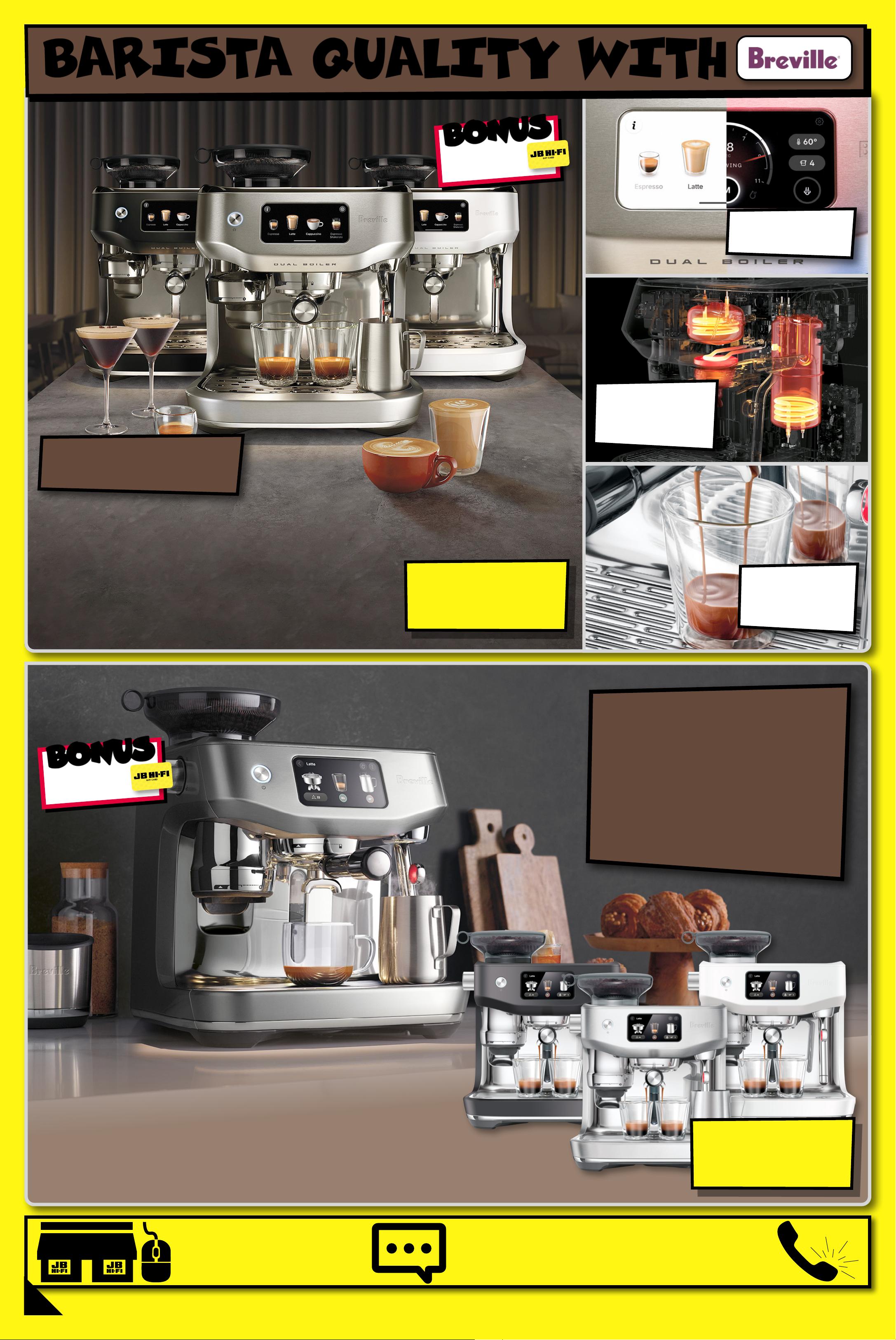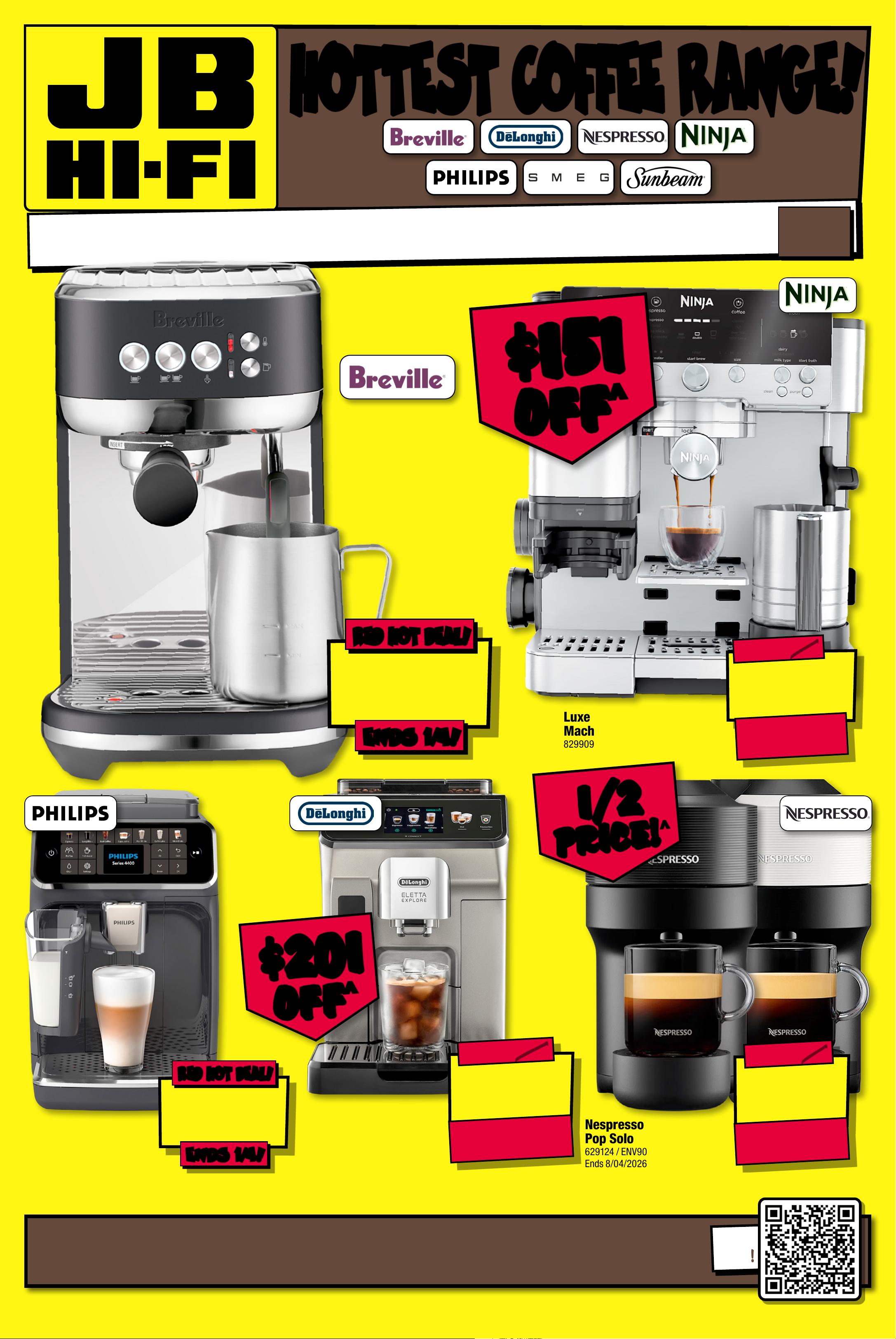 CHECK OUT THE LATEST COFFEE MACHINES, GRINDERS & ACCESSORIES! AVAI LABLE INSTORE & ONLINE! H O T T ES T C O F F E E RA N G E ! H O T TES T C O F F E E RA N G E ! S H O P THE F U LL R ANG E O F H O T T E S T CO F FEE BR AN DS! SCAN HERE ! Starts Thu rsda y 26/0 3/2026, Ends W ednesd ay 1 /04/2026. See P a ge 7 For D et ails . Ap pliances available a t JB H OM E st or es , sel ec te d JB s to re s & o nline at jbhifi.c auom. . Fin d st or es a t j bhifi.com .au/pa ges/s malls-s tores . ^ Disc oun ts a ppl y to pr evi ous ticketed/adverti sed pr ice pr ior t o th e disc oun t of fer a t the tim e of printin g 13/03/2026 . A s we negotiate, product en sos will likely have be ld bel ow tic ket ed/adver pritised price or to t he dis cou nt of f er. Pric es may dif fer at airport stores. $ 999 ENDS 1/ 4! ENDS 1/ 4! RED HO T DE AL! RED HO T DE AL! L at te Go S eri es 4 4 00 Fully Automatic Espr e sso M ach ine 8 1115 9 / EP4441 /20 Bambino Plus Espres so Co f f ee Machin e (Blac k T ru f fle) 33 9030 / BES500BTR $ 98 EA $ 101 OFF ^ T ICK E T $ 199 N e spr e s s o Vertuo P o p S ol o 6 2 9 12 4 / EN V 9 0 BE n d s 8 / 0 4 /20 26 $ 1 59 8 $ 201 OFF ^ T ICK E T $ 179 9 Elet ta Explore C onne ct Full y Au toma ti c C of fee Machine 6269 66 / ECAM45086T Ends 8/0 4/2026 $ 6 48 $ 151 OFF ^ T ICK E T $ 799 L u x e Café E sp res so M a c h ine (Stainless St eel) 82 9 9 0 9 / ES 6 01A N Z $ $ 151 151 OFF OFF ^ ^ $ 49 8 ENDS 1/ 4! ENDS 1/ 4! RED HOT DEAL! RED HOT DEAL! 1/2 1/2 PRICE! PRICE! ^ ^ $ $ 201 201 OFF OFF ^ ^ -