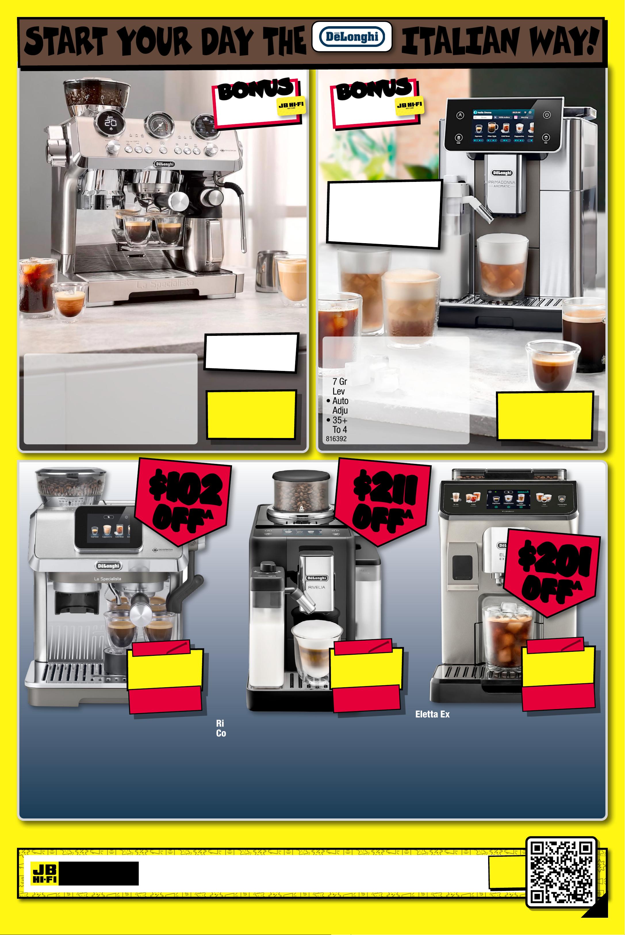 SCAN TO JOIN! W ANT A $10 WE LCOME COU PON? * JO IN J B H I-F I PER KS! * Valid fo r 28 day s from i ssu e. Vis it jbhi fi.com .au /per ks fo r full te rms & co ndit ions PERKS S T A R T Y OUR D A Y T HE IT A L I A N W AY ! Appliance s available at JB H OM E s tor es, s elec te d JB s tor es & online at jbhi fi.co m.au. Find stores at jb hifi.com.au/pages/smal ls-stores. $ 2299 Primadonna Aroma tic Au toma ti c Co f f ee Mac hine • H eat s Up I n Unde r 1 Minut e • 2.2L Wate r T a nk, 5 0 0g B e an Ho pper , 7 G r ind Se t tings , 3 Co f fee Te mperatur e L e v els & 5 Strength Leve ls • A u t o Hot & C old M ilk Sy stem W it h A dj u stable T extur e Levels • 3 5 + Hot & C old D rink O ptio ns, S ave Up T o 4 User Pro file s 8 16 3 9 2 /ECAM 6307 5TM B O NUS B O NUS $200 JB HI-FI GIFT CA RD! † GIVES S MAR T DRINK PR OP OSA L S BASED ON YOUR DAI L Y R OUTINE! † JB Hi- Fi g if t ca rd emailed wi ks othin 2 wee f deli ver y or in store collection of online p urc has es. J B Hi -F i gif t c ar d given a t time o f purc has e for instore purch a ditionse s. Gi f t Ca rd su bjec t to Terms an d Co n s available at jbhifi.com.au /gif tc ard terms ^ Discount s appl y to pr evio us t icket riced/adver tised p e pri or to t he dis cou nt of f er at t he time of printing 1 3/ 03 /2026. A s we neg oti ate, p rod uct s will l ikely h ave bee n sol d belo w tic kete d /adv er to ttised price prior he dis co unt o f fer. Pric es may d if fer a t air por t s to res . $ 1 39 9 L a Spe cia lis ta M aes tr o 2.0 Co ld Br ew Man ual C of f e e Mach ine • H eat s Up I n 20 S eco nd s • 2. 5L Wa ter T ank , 25 0g B ean H opp er , 15 G r i n d Set tings, 5 Cof fe e T emp era ture L evels • M anual H ot M ilk St eam Wan d & Au to Fr othin g Milk Ju g • 8 H ot & C old Dr ink Op tion s 754654 / EC 9885M B O NUS B O NUS $100 JB HI-FI GIFT CA RD! † CO LD BRE W IN 5 MINU TE S! $ 1 59 8 $ 201 OFF ^ TI CK E T $ 1799 E l e t t a E x plore Conne ct Full y Au toma ti c Co f f ee Mac hin e • Heats U p In 4 0 Se cond s • 1.8L Wat er T ank , 30 0 g Bea n Ho pper, 13 D i g i t a l Gr ind Se t tings , 4 Co f fee Temperat ure & 5 C of fe e Strength Le vel s • A uto H ot & C old M ilk Sy stem W it h Adju st able T exture Set tings • 4 0 + Hot & C old D rink O pti ons, P lus S ave Up To 4 User Pr ofi les 62 6966 / ECAM45086T En ds 8/04/2026 $ $ 201 201 OFF OFF ^ ^ $ 12 8 8 $ 211 OFF ^ TI CK E T $ 1499 R i velia B ean To Cup Co ffee Machi ne • Heats U p In 4 0 Se cond s • 1.4L Wate r T a nk, 2 x 2 50 g Be an Ho pper, 5 Grind Se t tings , 3 Co f fee T emper at ure & 5 Coffee Strength Le vels • A uto H ot M ilk Sy stem W it h 3 T ex t ure L evels • 16 Hot & C old D rink O ptio ns, P lus S ave Up To 4 User Pr ofi les 67702 0 / EX AM44 055B End s 8/04/2026 $ 997 $ 1 02 OFF ^ TI CK E T $ 1099 L a Spe cia lis ta Touch Manual Cof fee Machi ne • H eat s Up I n 40 S e conds • 1.8L Wat er T ank , 25 0g B ean H opp er , 1 5 Gr ind Set ting s, 4 Cof f ee T e mpera tur e Levels • A uto H ot M ilk St eam Wan d Wi th 4 Milk Temperat ure & 5 T ex t ure L evels • 7 H ot & C old Dr ink Op tion s 7 9 6 7 17 / EC 9455M Ends 8/04/2026 $ $ 211 211 OFF OFF ^ ^ $ $ 102 102 OFF OFF ^ ^ 3 -