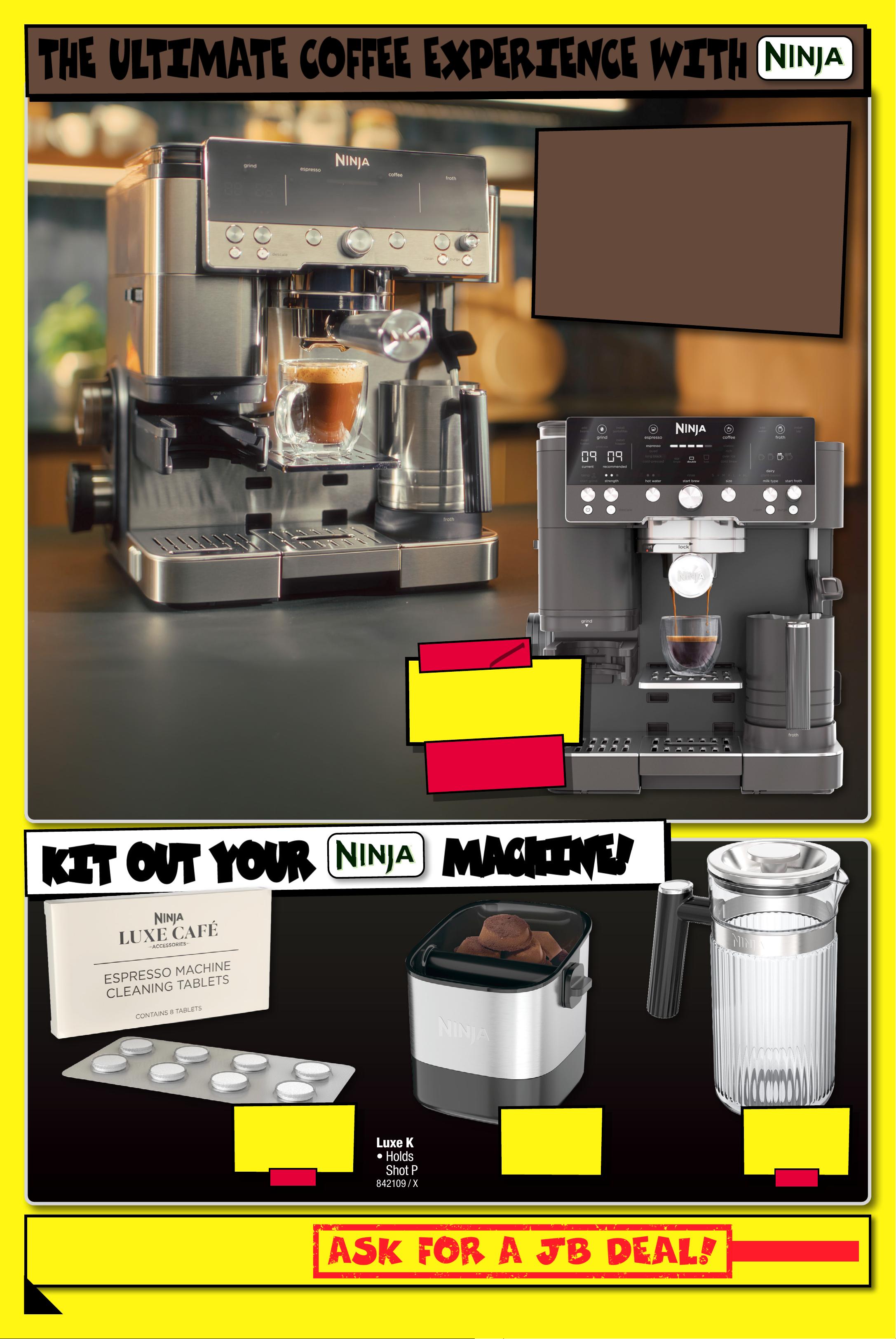SE EN IT C HE A PE R ? INSTOR E | ONLINE E xclud es J B Hi- Fi M ar ket plac e Pr oduc t s T HE UL T I MA TE C OF FE E E XP ERIE N C E WIT H Appliance s available at JB H OM E s tor es, s elec te d JB s tor es & online at jbhi fi.co m.au. Find stores at jb hifi.com.au/pages/smal ls-stores. $ 49 L u x e K no ck Box • H o l d s Up T o 1 0 Dou ble S h o t P ucks 8 4 2 10 9 / X SKKNOCBO XANZ KI T OU T YO UR KI T OU T YO UR M AC H IN E ! M AC H IN E ! ^ Dis coun ts a ppl y to previous ticketed/ad to tvertised price prior he dis co unt o f fer at t he ti me of pr inting 13/0 3/ 20 26. A s we neg oti ate, p ro duc ts w ill likel y have be en so ld bel ow ti cketed/adver tised pr ice p rio r to t he dis coun t of f er. Price s may di f fer a t airp or t s tor es. $ 648 EA $ 15 1 OFF ^ T ICK ET $ 799 Lu xe Café E spr esso M ac hine (St ainless S t eel) • H eats Up I n 4 M inut es • 1 5 Bar , 2.0L Water T ank , 34 0g R emovable Bea n Hopp e r, 25 Grind S et tings, 3 Co f fee T emperatu re Levels, Plus 3 Esp resso Strengths (Sin gle, Doubl e & Quad) • M anual Milk Steam Wand Wit h 4 T exture L evels (I ncludi ng Cold F oam) • 1 5 Drink Options 8299 09 / ES6 01A N Z • MAKES ESPRESS O, COLD BREW • MAKES ESPRESS O, COLD BREW & FIL TER C OFFEE & FIL TER C OFFEE • GRIND SIZE RECOMMENDA TIONS • GRIND SIZE RECOMMENDA TIONS WI TH BU IL T IN SCAL E WI TH BU IL T IN SCAL E • D AIRY & PLANT-B A SED MI LK • D AIRY & PLANT-B A SED MI LK TE X T URING, INC LUDING CO LD FOA M TE X T URING, INC LUDING CO LD FOA M • ACCOMMOD ATE S 20CM T ALL • ACCOMMOD ATE S 20CM T ALL GLASS/BO T TL E GLASS/BO T TL E $ 44 825ML Lux e Cafe 82 5ml Pi tc her • F it s Unde r Ninja Lu xe Cafe P remie r Espr e sso M achine • C an H old H ot Or Co ld Be verage s 842 11 0 / XSKSH ARPITANZ $ 24 . 99 8 PACK Lu xe Ca fé E sp res so M achine Cleaning Tabl ets 8 P ack • Removes Build-U p 8 4 2 113 / XSKCLENTABANZ 4 -