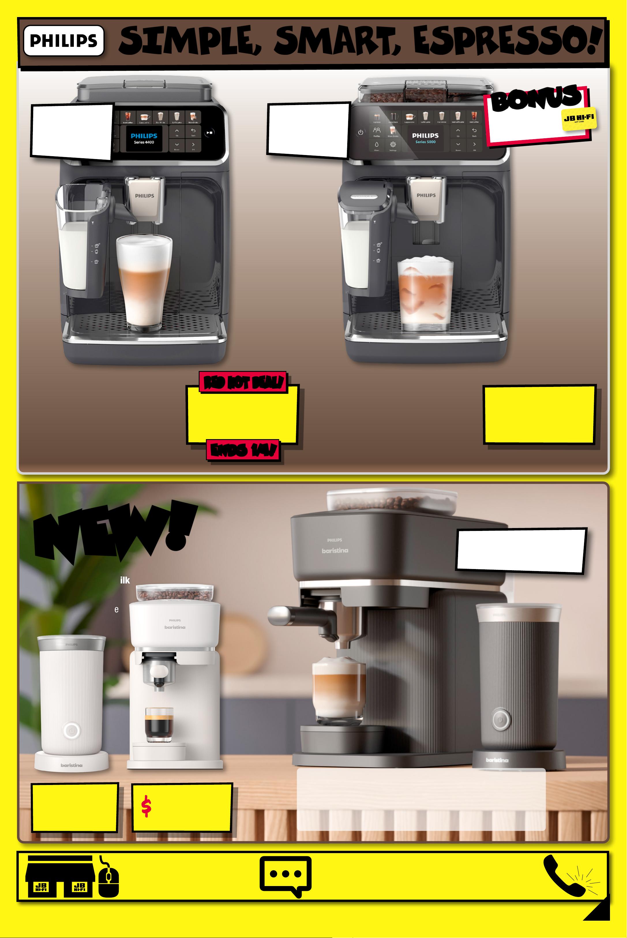 L I V E CH A T LI VE C H A T o r o r CAL L 13 52 44 CALL 1 3 52 4 4 MON - FRI 9 MON - FRI 9 am am to to 8 8 pm pm | SAT - SUN 9 SAT - SUN 9 am am to to 6 6 p m pm SHOP INSTORE SHOP INSTORE & ON LINE & ON LINE SI MP LE , S M A RT , E SPRE SS O ! Appliance s available at JB H OM E s tor es, s elec te d JB s tor es & online at jbhi fi.co m.au. Find stores at jb hifi.com.au/pages/smal ls-stores. $ 999 ENDS 1/ 4! ENDS 1/ 4! RED HOT DE AL! RED HOT DE AL! L at te Go S eri es 4 4 00 Fully Aut omatic Espr e sso M ach ine • H eat s Up I n 30 S eco nds • 1.8L Wat er T ank , 275 g Bea n Ca pacit y, 1 2 G rin d Set t ings, 3 C o f fee T empe rat ure Lev els & 5 S tr engt h Lev els , Plus ' E xt ra S hot ' Fun cti on • A uto H ot M ilk Sy stem • S ave Up To 2 User P ro files 8 1115 9 / EP4441 /20 12 HO T & CO LD DRINK OPTIONS! $ 59 9 EA Baristina Espresso M ach ine • Heats U p In 9 0 Se con ds • 1.2L Wa ter T ank , 1 70 g Bea n Hop per, In-B uilt No n-A djus ta ble Grinder • 2 H ot Dr ink Op tion s (E spr es so Or L ungo), P lus 'I nten sit y B oos t ' Funct ion 886203 / BAR300/60 SWIPE RIG HT FO R THE PERFECT BREW! N E W! N E W! $ 1 49 EA Bar is tina H ot & C ol d M il k Frothe r • 120ml C apac it y • 2 M inute F rot hing T im e 886205 / B A R3 11 / 6 0 † JB Hi- Fi g if t ca rd emailed wi ks othin 2 wee f deli ver y or in store collection of online p urc has es. J B Hi -F i gif t c ar d given a t time o f purc has e for i nst ore p urch ases. Gi f t Ca rd sub jec t to Terms an d Co nditions available a t jbhifi.com. au/gif tc ardt erms $ 1 39 9 L at te Go F ully A ut o E spres so Machine • Heat s U p In 3 0 Se cond s • 1.8L Wat er T ank , 275 g Bea n Ca pacit y, 1 2 Gri nd Se t tings , 3 Cof fee T emperature Level s & 5 St reng th L evels, P lus 'E x t ra Shot ' Funct ion • A uto H ot M ilk Sy stem • S ave Up To 4 User P ro files 815 6 47 / EP5541 /20 B O N US B O N US $100 JB HI-FI GIFT CA RD! † 20 HOT & CO LD DRINK OPTIONS! 5 -