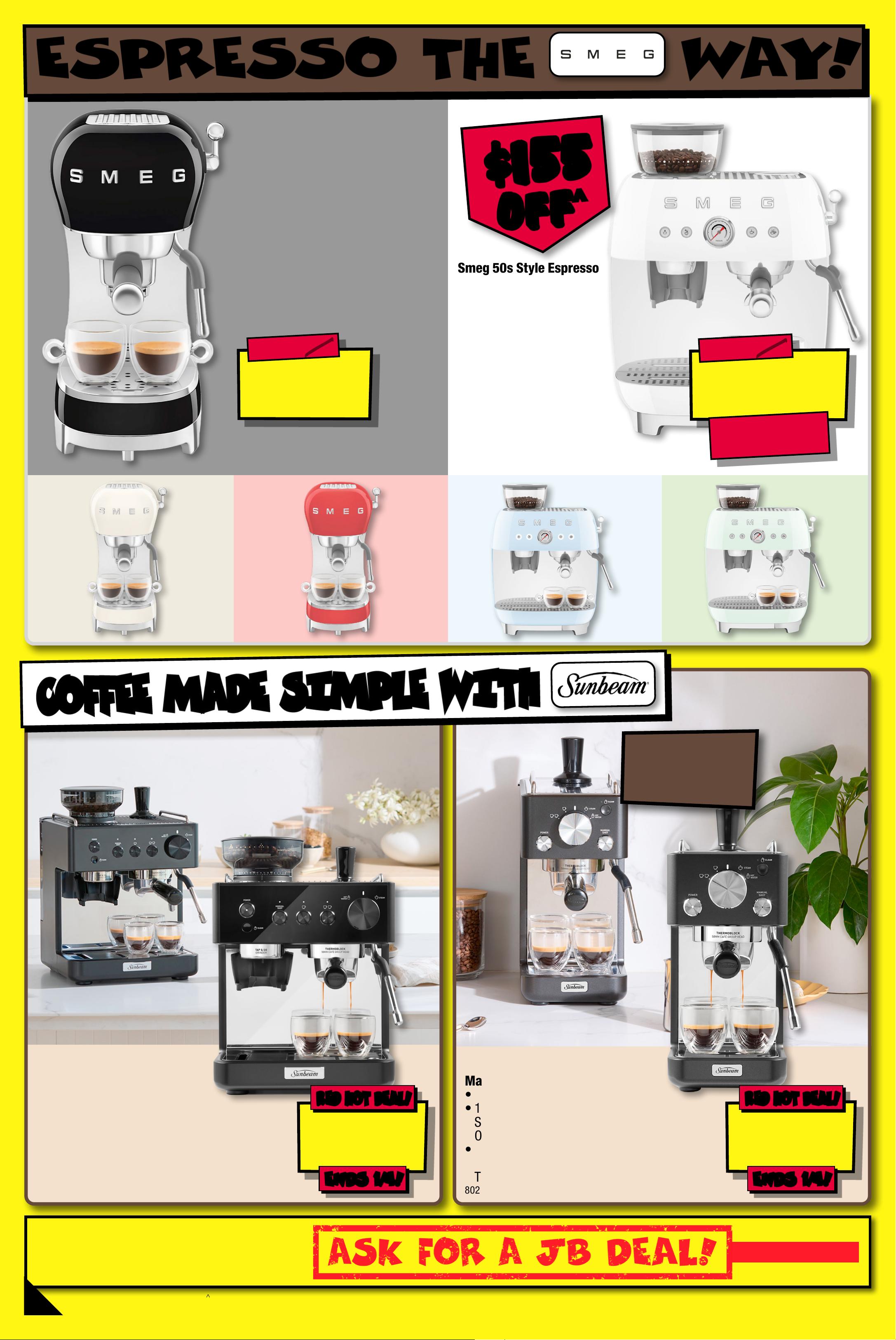 $ 27 7 EA ENDS 1/ 4! ENDS 1/ 4! RED HO T DE AL! RED HO T DE AL! Origins Slimlin e Esp resso M a chine (Black) • Heats U p In 1 Minu te • 1 .1 L Wate r T a nk, 2 E spr es so S treng th s (Singl e Or Do ubl e) O r Manual E x t rac t ion • M anual H ot M ilk St eam Wand W it h 4 Milk T em pera tur e Levels 8 0 2 757 / EMM4500BK PERFECT PERFECT FOR SMALL FOR SMALL KIT CHENS! KIT CHENS! E SPRE SS O TH E WA Y ! Appliance s available at JB H OM E s tor es, s elec te d JB s tor es & online at jbhi fi.co m.au. Find stores at jb hifi.com.au/pages/smal ls-stores. ^ Dis coun ts a ppl y to previous ticketed/ad to tvertised price prior he dis co unt o f fer at t he ti me of pr inting 13/0 3/ 20 26. A s we neg oti ate, p rod uct s will l ikely h ave bee n sol d belo w t icketed rice p/advertis ed p rio r to th e disc oun t of fe r . Pr ice s may dif f er at a irp or t st ore s. SE EN IT C HE A PE R ? INSTOR E | ONLINE E xclud es J B Hi- Fi M ar ket plac e Pr oduc t s $ 555 EA T ICK E T $ 599 Sme g 50 s St yl e Es pre s so Machine • H eat s Up I n 40 S ec onds • 1. 1 L Wate r T a nk, 3 C of fee T em pera tur e Levels • M anual H ot M ilk St eam Wand • 4 H ot Dr ink Op tion s 81 124 9 / ECF02B LA U En ds 8/04/2026. Black & Whit e Ava ilab le In store & Onl ine. A ll Ot her Colours Available Online Only C OF FE E M A DE SI M P L E WI T H C OF FE E M A DE SI M P L E WI T H $ 555 EA ENDS 1/ 4! ENDS 1/ 4! RED HO T DE AL! RED HO T DE AL! Sunbeam Origins Clas sic Espresso Machine (Black) • H eat s Up I n 90 Sec onds • 1.8 L Water Tank, 2 20 g Removable Bean Hopp er, 30 Gr ind Se t ting s, 2 Es pres so S tr engt hs (S ingle Or Doubl e) Or M anua l E xt ra ct ion • M anual H ot M ilk St eam Wan d Wi th 4 Milk T emper at ure Leve ls 802758 / EMM5500BK $ 1044 EA $ 155 OFF ^ T ICK E T $ 1199 S m e g 5 0 s S t y l e E s p r e s so Mac hine W it h Gr ind er • Heats U p In 9 0 Se con ds • 2. 4L Wat er T ank , 25 0g Bea n Ho pper, 1 0 G ri nd Se t tings , 4 Co f fe e T em pera tur e Levels • M anual H ot M ilk St eam Wand W it h 2 T ex tu re Leve ls • 2 H ot Dr ink Op tion s 8 112 8 6 / EGF 03WHA U Ends 8/0 4/20 26. Bla ck & W hit e Av ailable Instore & On line. A ll O th er C olo urs Available Online Only $ $ 155 155 OFF OFF ^ ^ 6 -