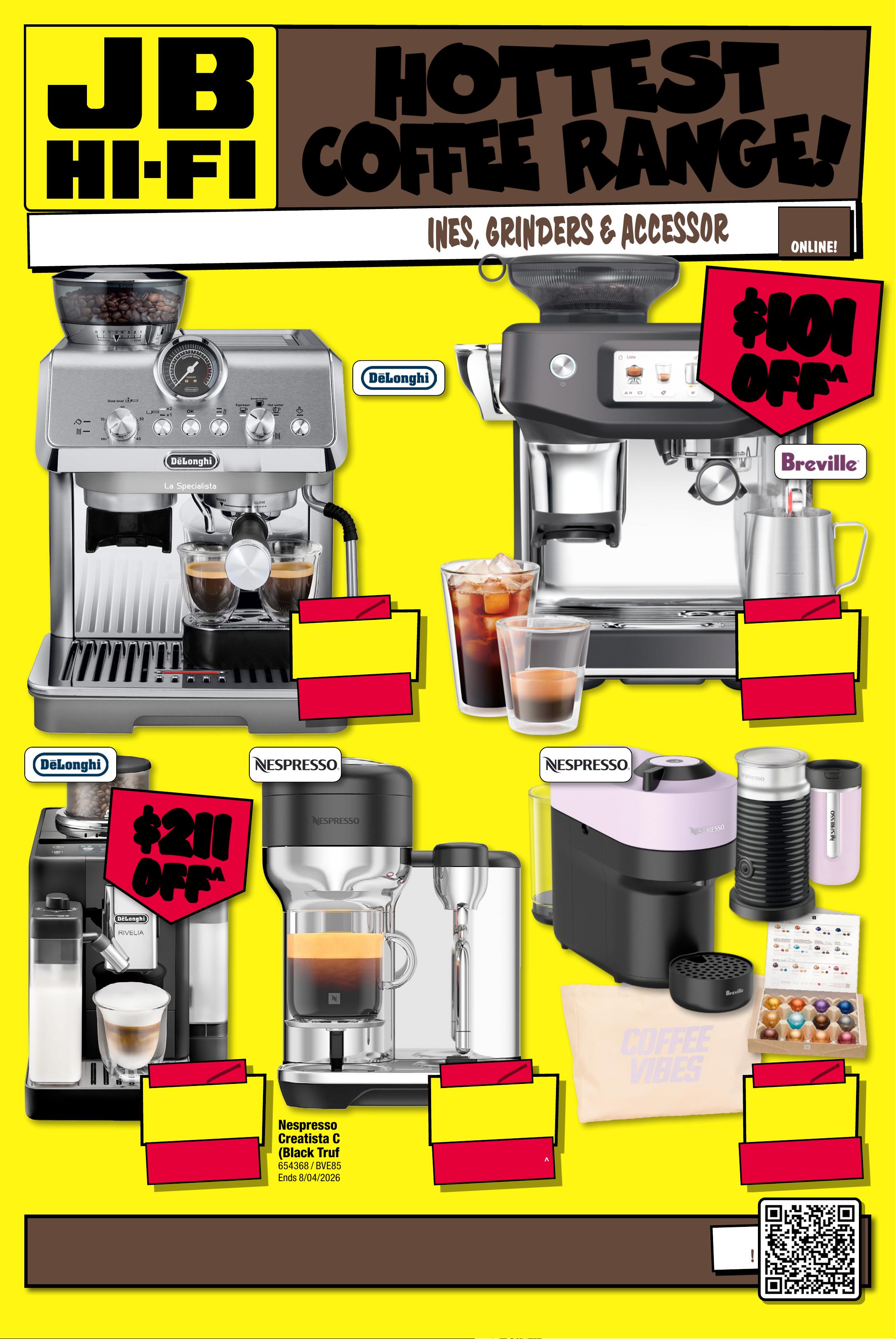 CHECK OUT THE LATEST COFFEE MACH INES, GRINDERS & ACCESSOR IES!AVAI LABLE INSTORE & O NL I NE ! H O T T E ST H O T T E ST C O F F EE R AN GE! C O F F EE R AN GE! S H O P THE F U LL R ANG E O F H O T T E S T CO F FEE BR AN DS! SCAN HERE ! $ 59 8 $ 101 OFF ^ T ICK E T $ 699 $ 74 7 $ 152 OFF ^ T ICK E T $ 899 N e spr e s s o Vertuo C re a t i s t a C of f ee M ach in e ( B la c k T r u f fle) 65 4 36 8 / BV E 8 5 0BTR4IA N1 E n d s 8 / 0 4 /20 26 Applianc es available at JB H OM E st or es , selected JB stores & o nline at jbhifi.co m. jbhifi.comau . Fin d st or es a t .au/pages /smalls- stor es. ^ Discounts apply to previous tickete d/advertised price pr ior t o the di sco unt o f fer a t the t ime o f printing 1 3 /03/ 202 6. A s we neg oti ate, pr y have boduc ts w ill likel een s old be l ow ticketed ed pr/advert is ice pr ior t o th e disc oun t of fer. Pr ice s may dif f er at a irp or t st ore s. $ 19 7 $ 1 02 OFF ^ T ICK E T $ 299 Nespresso Vertuo Pop Bun dle S ta rt er S et ( L il ac) 8 9 316 1 / B NV1 50LIL 4IAN3 Ends 8/0 4/2026 $ 12 8 8 $ 21 1 OFF ^ T ICK E T $ 1499 Rive lia B ean To Cup Coffee Ma chi ne 677 020 / EX AM4 4055B Ends 8/0 4/2026 $ $ 211 211 OFF OFF ^ ^ $ $ 101 101 OFF OFF ^ ^ $ 1 89 8 $ 101 OFF ^ T ICK E T $ 1999 Th e Bari st a Touch ™ I mpre ss ( Bl ack Truf fl e) 7963 57 / BES881 BTR 2IAN2 La Sp ecialis ta Ar t e Ev o Manual Wi th C old Br ew Coffee Ma chi ne 626968 / EC9255M Ends 8/0 4/2026