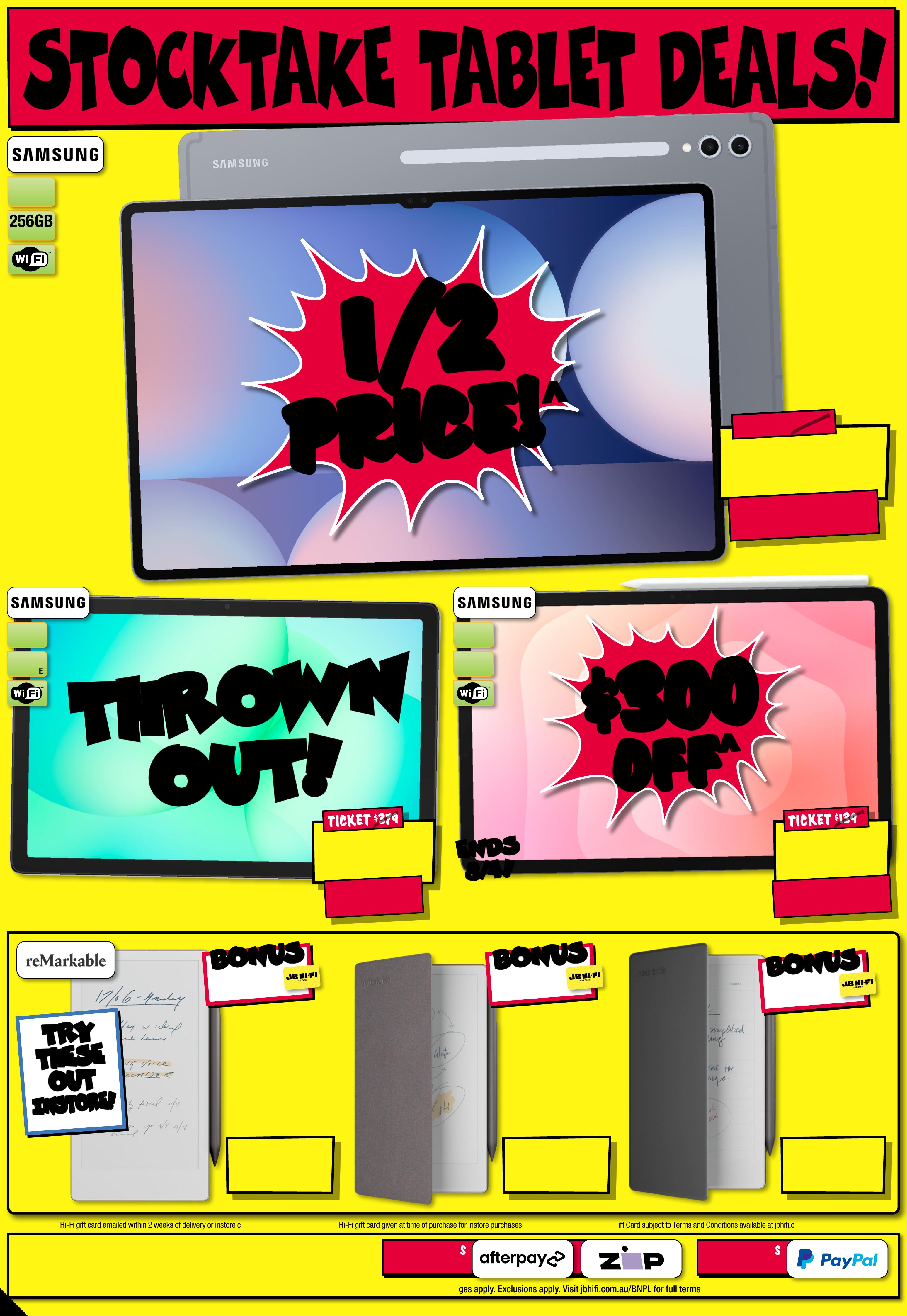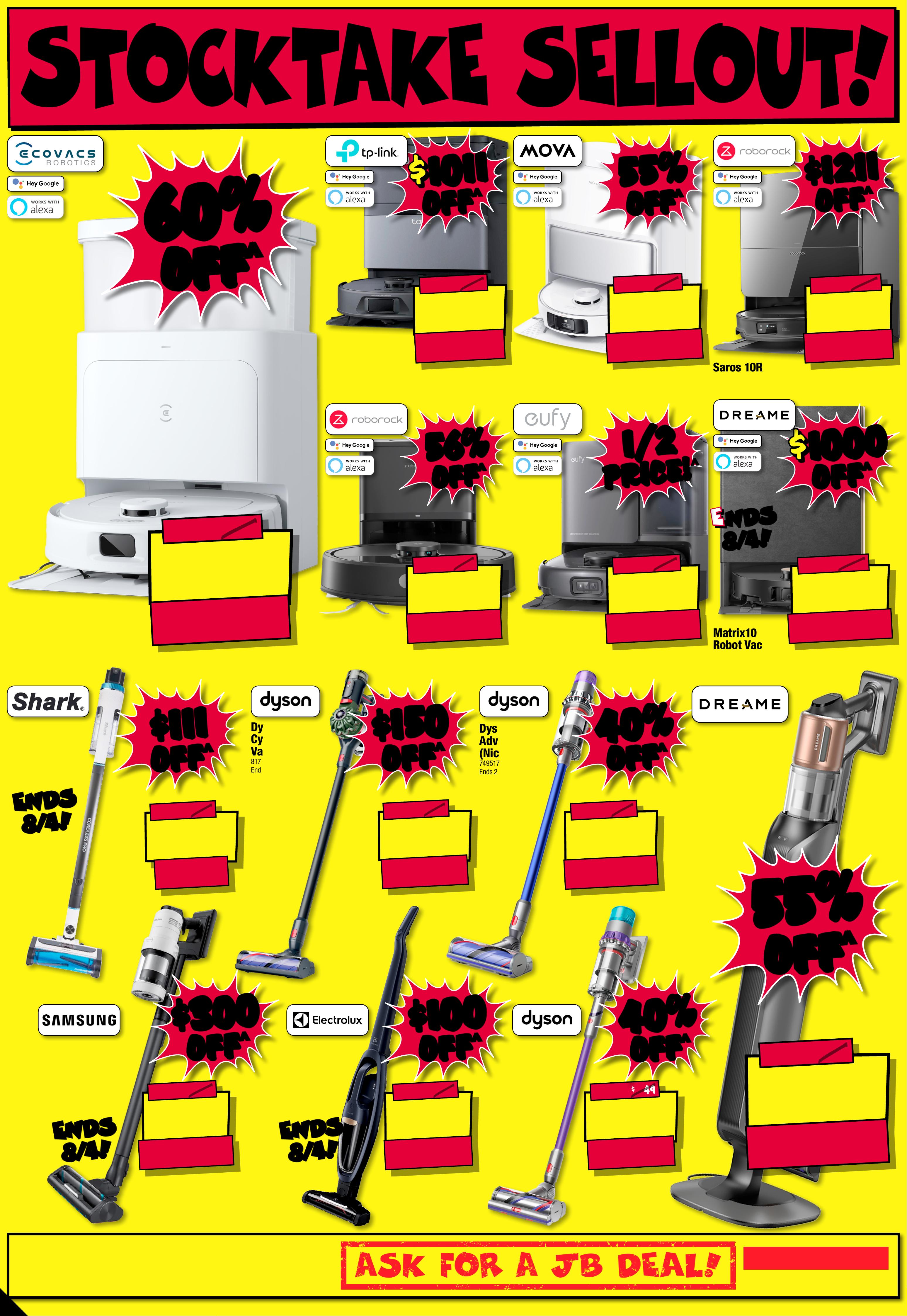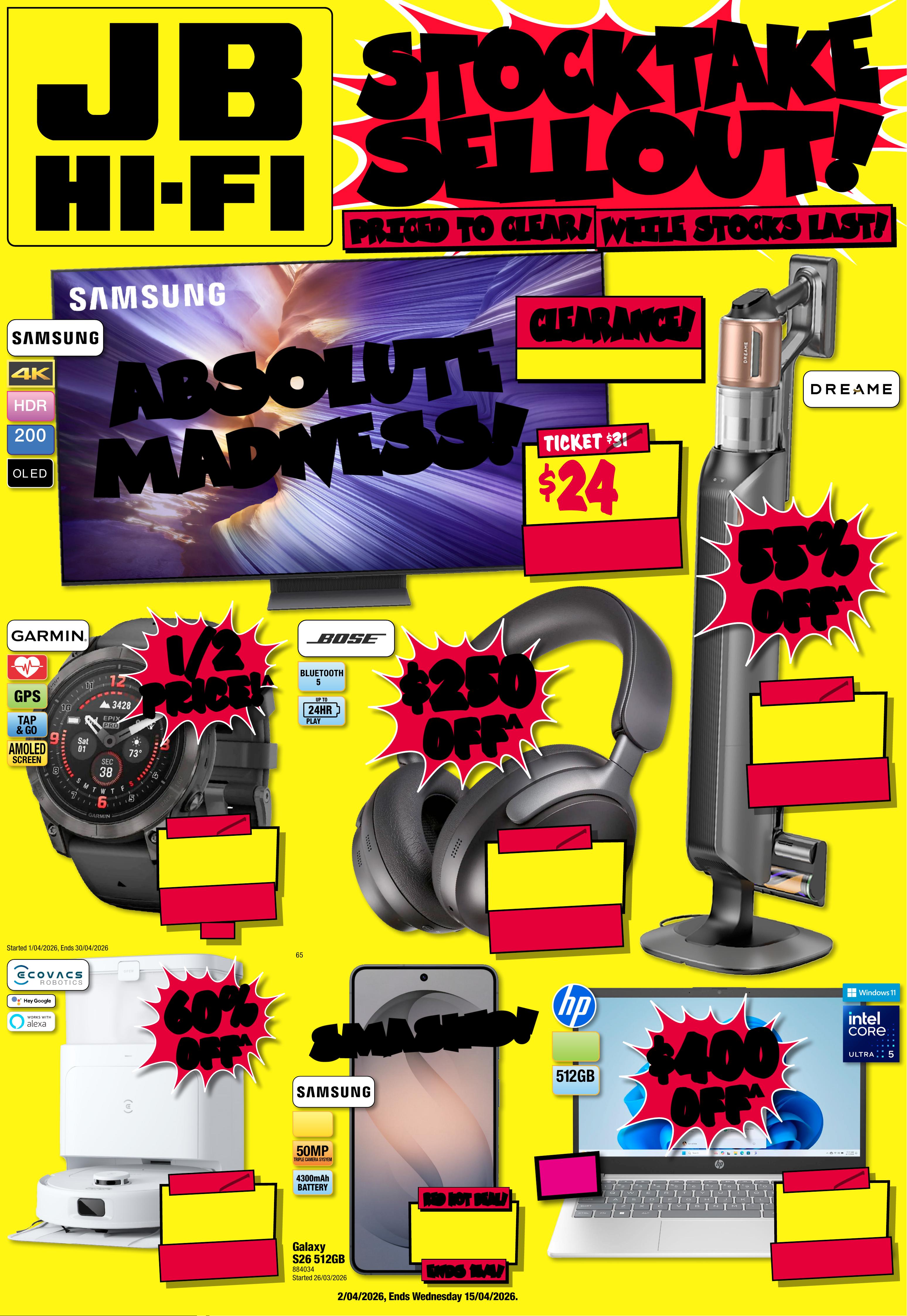 JB7 498_ JBHIB E08 4 1 _S tocktake Sellout_PP1 289( W ) x 40 5(D )mm – PRO OF 8 CHANGES BEYOND PROO F 3 WILL B E CHARGED EX TRA. Starts Thu rsda y 2 / 0 4 / 2 0 2 6, E n ds W e d n e s d a y 1 5 / 0 4 / 20 26 . SeePa ge 31 F or Conditions . ^ Dis coun ts app ly t o previous tick eted/ adver tised price pri or to t he dis coun t of fer at t he time of printing 1 9/0 3/2026. A s we nego tia te, pro duct s will lik ely have b een sol d below t icketed/advert ised p rice pr ior t o the d iscoun t offer . Price s may d if fer at ai rpor t s tore s. S T O C K TA K E S T O C K TA K E S E L L O U T! S E L L O U T! $ 3 59 $ 440 OFF ^ T ICK ET $ 799 55 55 % % O FF O FF ^ ^ Station Cordless Sti ck V acuu m Cle aner W i th Self Empty Hub 8 174 6 0 / DRE-Z20S $ 84 9 $ 85 0 OFF ^ 47MM T ICK E T $ 1699 AMOLED SCREEN Epix ™ Pro (Gen 2) Sa pphire Edition Smar t watch 652378 / 010 - 0 2 8 0 3 -12 S t a r ted 1 / 0 4 /20 26 , E n d s 3 0/ 0 4 /20 26 $ 39 9 $ 25 0 OFF ^ T ICK E T $ 649 PLAY TIME!UP TO 24HR 5 .3Qui etComfort Ult ra N oise Canc elling Head phones ( Gen 1 ) 6 5 9955 / 880066-0 1 00 $ $ 250 250 OFF OFF ^ ^ $ 1 549 ENDS 15/ 4! ENDS 15/ 4! RED HOT DEAL! RED HOT DEAL! 4300mAh BA TTER Y 50MP TRIPLE C AMERA SYSYEM 6.3" FHD+ DISPLAY G al a x y S 2 6 5 12 G B 8 8 40 34 S t a r t e d 26 / 0 3 /20 26 S M A S H E D! S M A S H E D! $ 1 0 99 $ 400 OFF ^ T ICK E T $ 1499 5 1 2 G B SSD RAM 24GB 1 4" Notebook 84 0501 / CK0R0P A#ABG 24GB 24GB RA M! RA M! $ $ 400 400 OFF OFF ^ ^ $ 599 $ 90 0 OFF ^ T ICK E T $ 1499 60 60 % % OFF OFF ^ ^ DEE BOT N30 Pr o OMNI Rob ovac 7824 4 8 / N3 0 PRO O MN I W T $ 24 6 1 $ 7 30 OFF ^ T I CK E T $ 3 1 91 O L E D 200 MOTION RATE 65" 4K Sm art AI OL ED TV 804840 / QA 65S 90FA EX X Y A B S O L UT E A B S O L UT E M A D N E S S! M A D N E S S! 1/2 1/2 PRICE! PRICE! ^ ^ C LE A R A NCE ! C LE A R A NCE ! UNT IL SOLD OU T ! PRICED TO CLEAR! PRICED TO CLEAR! WHILE STOCKS LAST! WHILE STOCKS LAST! -