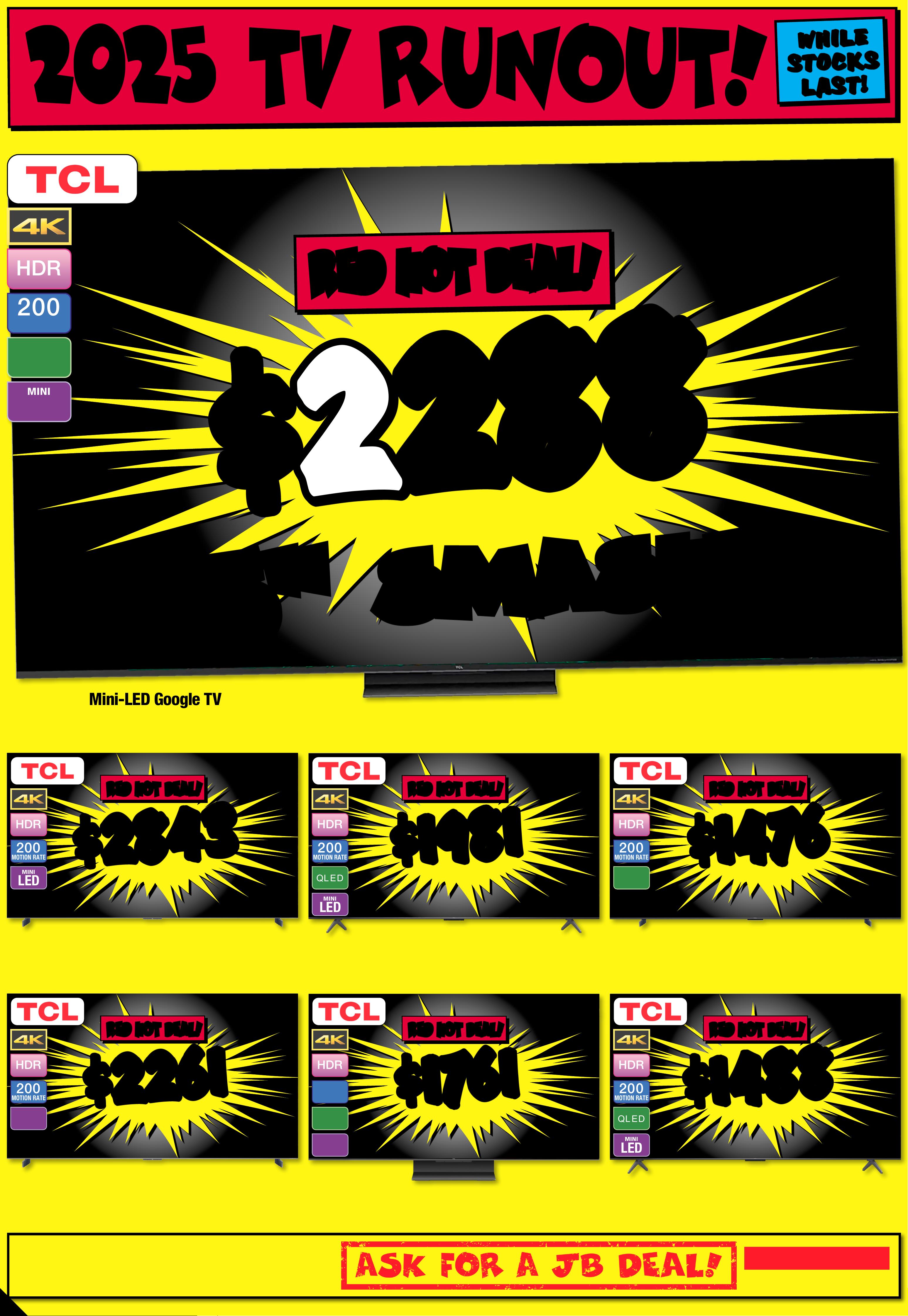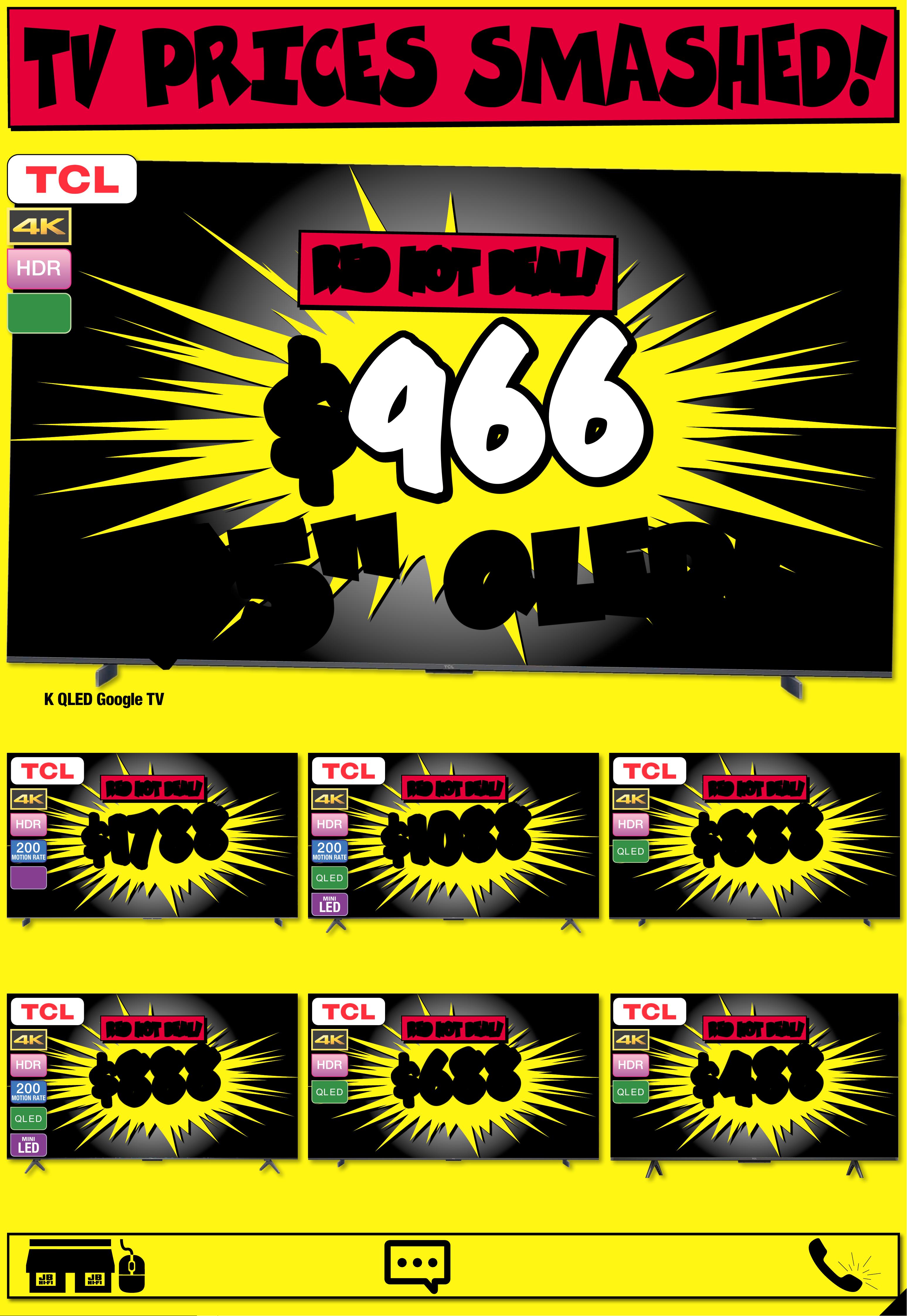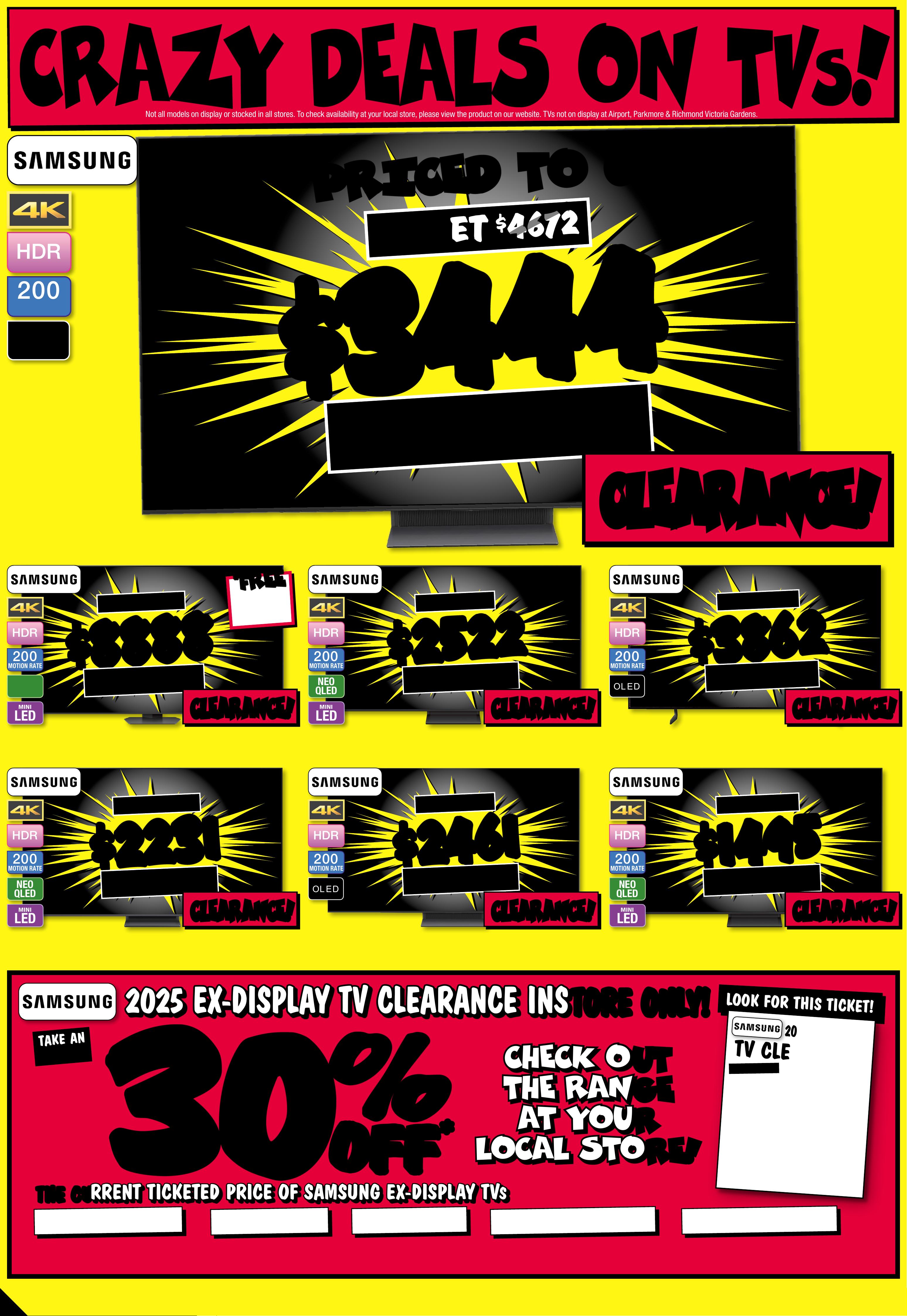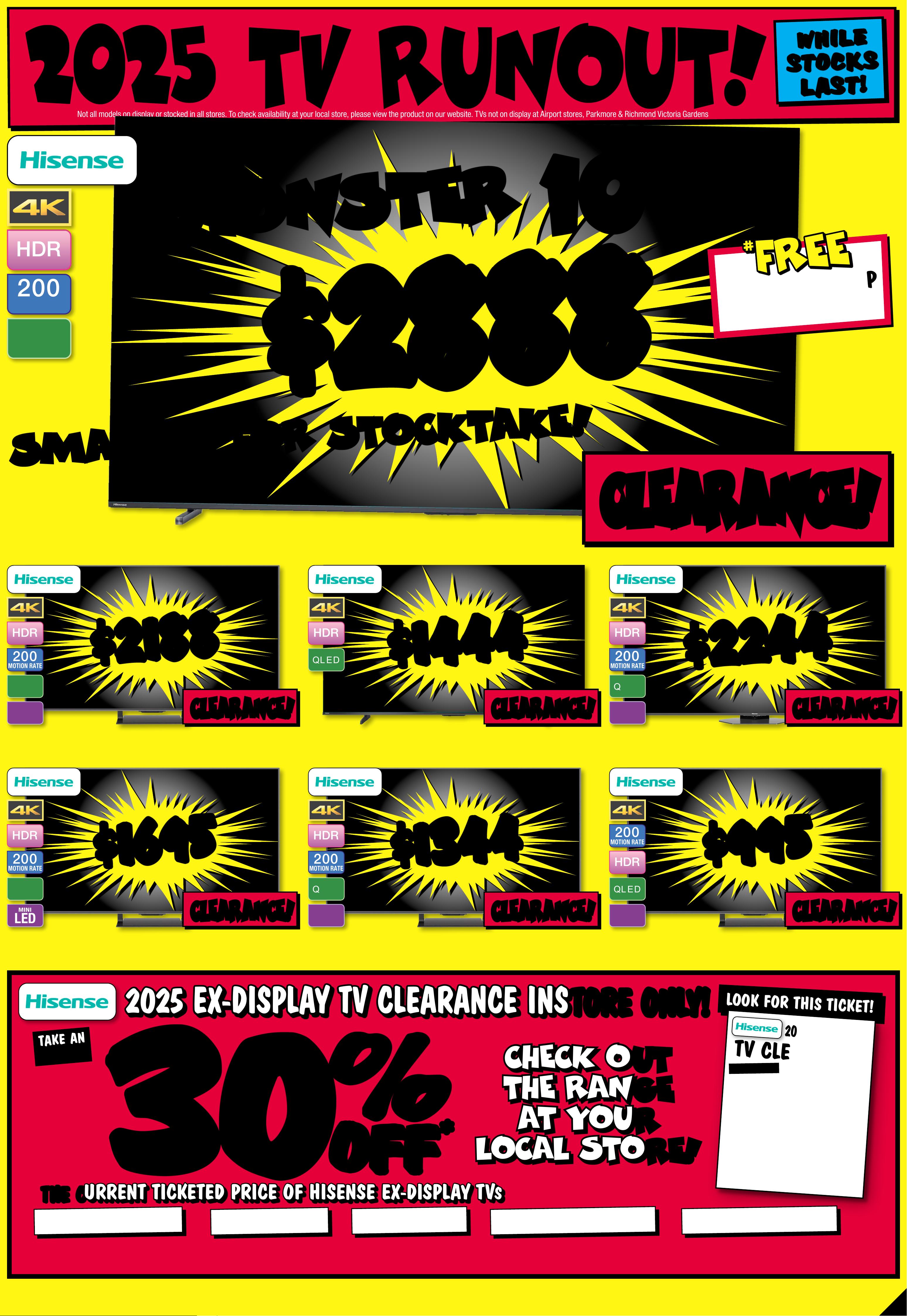 JB7 498_ JBHIB E08 4 1 _S tocktake Sellout_PP2 289( W ) x 4 05(D) mm – PRO OF 5 CHANGES BEYOND PROO F 3 WILL B E CHARGED EX TRA. C R A Z Y D E A LS O N T V s ! N o t a l l m o d e l s o n d i s p l a y o r s t o c k e d i n a l l s t o r e s . T o c h e c k a v a il a b ili t y a t y o u r l o c a l s t o r e , p l e a s e v i e w t h e p r o d u c t o n o u r w e b s i t e . T V s n o t o n d i s p l a y a t A i r p o r t , P a r k m o r e & R i c h mo n d V ic t o r i a G a r den s . $ $ 8888 8888 T ICK E T $ 9995 $ 1 1 0 7 OFF ^ LED MINI 200 MOTION RATE NEO QLED 98" 4K Ne o QLE D Smart A I Mini LE D T V • NQ 4 AI G en2 Process or •Glare F ree 8 048 32 / QA98QN90FAWXX Y # # FR EE FR EE DELI VERY SE T- UP & CONNECT! $ $ 25 2 2 25 2 2 T ICK ET $ 31 16 $ 59 4 OFF ^ LED MINI N EO Q L ED 200 MOTION RATE 85" 4K Ne o QLE D Smart A I Mini LE D T V • NQ 4 AI G en2 Process or •Quan tum Matrix T e chnology 804 826 / Q A85 QN70FAW X X Y $ $ 3 86 2 3 86 2 T ICK ET $ 4612 $ 7 5 0 O FF ^ O L E D 200 MOTION RATE 83" 4K Smar t AI O LED TV • N Q4 A I Gen2 Pro cessor • Exceptiona l D et ail Unve iled 804836 / QA8 3S8 5FAE XX Y $ $ 223 1 223 1 T ICK ET $ 2887 $ 656 O FF ^ LED MINI N EO Q L ED 200 MOTION RATE 75" 4K Neo Q LED Smar t AI Min i LED T V • NQ 4 AI G en2 Process or •Dolby Atmos 804830 / QA75QN85F AWX XY # Se e Page 3 F or De ta i ls. ^ Discounts appl y t edo previ ous tic ket /advertised price pr ior to t he dis count o f fer at t he time of printin g 1 9/0 3/20 2 6. A s we nego tiat e, produ y have bects will like l en sold b el ow ticketed e/advertis d pric e prior t o the di scou nt of fer. Pri ces may di f fer at air por t s tore s. $ $ 149 5 1495 T ICK ET $ 1 74 4 $ 24 9 O F F ^ LED MINI N EO Q L ED 200 MOTION RATE 65" 4K Ne o QLE D Smart A I Mini LE D TV • NQ 4 AI G en2 Process or •Quan tum Matrix T e chnology 80 48 24 / QA 65Q N70FAW X XY $ $ 24 6 1 24 6 1 T ICK ET $ 3191 $ 7 3 0 OFF ^ O L E D 200 MOTION RATE 65" 4K Smar t AI OL ED TV • N Q4 A I Gen3 Pr o •cessor Motion Xc eler ator 144H z 8 04840 / Q A65S 90FA EX X Y $ $ 3 444 3 444 T I CK E T $ 4 67 2 $ 12 28 OF F ^ O L ED 200 MOTION RATE 77" 4K Sm art AI OLE D T V • NQ4 A I Gen3 P rocessor •Motion X celerator 1 4 4Hz 80484 1 / QA 77S9 0FAE X XY 7 7 '' 7 7 '' P RI C E D T O CL E A R! P RI C E D T O CL E A R! C L E A R A NC E ! C L E A R A NC E ! C LE A R A NCE ! C LE A R A NCE ! C LE A R A NCE ! C LE A R A NCE ! C LE A R A NCE ! C LE A R A NCE ! C LE A R A NCE ! C LE A R A NCE ! C LE A R A NCE ! C LE A R A NCE ! C LE A R A NCE ! C LE A R A NCE ! *O f fer st ar ted 19/ 03 /2 02 6 unti l sold o ut. D isco unt is a pplied t o the cu rren t ticke ted pr ice o f ex-disp lay mod els (as ma rked ) ins tor e only. Of fer n ot avai lable o nline. Av ailab ilit y inst ore lim ited a nd subje ct to c hang e, check o nline an d call yo ur loc al st ore to c heck av ailab ilit y. Your lo cal s tore w ill not b e able to a cces s ex-dis play s tock f rom a noth er loc atio n. E x-disp lay mod els ar e in work ing or der bu t have be en disp layed an d used i nsto re for d emon str atio n for si gnifi can t peri ods. M ay have c onsi dera ble scr een ti me, cos metic d amage , missi ng st ands , legs a nd pro duct m anua l, and be s old wi th a 3r d par t y remo te con tro l. May no t come w ith or igina l pack aging o r par ts . Delive ry & in st all co sts m ay be req uired f or som e scre en sizes a nd mod els. 2 0 2 5 E X - D I S P L A Y T V C L E A Page contents: Hisense 85" U7QAU 4K ULED Mini-LED Smart TV [2025], Hisense 85" Q6QAU 4K QLED Smart TV [2025], Hisense 75" U8QAU 4K ULED Mini-LED Smart TV [2025], Hisense 65" U7QAU 4K ULED Mini-LED Smart TV [2025], Hisense 75" U7QAU 4K ULED Mini-LED Smart TV [2025], Hisense 55" U7QAU 4K ULED Mini-LED Smart TV [2025], Hisense 100" Q7QAU 4K QLED Smart TV [2025],JB7 498_ JBHIB E08 4 1 _S tocktake Sellout_PP3 289( W ) x 4 05(D) mm – PRO OF 3 CHANGES BEYOND PROO F 3 WILL B E CHARGED EX TRA. *O f fer st ar ts 2 / 04 /2 02 6 until s old ou t. Di sco unt is ap plied t o the cur ren t ticke ted pr ice of ex- displ ay mode ls (as ma rked ) ins tore o nly. Of fer n ot avail able o nline. Av ailabi lit y inst ore limi ted an d subje ct to c hange, c heck o nline an d call yo ur loc al st ore to c heck ava ilabi lit y . Your lo cal s tore w ill not b e able to a cces s ex-dis play s tock f rom a noth er loc atio n. E x-disp lay mod els ar e in work ing or der bu t have be en disp layed an d used i nsto re for d emon str atio n for si gnifi can t peri ods. M ay have c onsi dera ble scr een ti me, cos metic d amage , missi ng st ands , legs a nd pro duct m anua l, and be s old wi th a 3r d par t y remo te con tro l. May no t come w ith or igina l pack aging o r par ts . Delive ry & in st all co sts m ay be req uired f or som e scre en sizes a nd mod els. 2 0 2 5 E X - D I S P L A Y T V C L E A R A N C E I N S TOR E O NL Y ! 2 0 2 5 E X - D I S P L A Y T V C L E A R A N C E I N S TOR E O NL Y ! TH E C U R R E N T T I C K E T E D P R I C E O F H I S E N S E E X - D I S P L A Y T V TH E C U R R E N T T I C K E T E D P R I C E O F H I S E N S E E X - D I S P L A Y T V S S TA K E A N EX TRA C H E C K O UT C H E C K O UT T H E R A N GET H E R A N GEA T Y O U R A T Y O U R L O C A L S T O RE! L O C A L S T O RE! 30 30 % % O FF O FF * * L O O K F O R T HIS T IC K E T ! 2 0 25 EX-D ISPLA Y T V C L E ARANCE!THE CURRENT TICKETED PRICE OF HISE NSE EX-DIS PLAY T V S TAKE A N EX TR A 30 % OFF * SINGLE UNITS ONLY! UNT IL S OLD O UT! INSTORE ONL Y! STOCKS V ARY BY STOR E! DI SPL A Y UNITS ONL Y! 20 2 5 T V RU N OU T ! N o t a l l m o d e l s o n d i s p l a y o r s t o c k e d i n a l l s t o r e s . T o c h e c k a v a il a b ili t y a t y o u r l o c a l s t o r e , p l e a s e v i e w t h e p r o d u c t o n o u r w e b s i t e . T V s n o t o n d i s p l a y a t A i r p or t s t ore s, P a r k m or e & R ic h mo n d V ic t o r i a G a r den s $ $ 21 8 8 21 8 8 200 MOTION RATE Q L ED LED MINI 85" 4K