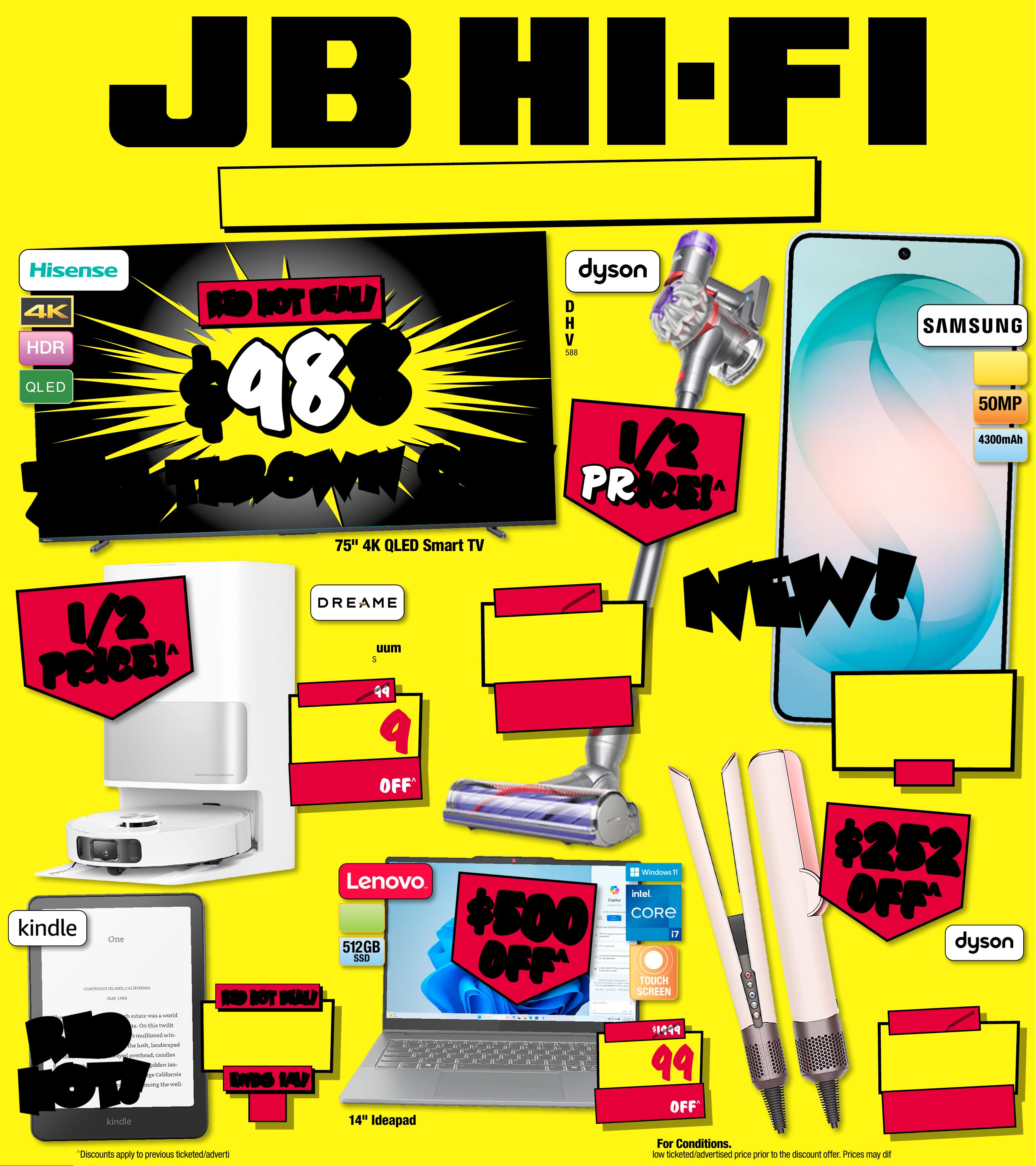 J B 7 4 2 3 _ J B H I B E 0 8 2 5 _ A l w a ys Cheap Pr ices / Smart Home Bonan za_PP1 289( W ) x 320(D)m m – PR O O F 6 CHANGES BEYOND PROO F 3 WIL L BE CHARGED EX TRA . A L W AY S C HEA P PRI C ES! $ 14 9 9 $ 50 0 O FF ^ T ICK ET $ 1 999 5 1 2 G B S S D RAM 1 6GB 1 4 " I d e a p a d 5i 2-In- 1 Notebook 75 4782 / 83KX0009AU $ $ 500 500 OFF OFF ^ ^ 1/2 1/2 PRICE! PRICE! ^ ^ $ 69 9 $ 70 0 O FF ^ T ICK E T $ 13 9 9 L 30s Ul tra Robo tic V ac u u m 8 114 9 6 / DRE-L30U S Starts Thu rsda y 1 9/0 3/2026, Ends Wednesd a y 1 /04/2026. See Pa ge 47 F or C on d i t i on s . ^ D i s c o u n t s a p p l y t or to tho p r e vi o u s t i c k e te d / a d v er t i sed price pri e disc ount o f fer at t he time o f printi ng 5/03/2 026. As we n egot iate , prod uct s will like ly have b een so ld be l o w t ic k e t e d / a d v er t is e d p r i c e p r i o r t o t h e d i s c o u n t o f f e r . P r i c e s m a y d i f fer at a irpo r t sto res. $ 388 $ 41 1 OFF ^ T I CK E T $ 799 D yson V8H andstickV acu um 5 8 8 945/ 394437 - 01 1/2 1/2 PR ICE!PR ICE!^ ^ 32GB $ 299 ENDS 1/ 4! END S 1/4! RED HOT DEAL! RED HOT DEAL! Paperwhite 1 2th Gen 7" Signature Editio n 32GB 77867 0 / B0C FPH TM DX Started 16/03/2026 R ED R ED H O T! H O T! $ 1 5 49 256 GB 4300mAh BA TTERY 50MP TRIPLE REAR C AMERA 6.3" FHD+ DISPLAY $ $ 252 252 OFF OFF ^ ^ $ 497 EA $ 25 2 OFF ^ T ICK E T $ 74 9 Dyso n AirS trai t Stra ightener (Ceramic Pi nk ) 796593 / 453965-01 $ $ 98 8 98 8 RE D HOT DEAL ! RE D HOT DEAL ! Q L E D 7 5 " 4 K Q L E D S m a r t T V 80789 4 / 75Q6Q AU 7 5' ' 7 5' ' T H R O W N O U T! T H R O W N O U T! N E W! N E W! Gala x y S2 6 256GB 884 032 -