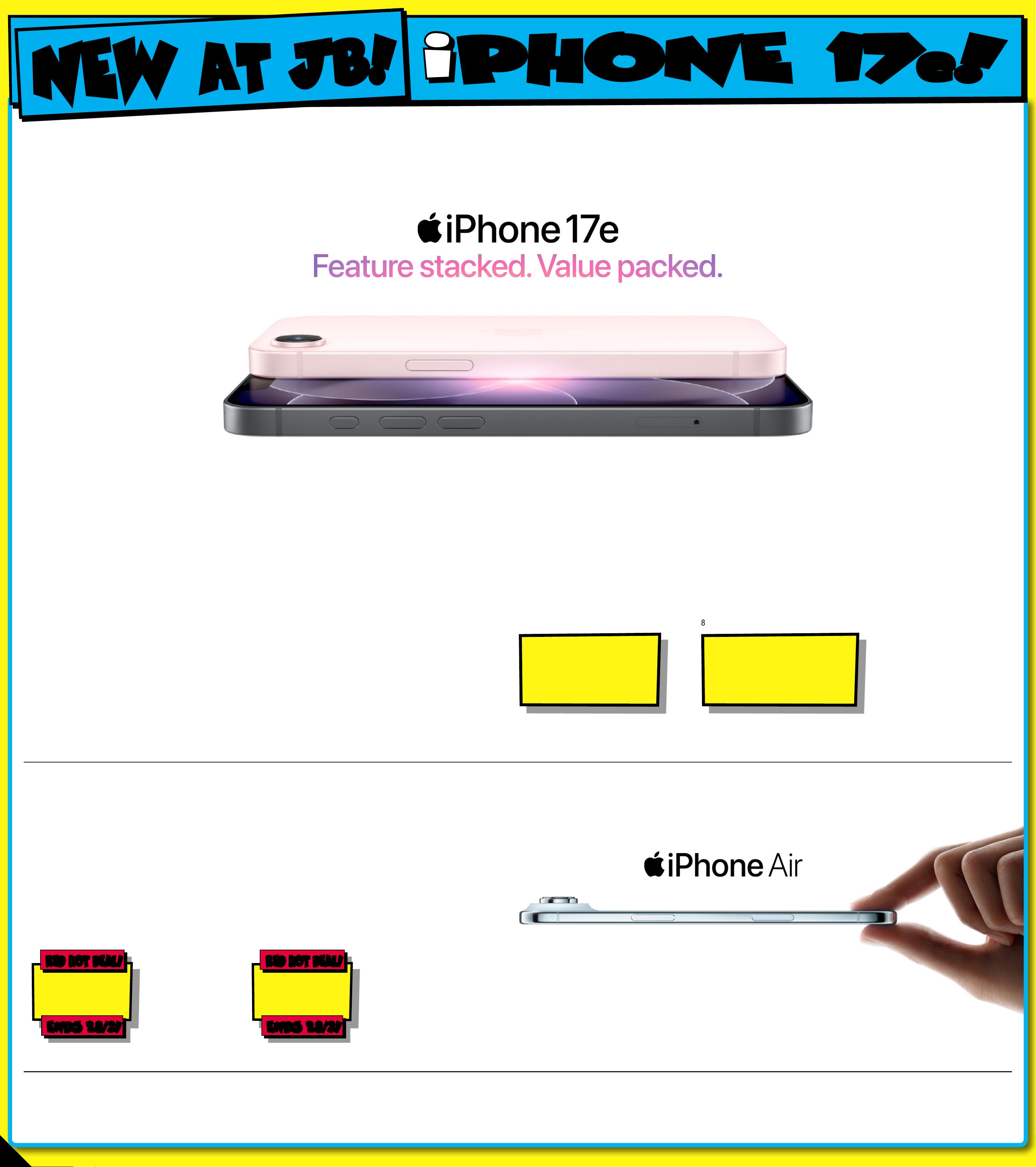 J B 7 4 2 3 _ J B H I B E 0 8 2 5 _ A l w a y s C h e a p P r i c e s / S m a r t H o m e B o n a n z a _ P P2 2 8 9 ( W ) x 3 2 0 ( D ) m m – PR O O F 7 C H A NG E S B E Y ON D P R O O F 3 W I L L B E C H AR GE D E X T R A . Get an iPhone 1 7 e 2 5 6G B f or $ 0 ◊ or ge t it out rig ht f or Wh en y ou s wi t ch y ou r nu mber t o J B Hi -F i Mob i le o n an $ 89 ° P e r M on th P lan Ov er 2 4 Mo nt hs ‡ Minimum P lan Co st $ 2 13 6 . ° Plan rever ts to $99 pe r month af ter 2 4 months 300 G B Data pe r month for use in Au stralia . Unlimited talk & text to st andard Au stralian n umber s. Instore Onl y . i i P HON E 17 P HO N E 17 e e ! ! NEW NEW AT JB! AT JB! ◊ Of fer only availabl e for new m obile s erv ice s and elig ible p or es (t-in mobile servic bein g an exis tin g mobile s er vic e tra nsferred from anothe r provi der, excluding a ny ser vi ce tha t has b een ac tive o n a T e lst ra, J B Hi -F i, The G oo d Guy s, or B oos t pla n at any t ime in th e 30 day s bef ore th e tr ansf er). The A pple iP hon e 1 7 e 25 6G B (re ferr ed to a s the " J B Hi- Fi Vo uche r" in th e T el st ra T erm s and C ondi tio ns a vailable at telstra doll. com.au /jbhif i-mobile -terms) replaces the ar val ue of th e Vouch er in th e Cri t ical Inform ation Su m mar y and w ill be ava ilabl e to you in sto re af te r conne ct ion a pproval by T elstra. I f you ca ncel o r move to a l ower c ost /d i ffer u must pay a Voent plan then yo uche r Repay ment F ee to Te lstra pro-rated agai ntnst th e remaining mo hs of yo ur plan's minimum term. Thi ffs o er is no t availa ble in c onjunc tio n wit h any ot her J B Hi- Fi m obile or b roa dban d of fer an d is limit ed to 3 connections p er customer. ‡ Speeds may var y du e to var ious factors such as location, hardware and network conges ti on. I f you exce ed your d at a allow ance, y our spe ed will be ca pped a t 1.5Mbp s. Sp eed is s lowed f ur the r in busy periods. Fo r fu ll T e rms & C ondi tions and Critical I nformation Summa r y v isit jbhif le ini.com.au /m obile-plans. Availab sto re onl y . ¹T he disp lay has r ound ed co rner s tha t foll ow a bea uti ful cur ve d desig n, and t hes e cor ners a re wi thin a s tan dar d rec tan gle. W hen mea sure d as a s tan dard r ect ang ular sh ape, t he scr een is 6 .2 7 inche s (iP hon e 1 7 , iP hon e 1 7 P ro), 6.5 5 inc hes ( iPh one A ir) or 6 .8 6 inche s (i Pho ne 17 Pro Ma x) d iagon ally. Ac tua l viewa ble ar ea i s less. The thinnest iPhone e ver . $ 1 39 9 EA iPho ne 17 e 51 2GB 8 1616 4 $ 999 EA iPho ne 17 e 256GB 816 161 $ 1 499 EN DS 2 8/ 3! EN DS 2 8/ 3! RED HO T DEA L! RED HO T DEA L! iPho ne Air 256G B 8 16 13 5 Star ted 5/03 /2026, Ends 28/03/2026 $ 1 89 9 EN DS 2 8/ 3! EN DS 2 8/ 3! RED HO T DEA L! RED HOT D EAL ! iPho ne Air 512 GB 8 16 13 9 Star ted 5/03 /2026, Ends 28/03/20 26. Co lour s Ma y Var y By S tor e iPhone Air . The thi nnest iPhone e ver . 6. 5- inch disp lay ¹, dur able Ceramic Sh ield front and back , A 19 Pro chip, 48M P Fusio n camera sy stem and Center S amera.tage front c This device is e SIM o nly. JB H i-Fi M obi le Upf ront a nd T e lstr a sup por t eS IM . Che ck you r ca rr ier for compatibility . 2 -