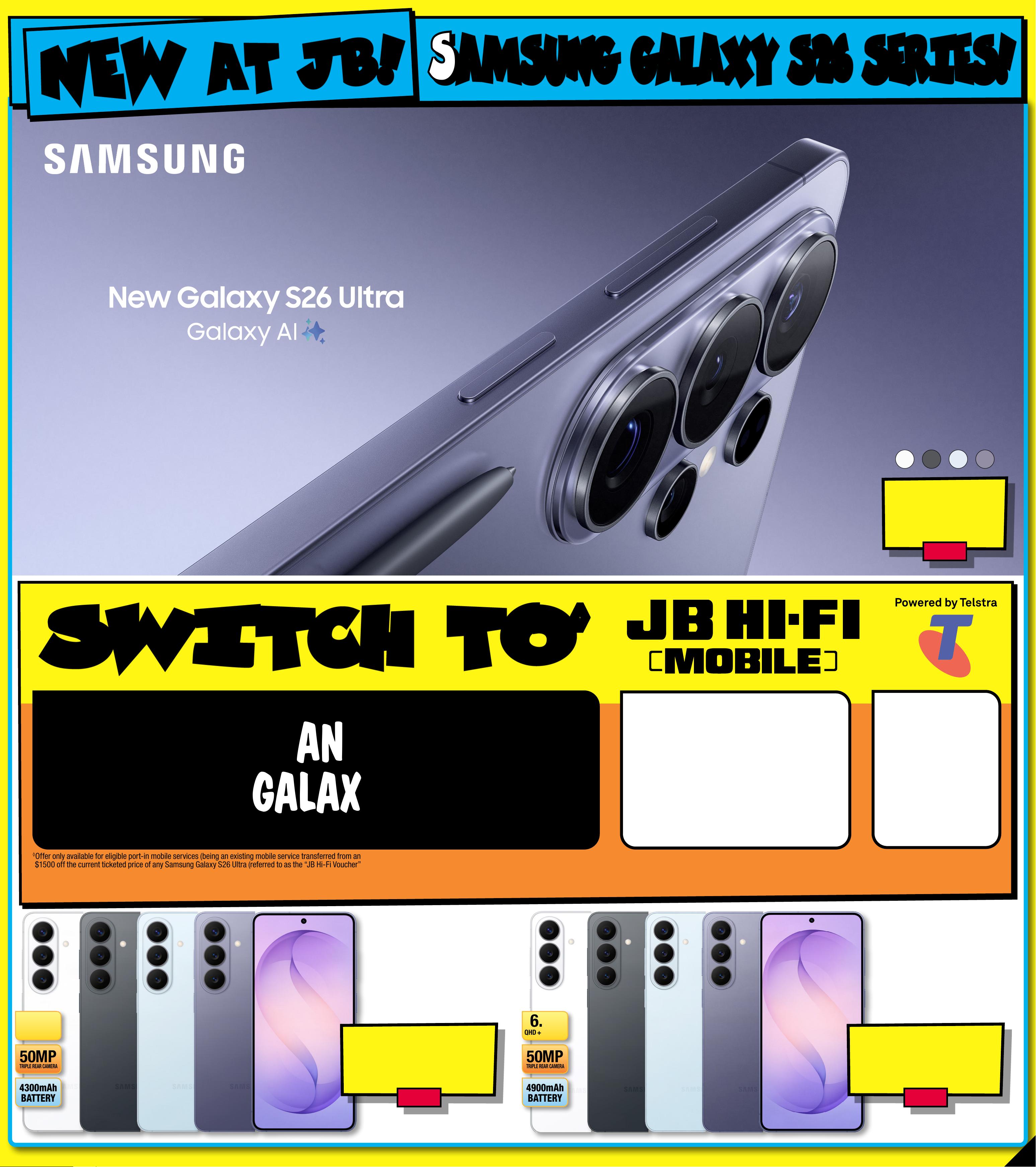 J B 7 4 2 3 _ J B H I B E 0 8 2 5 _ A l w a y s C h e a p P r i c e s / S m a r t H o m e B o n a n z a _ P P3 2 8 9 ( W ) x 3 2 0 ( D ) m m – PR O O F 7 C H A NG E S B E Y ON D P R O O F 3 W I L L B E C H AR GE D E X T R A . S WIT CH TO S WIT CH TO ◊ ◊ ◊ O f f e r o n l y a v a i l a b l e f o r e l i g i b l e p o r t - i n m o b i l e s e r v i c e s ( b e i n g a n e x i s t i n g m o b i l e s e r v i c e t r a n s f e r r e d f r o m a n othe r prov ider, exclu ding a ny ser vi ce th at ha s been a cti ve on a Telst ra , JB H i-F i, T he Go od G uys, o r Bo ost p lan a t any ti me in th e 30 da ys bef ore t he tr ans fer ). Th e $ 1 5 0 0 o f f t h e c u r r e n t t i c k e t e d p r i c e o f a n y S a m s u n g G a l a x y S 2 6 U l t r a ( r e f e r r e d t o a s t h e “ J B H i - F i V o u c h e r ” in the Telst ra Terms a nd Co ndi tion s avai labl e at tel str a.c om. au /jb hifi -mob ile- term s) rep lace s the d olla r value o f the V ouch er in th e Cri tic al In for mat ion Su mmar y and w ill be a pplie d ins tor e af ter co nne cti on app rov al by Telst ra . If yo u can cel or m ove to a l ower c ost /d if fere nt pl an the n you mu st pa y a Vouch er Re payme nt Fe e to Telst ra pr o- rat ed aga ins t the r emain ing mo nth s of you r plan’s mi nimum te rm. T his o ff er is no t avail able i n con junc tio n wit h any o ther J B Hi -F i Mob ile or B roa dban d of fer. Limi t of 3 of fe rs p er cus tome r, and onl y one of fe r can b e appl ied pe r devi ce. ‡ Speed s may var y du e to var iou s fac tor s suc h as lo cat ion , hard war e and ne t work c ong est ion . If yo u excee d your d ata a llow ance , your spe ed wil l be ca pped a t 1.5Mb ps. S pee d is slo wed fu rt her in b usy p erio ds. F or f ull Terms & C ondi tio ns and C ri tic al In for mati on Sum mar y vis it jbh ifi. com. au /mob ile- plan s. Av ailab le ins tor e onl y. Ends 2 5/ 03 /2 02 6 I N S T O R E O N L Y MINIMUM PLAN COST $2136 °PLAN REVERTS TO $99 PER MONTH AFTER 24 MONTHS PER MONTH OVER 24 MONTHS ‡ $ 8 9 ° DA T A PER MONTH 30 0 GB UNLIMITED T ALK & TEXT DA T A FOR USE IN A USTRALIA. UNLIMITED T ALK & TEXT TO ST ANDA RD A USTRALIAN NUMBERS A N YSAMSUNG G A L A X Y S26 U L T RA ! $ $ 15 0 0 15 0 0 OFF OFF ◊ ◊ E NDS 2 5 / 3! E NDS 2 5 / 3! T O G E T Im age s imu lat ed for i llu st ratio n pu rpo se s. Avai la bil it y of co lour s may va r y by cou ntr y or ca rri er. Basi c Sa msu ng Ga la xy A I featu res are f ree. Future re lea ses m ay be o ere d on a paid basis. Dierent terms may apply f or third party AI features. S A M S UN G G A L AX Y S 2 6 S ER I E S ! S A M S UN G G A L AX Y S 2 6 S ER I E S ! NEW NEW AT JB! AT JB! $ 1 84 9 EA 256 GB 4900mAh BA TTER Y 50MP TRIPLE REAR C AMERA 6. 7"QHD DISPLA+ Y Gal axy S26+ 256GB 884039 $ 15 49 EA 256 GB 4300mAh BA TTER Y 50MP TRIPLE REAR C AMERA Gal axy S26 256GB 88 4031 6.3" FHD+ DISPLAY $ 2 199 256 GB 88 4 047 3 -