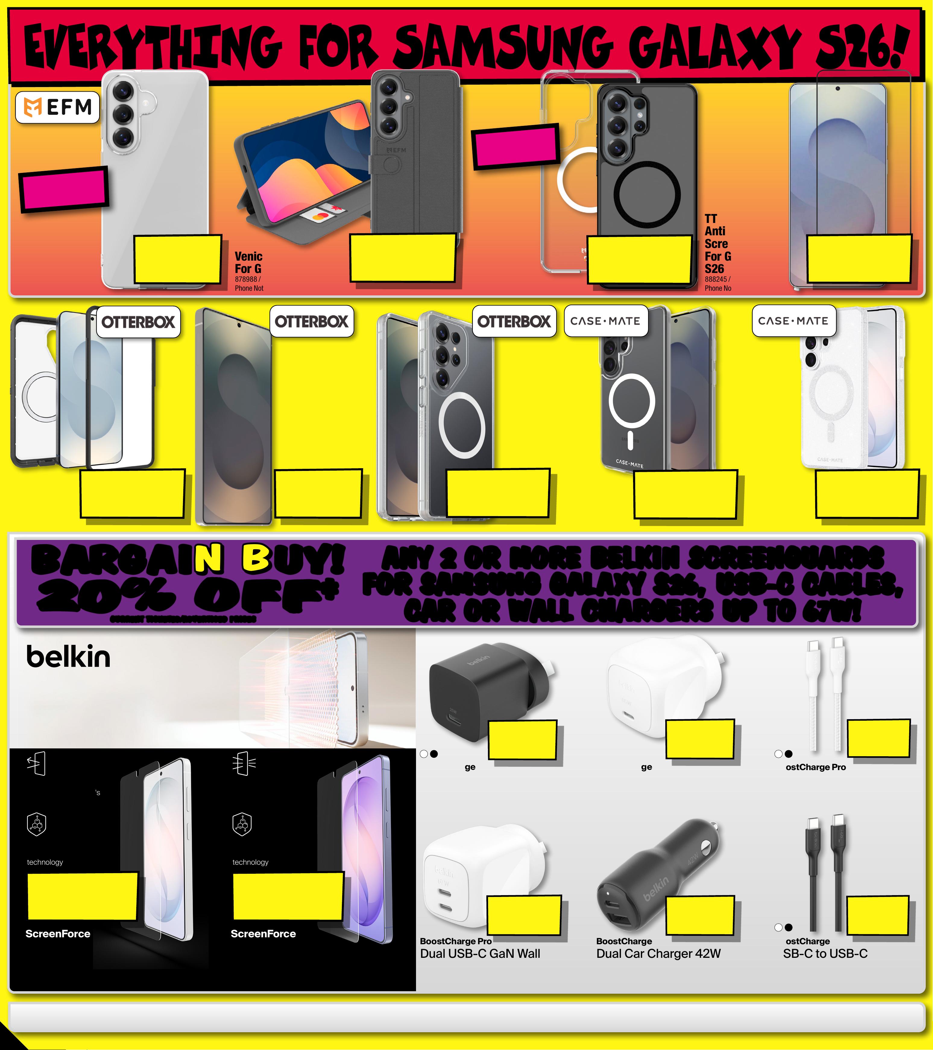 JB7 423_JBHIBE0825_ Alwa ys Cheap Pr ices / Smart Home Bonan za_PP 4 289( W ) x 320( D )mm – PRO O F 4 CHANGES BEYOND PROO F 3 WIL L BE CHARGED EX TRA . Designed for S amsung Galaxy S26Healthier screen time with red light exposure Anti-reflective to preserve your screen 's colour & clarity Engineered with Nano-Titan te chnolo gy Engineered with Nano-Titan te chnolo gy BoostChar ge Compact USB-C W all Charger 65W B o os tCharge D ual Car Char ger 42W BoostChar ge USB-C W all Charger 25W B o os tCharge P ro D ual USB-C G aN W all Charger 67W Bo os tCharge P ro Braided USB-C to USB-C Cable 2 40W Bo os tCharge U SB-C t o USB-C Cable 60W S cre enForc e Titan SmartShield Anti- Reflective Screen Protector S cre enForc e Titan Ec oGuar d Red Light Screen Prot ector BA RGAI N B UY!BA RGAI N B UY!2 0 % O FF 2 0 % O FF ‡ ‡ AN Y 2 OR MO RE B E LK I N SCR E EN GU ARD S AN Y 2 OR MO RE B E LK I N SCR E EN GU ARD S FOR SAMSUNG GAL A X Y S 2 6, USB - C C ABLE S, FOR SAMSUNG GAL A X Y S 2 6, USB - C C ABLE S, CA R OR W ALL C HA RG ERS U P T O 6 7W ! CA R OR W ALL C HA RG ERS U P T O 6 7W ! CURRENT TICKETED/ADVERTISED PRICES CURRENT TICKETED/ADVERTISED PRICES E V E R YT H I N G F OR S A MS U N G G A LA X Y S 26 ! $ 29 . 95 814 8 0 1 / WCA01 2AUBK $ 54 . 95 8 3 13 51 / WCA01 1AUWH $ 39 . 95 EA 846842 / O PhoV B 0 74 F Q ne No t incl uded $ 49 . 95 EA 846845 / OVB092FQ Phone Not I nclu ded $ 34 . 95 670976 / CCB005BTBK $ 19 . 95 8 119 3 2 / CAB023FQ1 MBK $ 49 . 95 EA V e n ic e Wallet F o r G alaxy S 26 Black 878 98 8 / EFCVESG298BLA P h o n e N o t Include d $ 39 . 95 EA T T Sapphire+A n t i micr obial Sc re en Armour F o r G alax y S 2 6 Ultr a 888 2 4 5 / EFSGTTS G300CLE P h o n e N o t Include d $ 1 19 . 95 EA Defender Pro X T Case For Gala xy S 26 88 815 7 / 77 -99898 Ph one N ot In clude d $ 49 . 95 Premium Glass Screen Protec tor For Gala x y S2 6 Ultr a 88 81 75 / 77 -000033 Ph one N ot In clude d $ 49 . 95 EA Reac t Cas e For G alax y S26 Ul tra 888096 / 77 -99943 Ph one N ot In clude d $ 39 . 95 EA To u g h C a s e For G alax y S26 Ul tra 878875 / CM05996 4 Ph one N ot In clude d $ 59 . 95 EA T winkle Case For G al axy S26 Ul tra 8789 14 / CM059868 Ph one N ot In clude d ‡ Wh en Pur cha sed in t he Sa me T ran sac tio n. E xclude s JB H i-F i M arke at pointplace Product s. Discount is applied t of s ale in s tore a nd app lied a utomatically at cart if purchas ed onli ne. Thi s of fer a pplies to current ti cketed /advertised prices . Pric es of s ome pro duc ts ar e likely t o have ch ange d and may hav e incre ase d prio r to thi s of fer. Bec ause o f this a nd as we regularly negotiate cton price, some produ s are like ly to ha ve been s old be low t he current ticketed adve/ rt ised p rio r to thi s of fer. Pric es m ay change after this o f f e r. ^ Dis coun ts ap ply to p revi ous ti c keted/adver ce prtised pri ior t o the dis cou nt of fer a t the t ime of pr int ing 5/ 03 /2 02 6. A s we ne goti at e, pr ely hoduct s will lik ave bee n sold b elow ticketed/adver iset d pric e pri or to th e disc ount o f fer. Pric es may di ff er at ai rpo rt s tor es. $ 59 . 95 8 3 1412 / WC H020AU WH $ 29 . 95 Li te Cle ar Case For Gala xy S2 6 888093 / EFCCLSG298CLE Ph one N ot In clude d SUPER SUPER T H IN! T H IN! $ 29 . 95 8 119 7 2 / CAB025FQ2MWH $ 49 . 95 EA Manhat t an Mag C ase Wit h D3O BIO For G alax y S26 Ul tra 8881 9 1 / EFCMASG300BL A Ph one N ot In clude d JB JB EX C LUSI V E! EX C LUSI V E! 4 -
