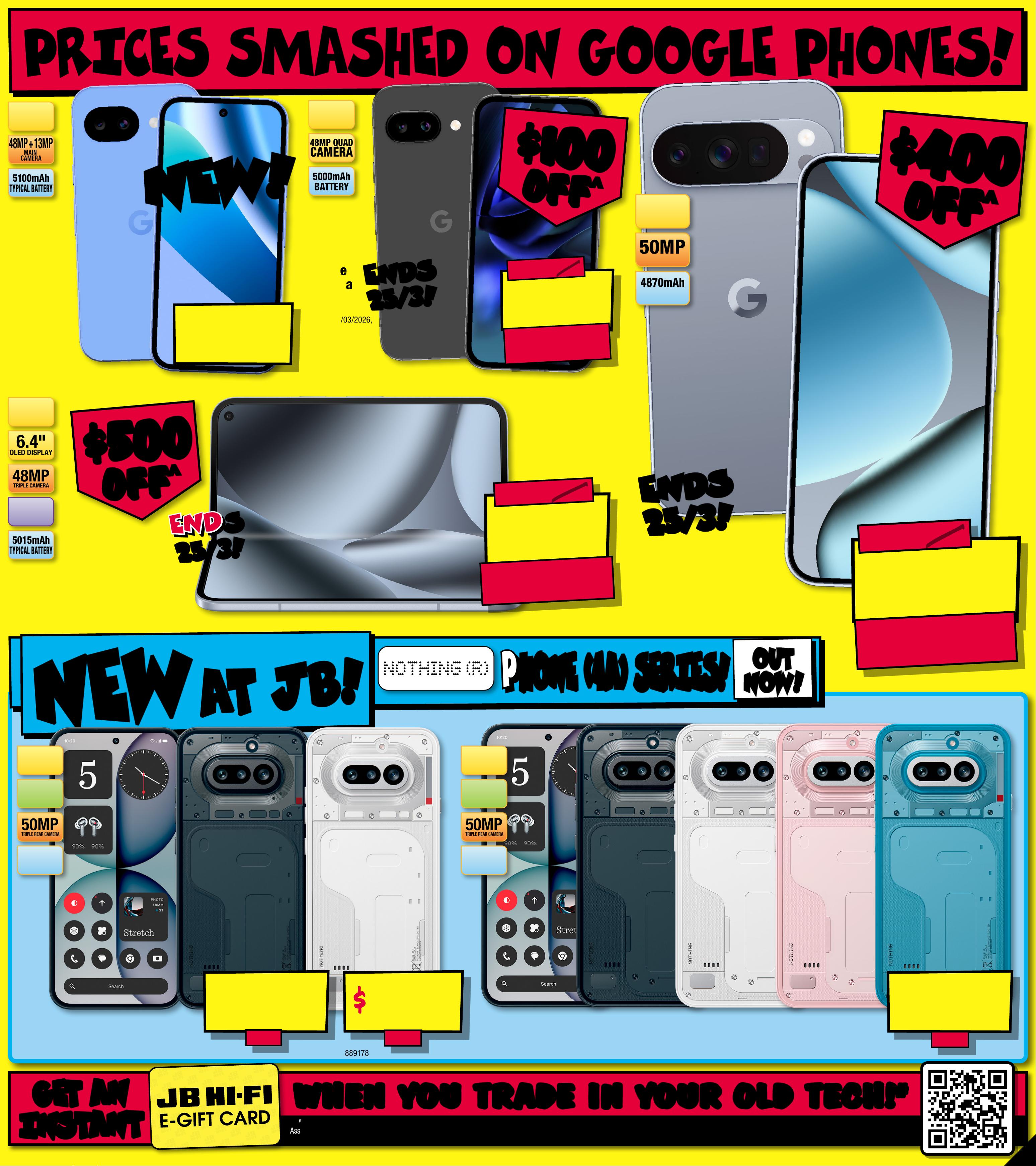 J B 7 4 2 3 _ J B H I B E 0 8 2 5 _ A l w a y s C h e a p P r i c e s / S m a r t H o m e B o n a n z a _ P P 5 2 8 9 ( W ) x 3 2 0 ( D ) m m – PR O O F 3 C H A NG E S B E Y ON D P R O O F 3 W I L L B E C H AR GE D E X T R A . W H EN Y OU TRA D E I N Y OU R OL D TE CH ! W H EN Y OU TRA D E I N Y OU R OL D TE CH ! # # # Th e JB Hi -F i Trade -in pr ogr am is op era ted by A s sura nt S er vice s Aus tr alia P t y Li mite d AB N 18 613 632 3 67, Seco nd Ha nd De aler 2 P S20 87 2. P ar tici pan t must b e AU r esid ent ag ed 18+ wi th t rade -in d evic e purc has ed in A U. A s s uran t is not r equi red to m ake an o f fer on y our dev ice. T he J B Hi- Fi e Gi ft C ar d given i n excha nge fo r a tra de- in is su bjec t to Terms a nd Co ndit ion s at jbh ifi. com. au /gif tc ard term s. Pr e-a ut hori sat ion w ill be t aken f rom p ar tic ipan t's pay ment c ard . If t rade d in dev ice is n ot re ceiv ed wit hin 7 da ys af te r your t rad e-in , As sur ant m ay debi t the t rad e-i n valu e fro m your p aymen t car d. A ssu ran t T erm s and C ond iti ons at j bhi fi.co m.au /as sur an t-ter ms. G ET A N G ET A N I N S TA N T I N S TA N T P HO N E ( 4 A ) S E R I E S! P HO N E ( 4 A ) S E R I E S! N EW N EW AT J B ! AT J B ! OUT OUT NOW! NOW! P R I C E S S MA S HE D ON G OO G L E P H ONES ! $ 849 EA 5 1 00mAh TYPICAL BA TTER Y 48MP + 13MP M A I N C A MER A 6.3" ACTUA DISP L AYGoogle Pix el 1 0a 12 8 GB 883969 Colours Ma y Var y By Capaci t y & S tor e. Fo r Avail abilit y Visi t jbhi.fi/8 839 69 N E W! N E W! $ 697 EA $ 100 OFF ^ T ICK ET $ 797 5000mAh BA TTER Y 48MP QUAD CAMERA 6.3" ACTUA DISP L AYGoogl e Pix el 9 a 12 8 G B 797230 Star ted 1 2 / 0 3 /20 26 , End s 25 /0 3/2026. Co lour s Ma y Vary By Ca paci ty & S tore. For Ava ilabili t y Visi t jbhi.fi/ 79723 0 E N DS EN DS 2 5/ 3! 2 5/ 3! $ $ 100 100 OFF OFF ^ ^ $ 2 197 $ 50 0 OFF ^ T ICK E T $ 269 7 5015mAh TYPICAL BA TTER Y 48MP TRIPLE C AMERA 6.4" OLED DISPLAY 8" FLEX OLED MAIN Qi-2 COMPATIBLE Goog le Pixel 1 0 Pro Fold 256GB 816 9 0 5 Started 1 2/03/2026, End s 25/03/2026. Co lo urs M ay Va ry By C apa cit y & S tore . For Availabilit y Visit jbhi.fi/816905 E N D SE N D S2 5/ 3! 2 5/ 3! $ $ 500 500 OFF OFF ^ ^ $ 12 97 EA $ 400 OFF ^ T I CK E T $ 1697 4870mAh TYPICAL BA TTERY 50MP MAIN CAMERA 6.3" SUPER ACTUA DISPLAY Google Pix el 1 0 Pro 1 28GB 816 8 9 0 Star ted 12/03/2026, Ends 25/03/2026 E N DS E N DS 2 5 / 3! 2 5 / 3! $ $ 400 400 OFF OFF ^ ^ ^ Dis coun ts ap ply to previous ticketed/ad to the divert ised price prior sco unt of fe r at th e time of p rint ing 5 /0 3/ 20 26. A s we ne got iate, p rod u ct bes will likely have en sol d below t ic keted c/advertised pri e prio r to th e disc ount o ff er. Price s may dif f er at air por t s tor es. $ 74 9 EA 256 GB 8 8 9 1 78 $ 6 49 EA 128GB 50MP TRIPLE REAR C AMERA 6.78" AMOLED DISP L AY5080mAh BA TTERY WITH 50W FAST CHARGING RAM 8GB Phone ( 4a) 8+ 1 28GB 8 8 9 176 $ 849 EA 256 GB 50MP TRIPLE REAR C AMERA 6.78" AMOLED DISP L AY5080mAh BA TTERY WITH 50W FAST CHARGING RAM 1 2GB Phon e ( 4a) 1 2+ 256GB 8 8 918 0 Pin k & Blue S ele cte d St ores O nly. C olou rs & C apac iti es May V ar y By S to r e. For Ava ilabilit y Visit jbhi.fi /88 9180 5 -