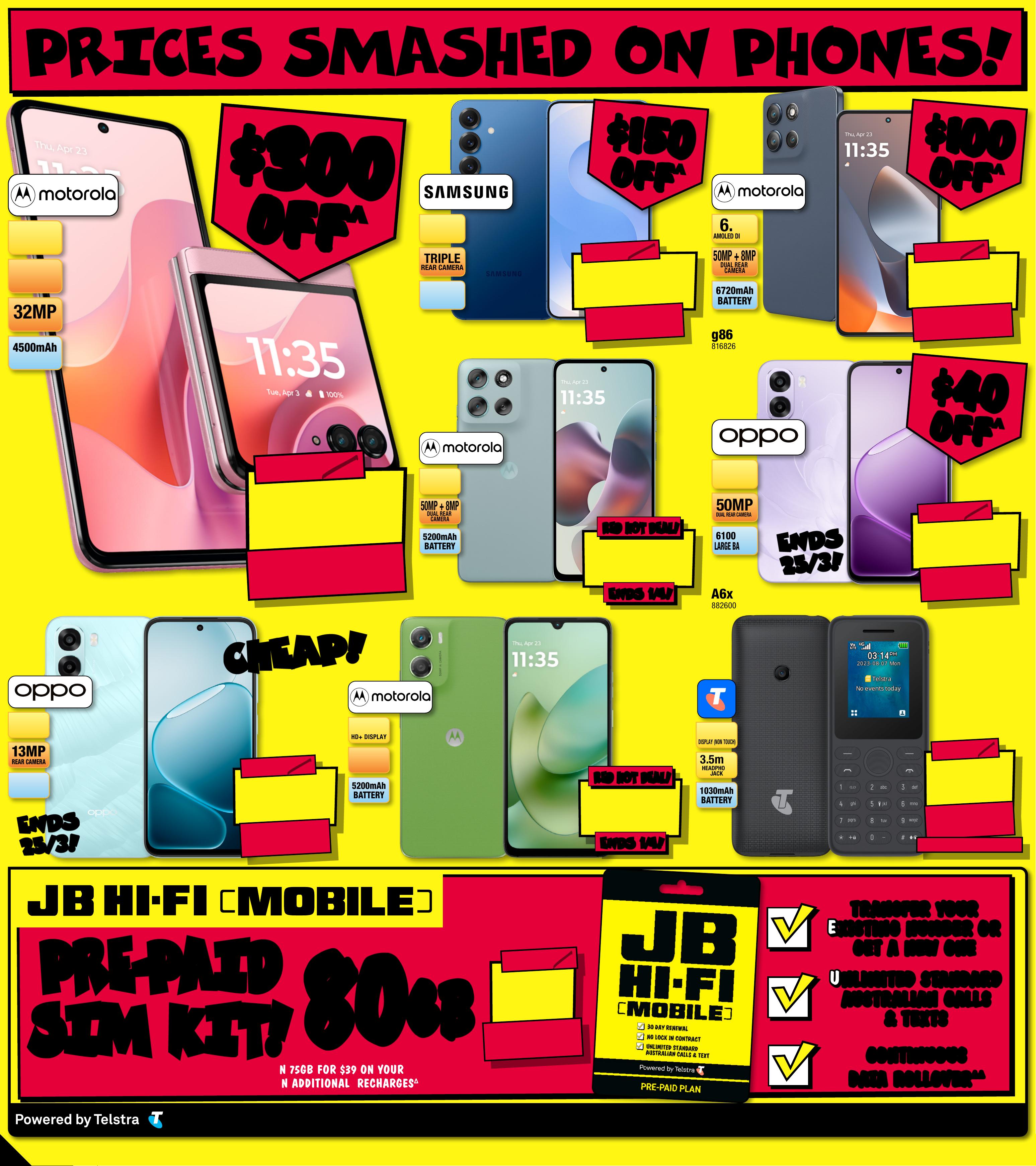 JB7 423_JBHIBE0825_ Alwa ys Cheap Pr ices / Smart Home Bonan za_PP6 289( W ) x 320(D)m m – PRO O F 5 CHANGES BEYOND PROO F 3 WIL L BE CHARGED EX TRA . P R I C E S S MA S HE D ON P H ONES ! $ 19 9 EA $ 30 OFF ^ TI CK ET $ 229 1 3MP REAR CAMERA 6.75" HD + ULTRA LARGE SCREEN 6100mAh LARGE BATTERY A6x 4 G 1 28GB 882603 Sta rted 1 2 /03/2026, Ends 25/03/2026 E NDS E NDS 2 5/ 3! 2 5/ 3! $ 39 EA $ 20 OFF ^ LOC KE D T O TE L ST RA° T ICK ET $ 59 1030mAh BA TTER Y 1.77" DISPLAY (NON TOUCH) 3 . 5 m mHEADPHO NEJACK Te l s t r a Pre -Paid T- L ite 4 G 7505 61 TRA NSFER YOUR TRA NSFER YOUR E XIST IN G NU MB ER OR E XIST IN G NU MB ER OR GET A NE W ONE GET A NE W ONE U NLIM ITED ST AND ARD U NLIM ITED ST AND ARD AUSTRALI AN CALLS AUSTRALI AN CALLS & TEXTS & TEXTS CO NTINUOUS CO NTINUOUS DA TA ROLLOVER DA T A ROLLOVER ΔΔ ΔΔ P R E - PA I D P R E - PA I D S I M KIT ! S I M KIT ! GET 8 0GB ON A CTIVATION FOR $1 3, THE N 7 5 G B F O R $ 3 9 O N Y O U R N EXT 2 R ECHARGES , THEN 30 GB FOR $3 9 O N A D D I TI O N A L R E C H A RG ES ∆ 8 8 0 0 GB GB Of fe r vali d for si ms act iva ted by 4 th Ma y 2026. Second recha rge must occ ur by 6 th Ju ly 20 26 o r of fer r ever ts t o 30 GB f or $ 39 . 30 GB f or $ 39 fr om th ird re cha rge on war ds. 3 0 day re newa l. Fo r dat a rol love r, rech arge before 3 0 days o r unus ed da ta wil l expir e. Ava ilab le to ne w JB Hi -F i Mo bile P re- Pa id SI M ser vi ces o nly. Dat a fo r use in A us tra lia. U nlimi ted t alk & t ext t o st and ard A us tr alian numbers. Spe eds ma y var y due t o various factors such as locati on, ha rdw a re and networ um calk congestion. Exclude premi ls and m ess ages , pre mium se rv ices and content purchasi ng & Tels tr a Plus . For f ull Terms a nd C o nditions and Critica l In formation Summar y visit jbhifi.com.au/mobile-plans $ 13 $ 26 OFF ^ T ICK E T $ 39 ° This phone is locke d to th e T el st ra net wo rk an d will onl y wor k wit h a T e lst ra sim c ard. U nlo cking f ee app lies fo r use w ith n on-T el str a sim ca rd. L ear n more a t telstra .com.au/suppor t /mobiles-devices /u nlock-phone-imei ^ Di sco unt s apply t o pre vious ticketed/adver the dist ised price prior to coun t of fer a t the ti me of pr intin g 5/ 03 /2 02 6. A s we negotiate, produc en solts will likely have be d below t icke t ed/adver pritised price or to th e disc ount o f fer. Pric es may dif fer at airport stores. $ 2 59 EA $ 40 OFF ^ T ICK ET $ 299 50MP DUAL REAR C AMERA 6100 mAhLARGE BA TTERY6 .75" HD + ULTRA LARGE SCREEN A 6 x 5G 1 28G B 88 2 60 0 Started 12/03/ 20 26, En ds 2 5/03/2026 END S END S 2 5/ 3! 2 5/ 3! $ $ 40 40 OFF OFF ^ ^ $ 89 9 EA $ 300 OFF ^ T I CK E T $ 1199 6.9" FHD+ pOLED SCREEN INTERNAL DISPLAY 4500mAh BA T TERY 32MP SELFIE CAMERA 50MP CAMERA SYSYEM razr 60 256GB 8 120 6 0 $ $ 300 300 OFF OFF ^ ^ $ 39 9 EA $ 10 0 OFF ^ T ICK ET $ 499 6720mAh BA TTER Y 50MP + 8MP D U A L R E A R C A MER A 6. 7"AMOLED DI SPL AYg 8 6 Power 5G 12 8GB 8 16 8 2 6 $ $ 100 100 OFF OFF ^ ^ $ 1 49 EA ENDS 1/ 4! ENDS 1/ 4! RED HO T DEA L! RED HOT D EAL ! 6.88" HD+ DISPLAY 5200mAh BA TTER Y 50MP MAIN CAMERA moto G0 6 64 GB 8462 05 Started 1 2/03/2026 $ 29 9 EA ENDS 1/ 4! ENDS 1/ 4! RED HO T DEA L! RED HO T DEA L! 5200mAh BA TTER Y 50MP + 8MP D U A L R E A R C A MER A 6.7" FHD+ DISPLAY g56 5G 256GB 81 638 9 Started 1 2 /03/2026 $ 12 37 EA $ 15 0 OFF ^ T ICK ET $ 1387 TRIPLE REAR CAMERA 4000mAh BA T TERY 6 .2" FHD+ DISPLAY Gal axy S25 256GB 795454 $ $ 150 150 OFF OFF ^ ^ C H E A P! C H E A P! 6 -