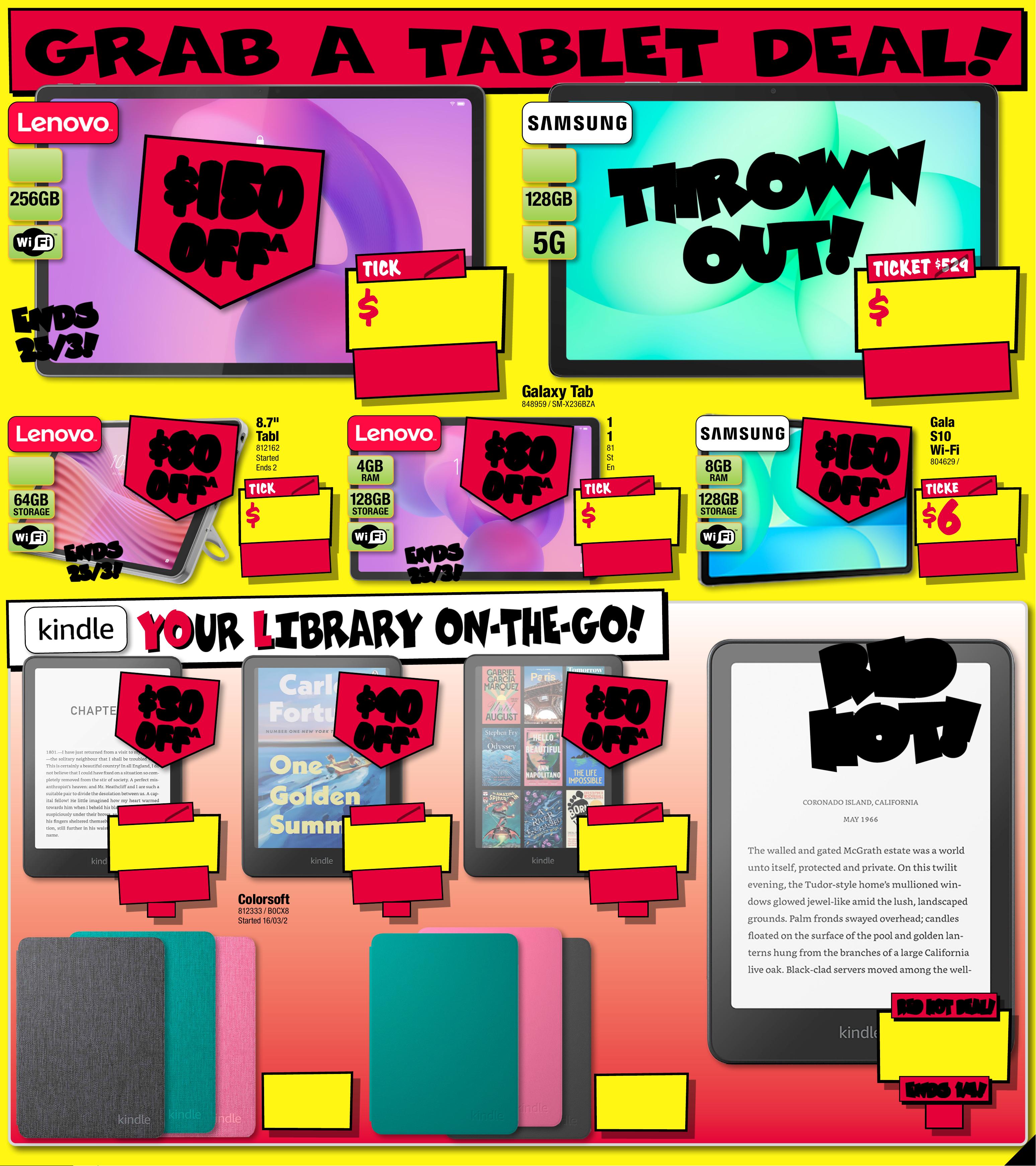 J B 7 4 2 3 _ J B H I B E 0 8 2 5 _ A l w a y s C h e a p P r i c e s / Smart Hom e B o n a n z a _ P P 7 2 8 9 ( W ) x 3 2 0 ( D ) m m –PRO O F 5 CHANGES BEYOND PROO F 3 WIL L BE CHARGED EX TRA . G RA B A T A BL E T DEA L ! $ 4 29 $ 100 OFF ^ T I CK E T $ 5 29 STORAGE 1 28GB RAM 6GB G a l a x y T a b A1 1 + 1 28G B 5G 848 9 5 9 / S M - X 2 3 6BZ A A A TS TH R O W N TH R O W N O U T! O U T! $ 59 EA Paperwhite 1 2th Gen F a bric C over • C ompa tible W ith K in dle Colors of t 77867 1 / B0C M7 X4 24T $ 69 EA Paperwhite 1 2th Gen Plant B ased Leather Cover • Compatib le W ith Kindle Colo r sof t 77867 5 / B0 C M 82 H 7 1F ^ Dis coun ts ap ply to previous ticketed/ad to the divert ised price prior sco unt of fe r at th e time of p rint ing 5 /0 3/ 20 26. A s we ne got iate, p rod u ct bes will likely have en sol d below t ic keted c/advertised pri e prio r to th e disc ount o ff er. Price s may dif fe r at air por t s tor es. Y O UR L IB RA R Y ON - T HE - GO ! $ 309 $ 90 OFF ^ 16GB T ICK ET $ 399 C o l o r s o f t 7" 16G B 8 1 2 333 / B 0 CX 8 MT2M2S t a r t e d 1 6 / 0 3 /2 026$ $ 90 90 OFF OFF ^ ^ $ 6 99$ 15 0 OFF ^ T I CK E T$ 849 RAM 8GB STORAGE 1 28GB G a l a x y Ta b S 1 0 FE 12 8GB Wi -F i 8 0 4 62 9 / S M- X 210 N Z A AX S A $ $ 150 150 OFF OFF ^ ^ $ 29 9 $ 80 OFF ^ T I CK ET $ 379 STORAGE 1 28GB RAM 4GB 1 1"I d e a t a b 1 1T a b l e t 8 1 6929 / ZA FR082 7A U S t arted 1 2 /03 /2 026, E n ds25/03/2026 E NDS E NDS 2 5/ 3! 2 5/ 3! $ $ 80 80 OFF OFF ^ ^ $ 19 9 $ 80 OFF ^ T I CK ET $ 279 STORAGE 64GB RAM 4GB 8 . 7 " Tab On e Ta b l e t 6 4GB 8 12 1 6 2 / ZAF0 0 0 91A U S t a r ted 12 /0 3/2026, E n d s 2 5/03/2026E NDS E NDS 2 5/ 3! 2 5/ 3! $ $ 80 80 OFF OFF ^ ^ $ 499 $ 15 0 OFF ^ T I CK E T $ 649 STORAGE 256GB RAM 1 2GB 1 2. 1 " Ideatab T ab Pl us T ablet 84444 1 / ZAG70045AU S tarted 1 2/03/2026, Ends 25/03/2026 END S END S 2 5/ 3! 2 5/ 3! $ $ 150 150 OFF OFF ^ ^ $ 26 9 $ 30 OFF ^ 16GB TI CK ET $ 299 1 2 th Gen 7" Paperwhite 16 G B 778669 / B0CFPL6CF Y Started 16/03/2026 $ $ 30 30 OFF OFF ^ ^ 32GB $ 299 ENDS 1/ 4! ENDS 1/ 4! RED HOT DEAL! RED HOT DEAL! Paperwhite 1 2 th Gen 7" Signature Edition 32 GB 77867 0 / B0C FPH TM DX Starte d 1 6/03/2026 R ED R ED H O T! H O T! $ 39 9 $ 50 OFF ^ 32GB T ICK ET $ 449 Colors of t Signature Edit ion 7" 32GB 81 2334 / B0CX8Y3 CMG Started 16/03/2026 $ $ 50 50 OFF OFF ^ ^ 7 -