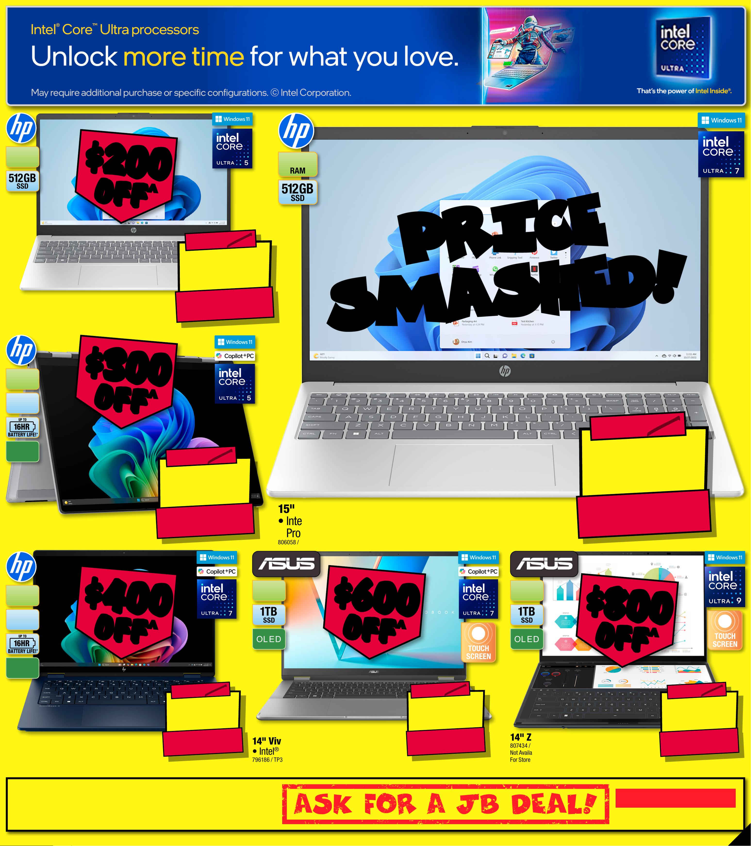JB7 423_JBHIBE0825_ Alwa ys Cheap Pr ices / Smart Home Bonan za_PP9 28 9( W ) x 320(D) mm – PR OOF 2 S E E N I T C HE A P E R ? INSTORE | ON LINE E xcludes J B Hi- Fi M arket place P rodu ct s $ 1 39 9 $ 30 0 OFF ^ T I CK E T $ 1699 5 1 2 G B S S D RAM 1 6GB 1 5 " AI Notebook• I nt e l® C ore ™ Ultra 7 Pr o cessor 255 U 80 6 05 8 / BQ4E0PA#ABG P RI C E P RI C E S M A S H E D! S M A S H E D! ∙B at ter y lif e bas ed on m anufacture r test ing and c an var y sig nificantly based on usag e, net wor k and f eature configur , siation gnal s tre ngt h, set t ings an d oth er fa ctor s. ^ D isco unt s appl y to pr evious ticketed/adve o trtised price prior t he dis coun t of fer a t the ti me of pr intin g 5/ 03 /2 02 6. A s we neg otia te, pr oduc ts w ill likel y have bee n sold b elow t icke t prioed/advert ised price r to the d isco unt o ff er . Pr ices m ay differ at ai rpor t stores. $ 3 19 9 $ 80 0 OFF ^ T ICK ET $ 3999 O L E D 1 TB S SD RAM 32GB 1 4 " Z enbook Duo Notebook 8 0 7 434 / UX84 06CA-PZ003W N o t A v a i l a ble In Al l St ores . F or S t ore Locations V isit j bhi.fi /8 074 3 4 For Avail abilit y $ $ 800 800 OFF OFF ^ ^ $ 2399 $ 600 OFF ^ T ICK ET $ 2999 O L E D 1 TB S SD RAM 32GB 1 4 " V i v obook 2-In- 1 Notebook • I n t el ® Core ™ Ultra 7 P rocess or 258V 7 9 6 18 6 / T P 3 407SA-QL016W $ $ 600 600 OFF OFF ^ ^ $ 1999 $ 400 OFF ^ T ICK ET $ 2399 BATTERY LIFE! • UP TO 1 6HR O L ED RAM 32GB 5 1 2 GB SSD 1 4" OmniBoo k X Flip 2-In- 1 Notebook • In tel ® Core ™ Ultr a 7 Proces sor 25 8V 840492 / CF6S6P A#ABG $ $ 400 400 OFF OFF ^ ^ $ 169 9 $ 30 0 OFF ^ T ICK E T $ 1999 BATTERY LIFE! • UP TO 1 6HR RAM 1 6GB O L ED 5 1 2 GB SSD 1 4" OmniBoo k X Flip Notebook 840488 / CF6S8PA#ABG $ $ 300 300 OFF OFF ^ ^ $ 129 9 $ 20 0 OFF ^ T ICK E T $ 1499 5 1 2 G B S S D RAM 1 6GB 1 5" Notebook • Intel ® Core ™ Ult ra 5 Pro cessor 2 25U 806 057 / C2M S2PA #A BG $ $ 200 200 OFF OFF ^ ^ 9 -