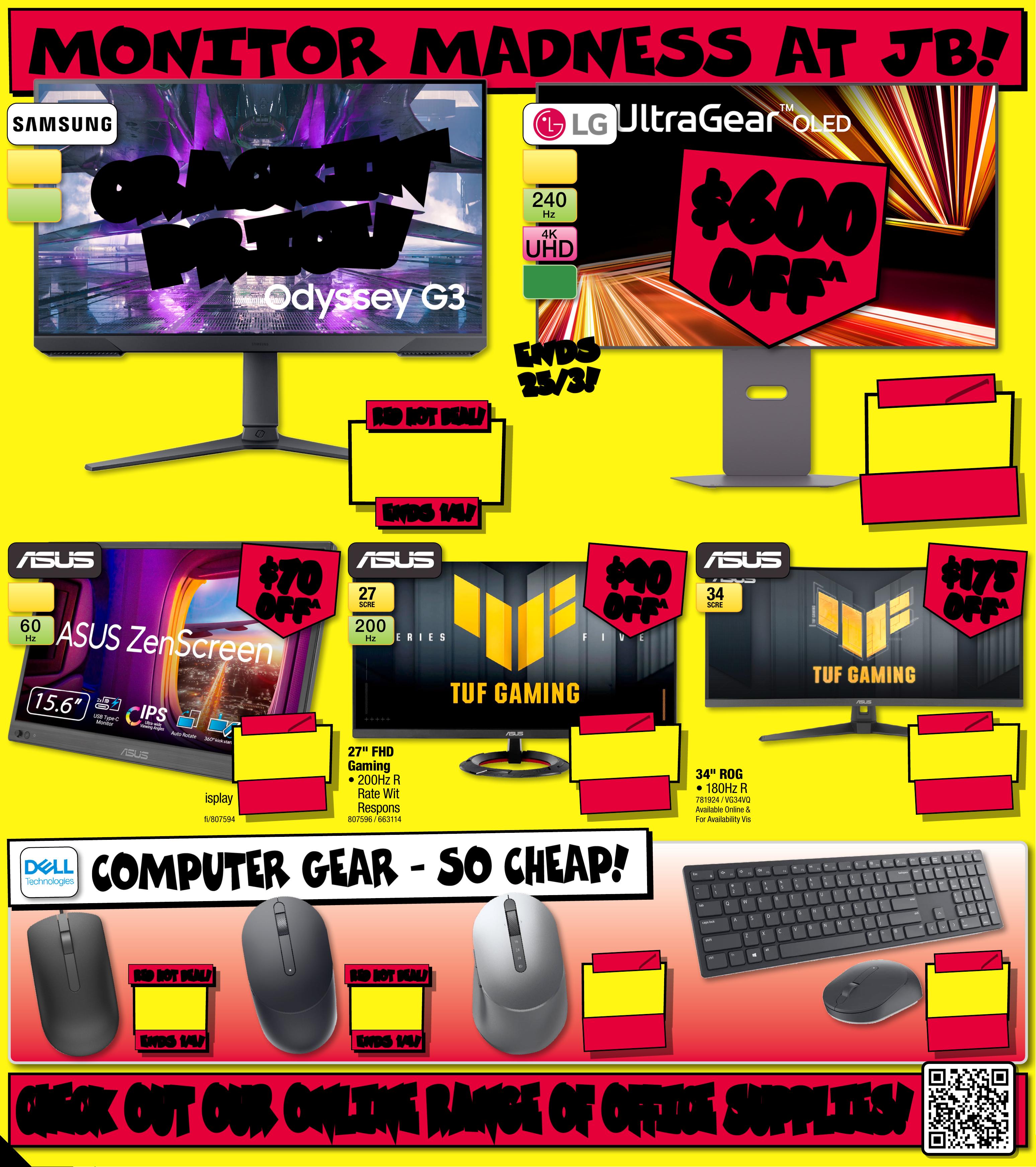 JB7 423_JBHIBE0825_ Alwa ys Cheap Pr ices / Smart Home Bonan za_PP1 0 2 89( W ) x 320(D)m m – PRO O F 3 C H A NG E S B E Y ON D P R O O F 3 W I L L B E C H AR GE D E X T R A . C HE C K OU T O U R ON L I NE RA N G E O F OF F I C E S U P P L IES ! C HE C K OU T O U R ON L I NE RA N G E O F OF F I C E S U P P L IES ! M ON IT OR M A DN E S S A T JB ! $ 299 ENDS 1/ 4! ENDS 1/ 4! RED HO T DEAL! RED HO T DEAL! 27" SCREEN 1 80 Hz 27" Odysse y G3 Gami n g Monitor • 27" FHD (1 920 x 1 08 0) Di spl ay 77797 0 / LS27DG302EE XX Y C RA C K I N' C RA C K I N' P R IC E ! P R IC E ! ^ Dis coun ts ap ply to previous ticketed/ad to the divert ised price prior sco unt of fe r at th e time of p rint ing 5 /0 3/ 20 26. A s we ne got iate, p rod u ct bes will likely have en sol d below t ic keted c/advertised pri e prio r to th e disc ount o ff er. Price s may dif fe r at air por t s tor es. $ 5 24 $ 17 5 OFF ^ TI CK ET $ 699 34 "SCRE EN3 4 " RO G Gaming Monit or • 1 8 0 H z R efresh Rat e 7 8 19 2 4 / VG 3 4V Q 3BAv a i l a b le O n l i n e & Selec ted S to re s On ly. F o r A v a i l a b i l i t y V i s it jbhi.fi / 7819 24 $ $ 175 175 OFF OFF ^ ^ 20 0 H z 27 "SCRE EN2 7 " F H D 200H z G a mi ng Monitor• 2 0 0 Hz R efresh R a t e W i t h0.3ms R e s p o ns e Time8 0 75 9 6 / 6 6 3 11 4 4 $ $ 90 90 OFF OFF ^ ^ $ 2 59 $ 90 OFF ^ TI CK ET $ 349 60 H z 1 6" SCREEN 1 6" ZenScreen Por tab le Monitor • 1 6" FHD (1 92 0 x 1 0 80) I PS P or t able D i s pla y 8075 94 / M B16 9 CK Av aila ble O nline & S ele cte d Sto res O nly. F o r Availabilit y Vis it jbhi. fi / 8 0 7 5 9 4 $ $ 70 70 OFF OFF ^ ^ $ 19 9 $ 70 OFF ^ TI CK ET $ 269 $ 13 ENDS 1/ 4! ENDS 1/ 4! RED HO T DEA L! RED HOT D EAL ! Wired Optical Mouse 625022 / 570-A A SJ C O M P U TER G E A R – SO CHEA P ! $ 31 ENDS 1/ 4! ENDS 1/ 4! RED HO T DEA L! RED HOT D EAL ! MS3 00 Full Size Wire less Mouse 6561 1 6 / 570-ABOP $ 55 $ 14 OFF ^ T ICK ET $ 69 Multi-D evice Wire les s Mouse 465 976 / 570-ABD P $ 47 $ 12 OFF ^ T ICK ET $ 59 KM221 W Pro Wireless Keyboar d & Mouse C om bo 515 3 8 2 / 580-AJNR $ 1 79 9 $ 60 0 OFF ^ T I CK E T $ 239 9 240 H z 32" SCREEN O L ED 32" 4K 240Hz Dual Mo de OL ED Gaming Monitor • N V IDI A G-SY NC C om pa tib le & AMD FreeS y nc Pr emium P ro 806067 / 32GX870A-B .A AU Star ted 1 2 /03 / 2026, E nds 25/03/2026 END S END S 2 5/ 3! 2 5/ 3! $ $ 600 600 OFF OFF ^ ^ 1 0 -