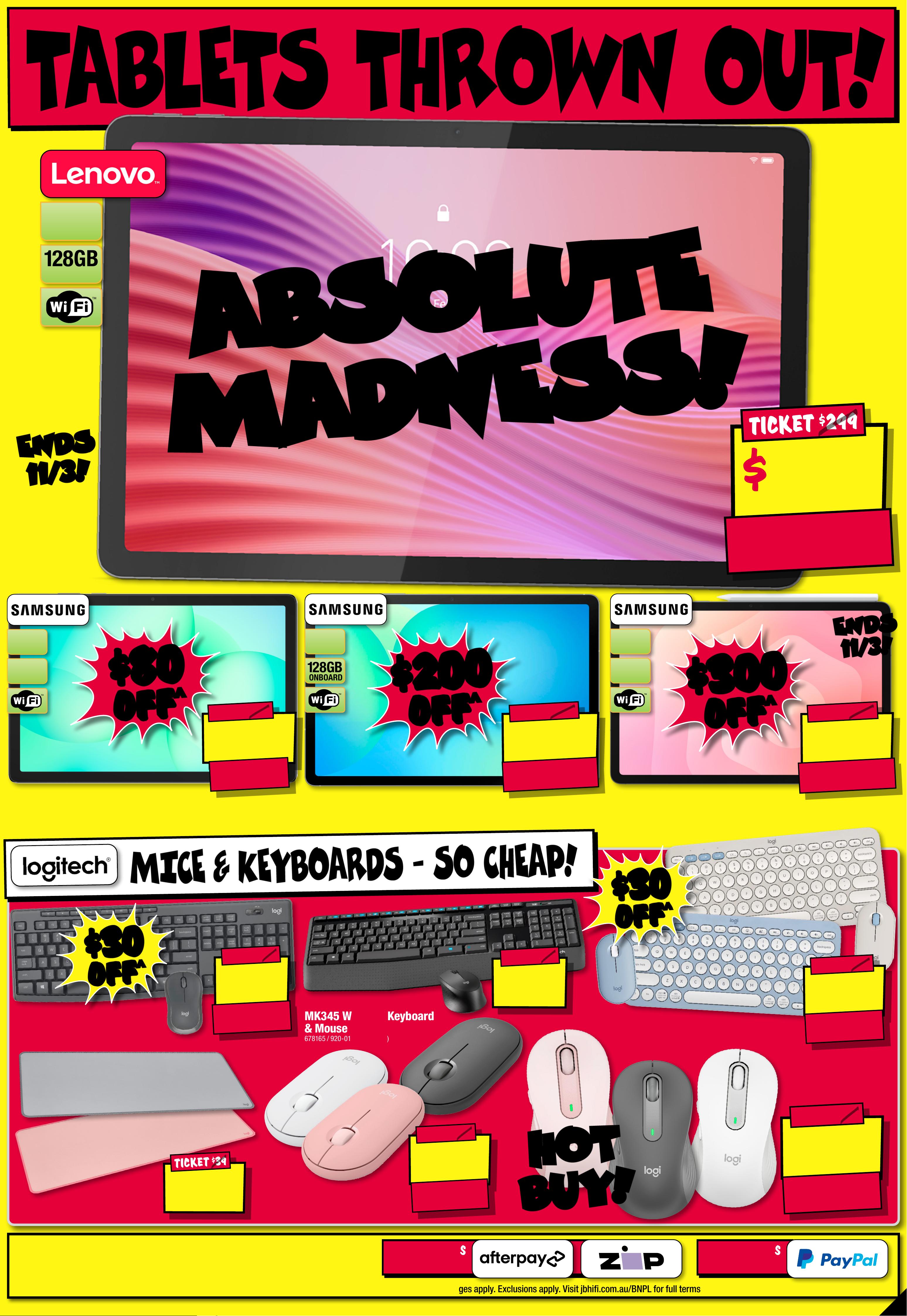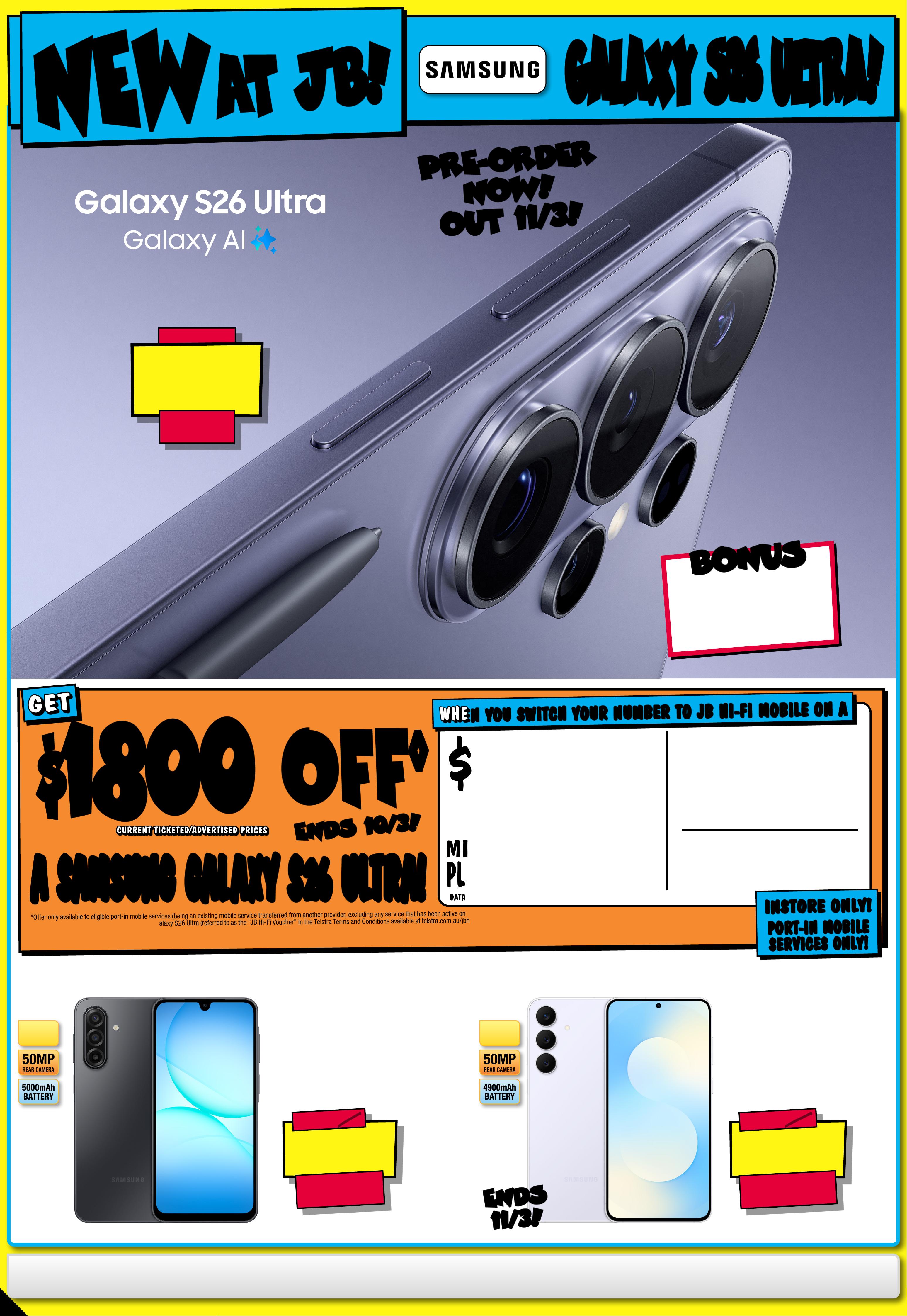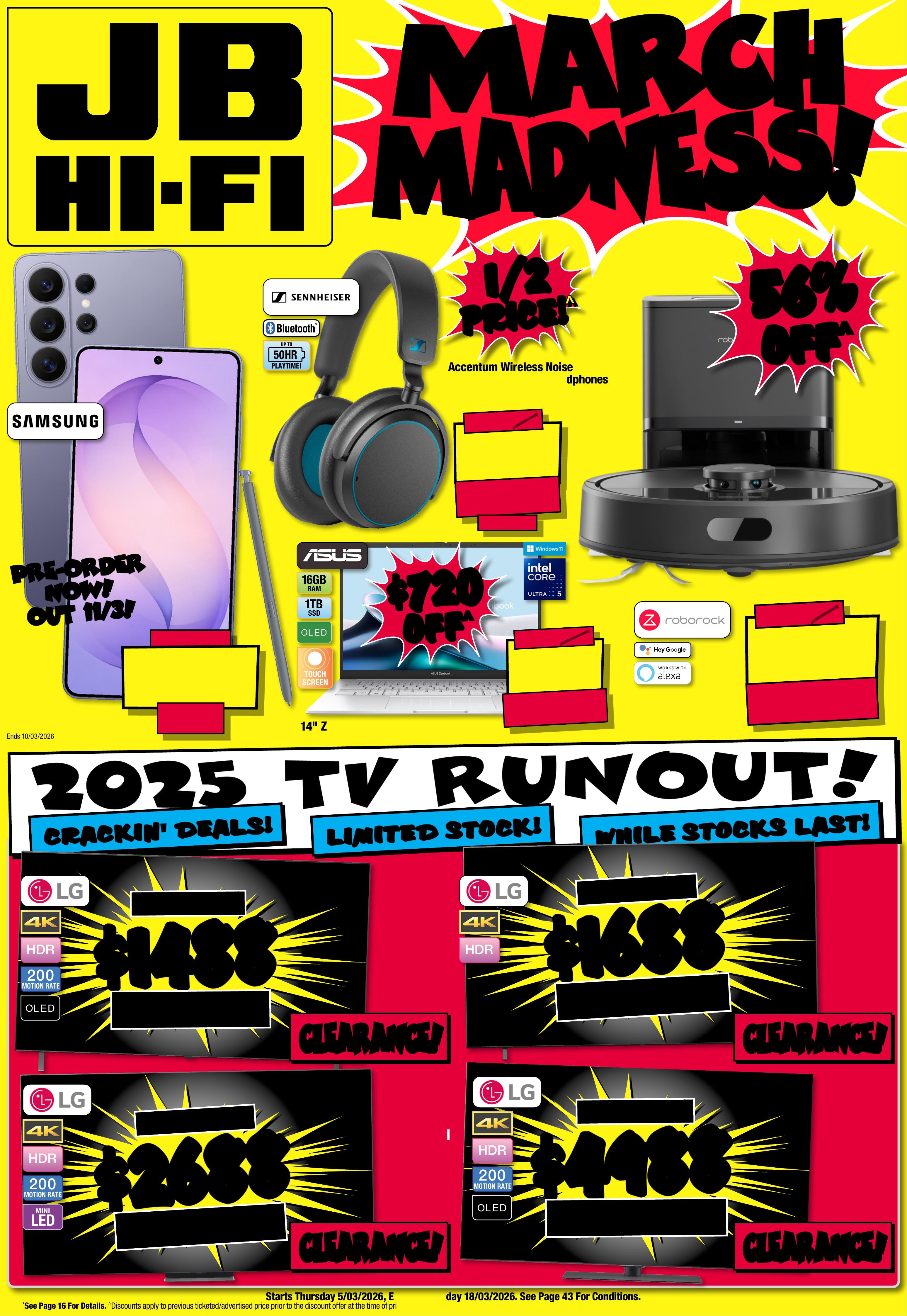 JB7242_ JBHIB E0824_ March Ma dness_PP1 289( W ) x 405( D )mm – PRO OF 8 CHANGES BEYOND PROO F 3 WI LL BE CHARGED EX TRA . S t a r ts T h u r s d a y 5 / 0 3 / 2 0 2 6, E nds Wednesd a y 1 8 / 0 3 / 20 26 . See P a ge 4 3 F or C on d i t i on s . ° S e e P a g e 1 6 F o r D e t ail s . ^ D i s c o u n t s a p p l y t o p r e v i o u s t i c k e t e d / a d v er t is e d pr i c e p r i o r t o t h e d i s c o u n t o f f e r a t t h e t i m e o f p r i nting 19/ 02 / 2 02 6. A s we ne got ia t kele, prod uct s will li y have be en so ld below ticketed Pric/adver t ised price prior to the discount offer. es may di f fer a t air por t s to res . M AR C H M AR C H M A D N E S S! M A D N E S S! $ $ 720 720 OFF OFF ^ ^ $ 1 67 9 $ 720 OFF ^ T ICK E T $ 2399 O L E D 1 TB S SD RAM 1 6GB 1 4 " Z enBook Notebook79 6 18 3 / UX3405CA-PZ354 W $ 149 $ 15 0 OFF ^ BLUE ON LY T ICK ET $ 299 PLAYTIME! UP TO 50HR A cce n t u m W i re l e s s N o is e Canc elling O ver- E ar Hea d p ho ne s (Blu e - Special Edition ) 787862 / 700 Bl381 ue On ly 1/2 1/2 PRICE! PRICE! ^ ^ $ 349 $ 45 0 OFF ^ T I CK E T $ 799 56 56 % % O FF O FF ^ ^ Q7B+ Rob ot ic Vac u u m 817543 / RR-Q7BP52 -03-BLK PRE-OR DER PRICE! $ 2 19 9 EA $ 2 499 e a FROM MAR CH 11° Gala x y S26 Ultra 5 12 G B 8 84 0 51 Star ted 26/0 2 /2026, E n d s 1 0/ 0 3 /20 26 PRE -O RDER PRE -O RDER N O W! N O W! O UT 1 1 / 3 ! O UT 1 1 / 3 ! 2025 TV RUNOUT! WH IL E ST O CK S L A ST ! WH IL E ST O CK S L A ST ! CR A CK IN ' DE AL S! CR A CK IN ' DE AL S! L I MI T E D STO CK ! L I MI T E D STO CK ! $ $ 16 8 8 16 8 8 T I CK E T $ 289 5 $ 12 07 OFF ^ 8 6" 4 K NanoCell Smar t LED T V 80276 5 / 86NANO80 ASA $ $ 14 8 8 14 8 8 T I CK E T $ 1995 $ 5 07 O FF ^ O L E D 200 MOTION RATE 5 5" 4K Smar t OLED T V 80278 8 / OLED55B5PS A $ $ 26 8 8 26 8 8 T I CK E T $ 4295 $ 1 6 07 O FF ^ LED MINI 200 MOTION RATE 8 6" 4 K QNED Evo A I S mar t Mini LED T V 8 027 75 / 86QNED86ASA $ $ 49 8 8 49 8 8 T I CK E T $ 7995 $ 3 0 0 7 O FF ^ O L E D 200 MOTION RATE 77" 4K E vo AI Smar t Galle r y OLED T V 80 2799 / OLE D77G5 PS A C LE AR ANC E ! C LE AR ANC E ! C LE AR ANC E ! C LE AR ANC E ! C LE AR ANC E ! C LE AR ANC E ! C LE AR ANC E ! C LE AR ANC E ! -