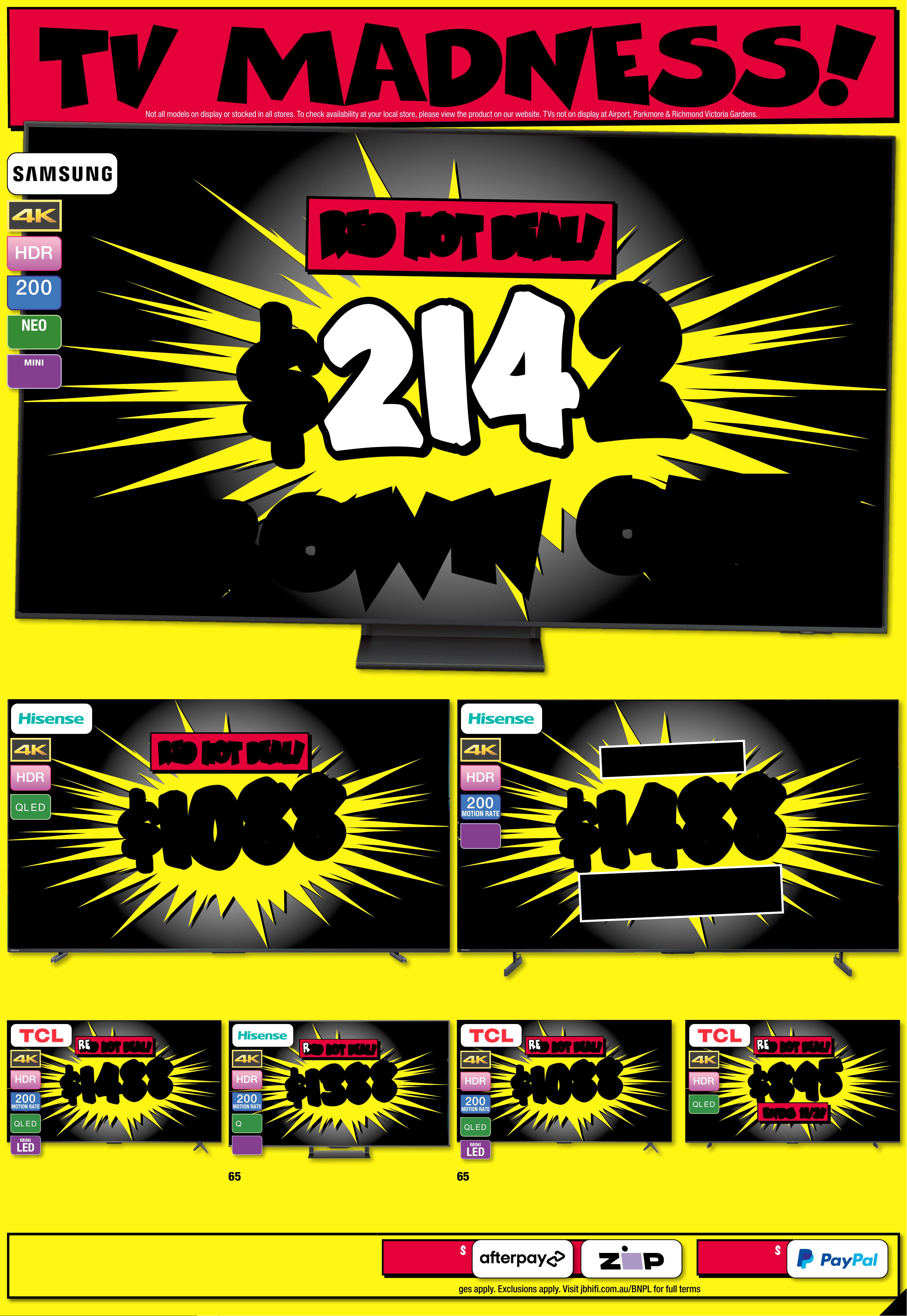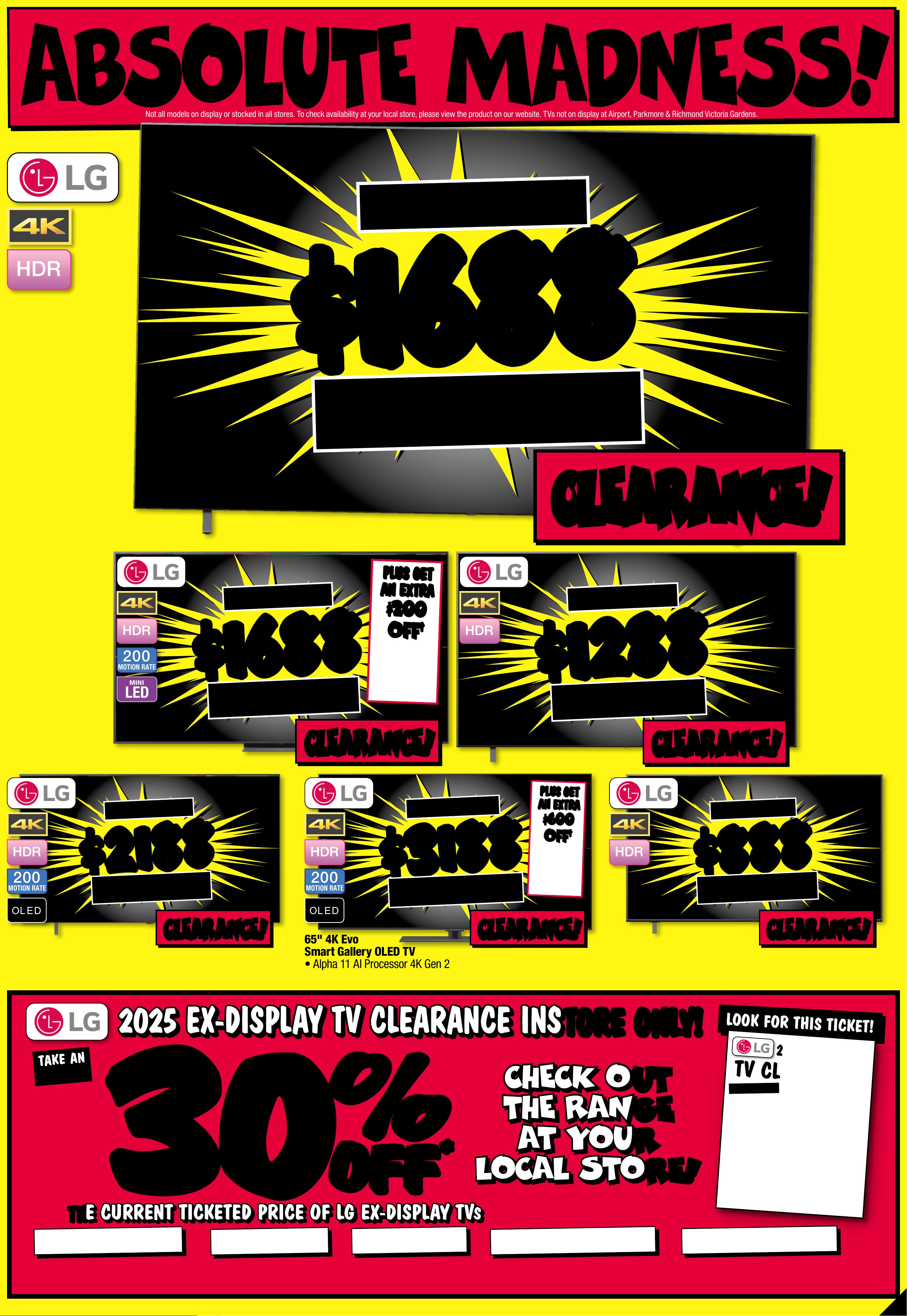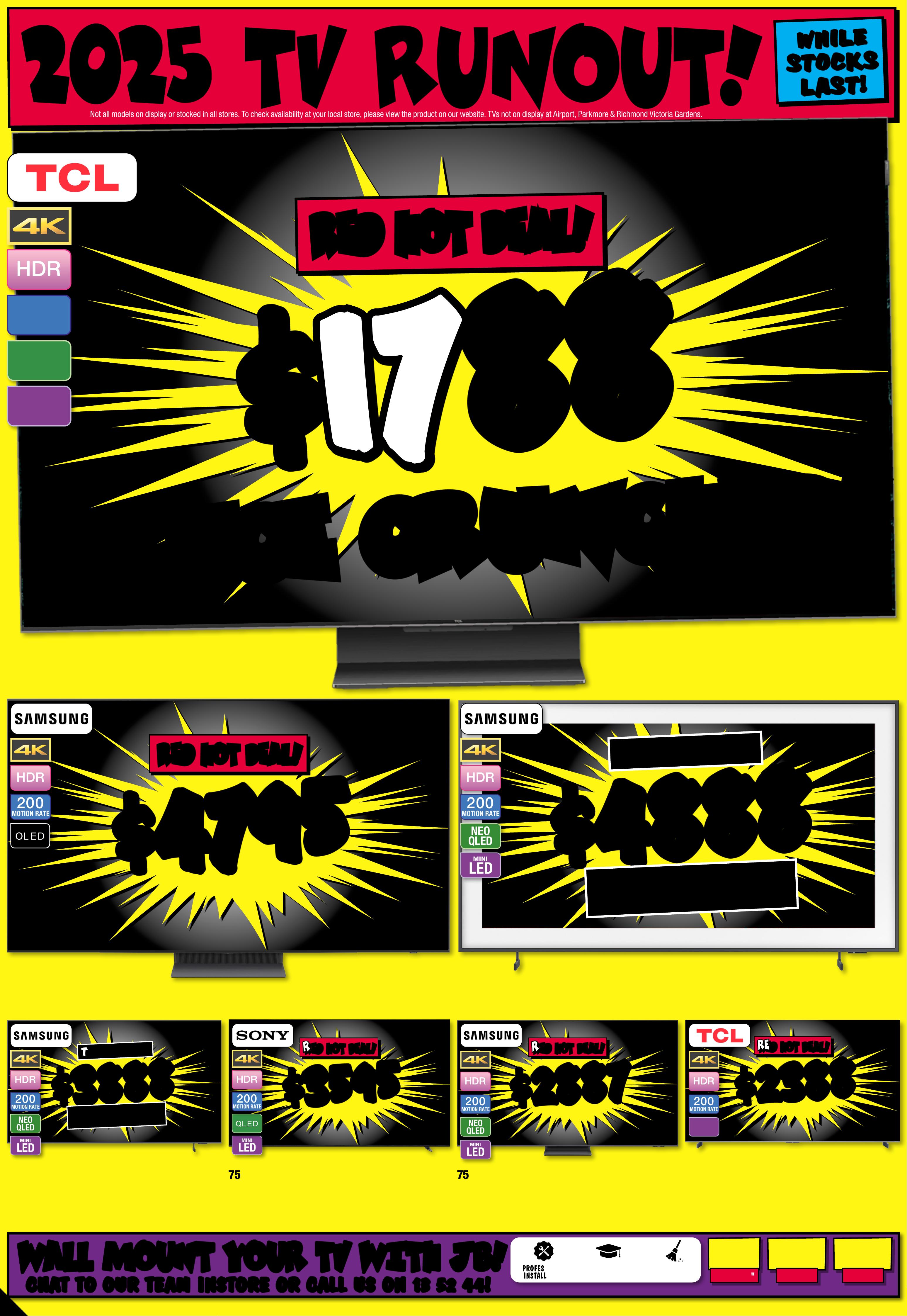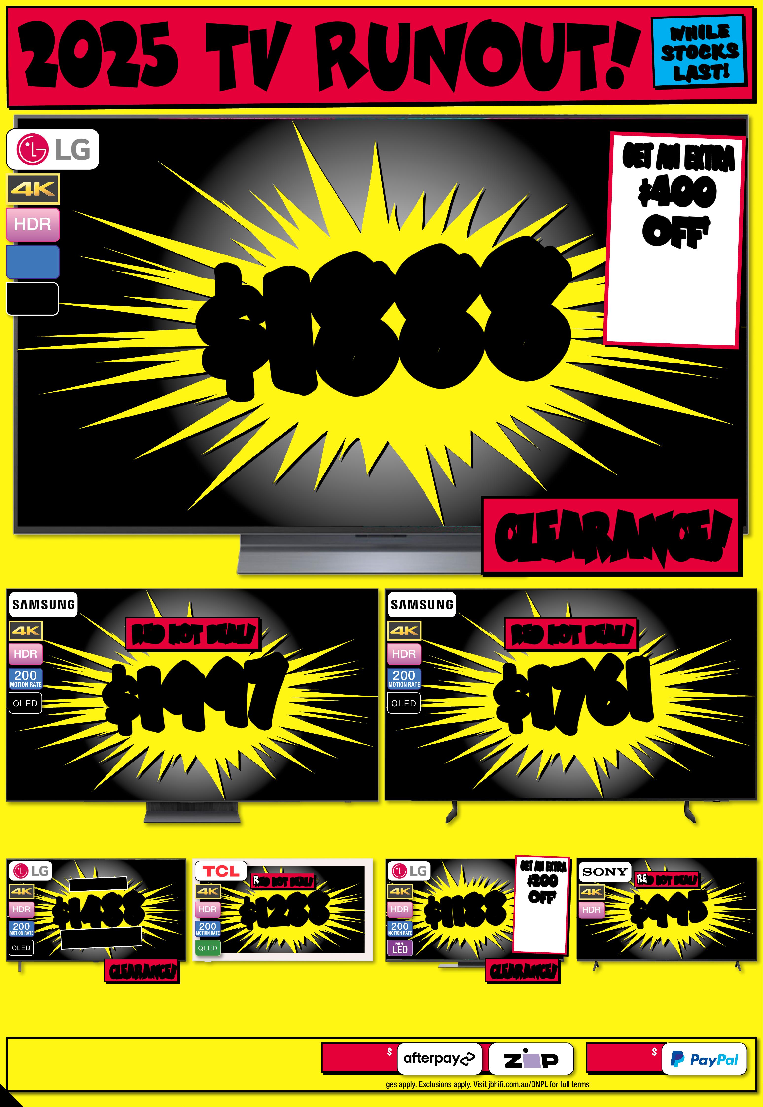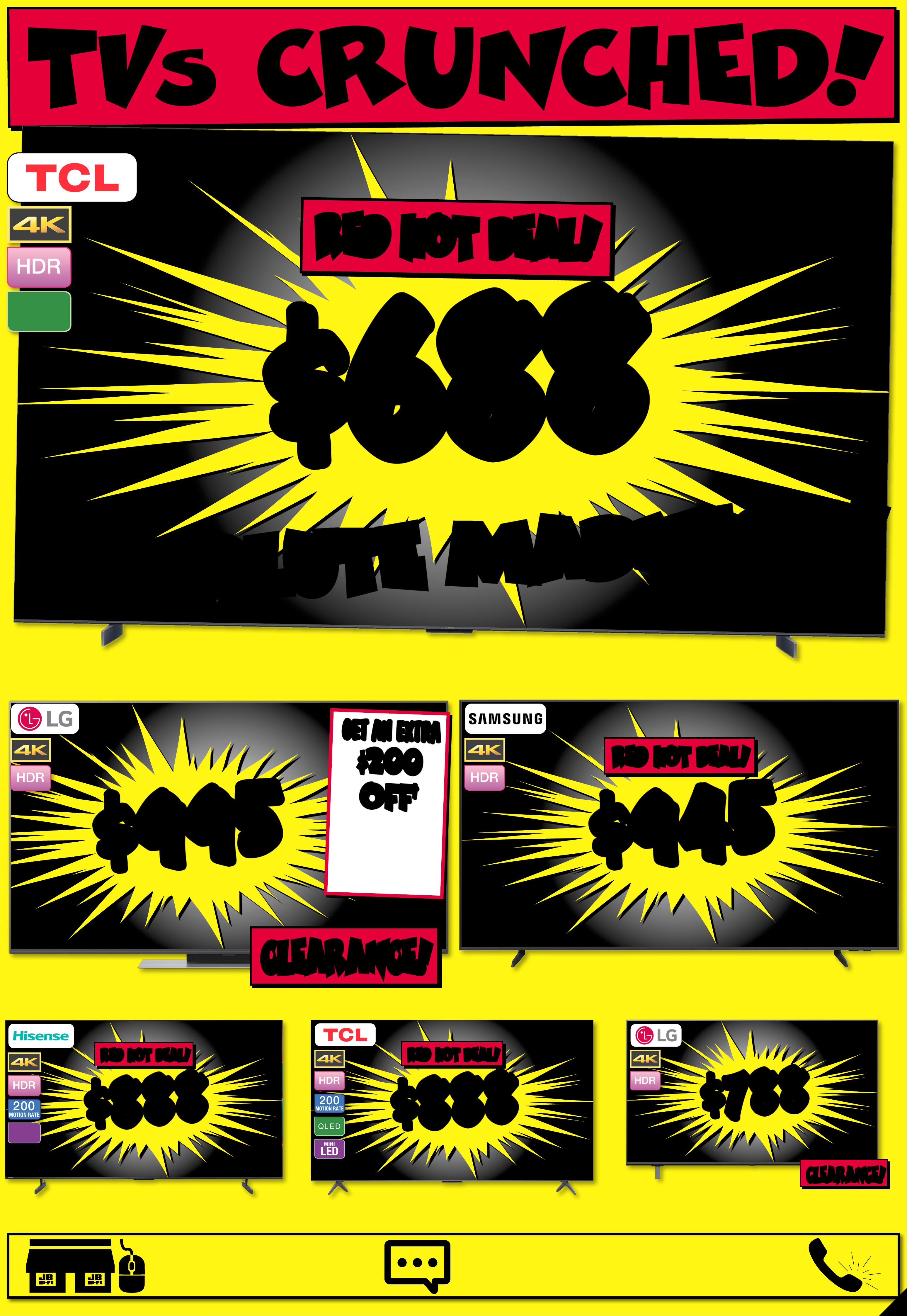JB7242_ JBHIB E0824_ March Ma dness_PP2 289( W ) x 4 05(D) mm – PRO OF 4 CHANGES BEYOND PROO F 3 WI LL BE CHARGED EX TRA . 20 25 T V RU N OU T ! No t all mo dels o n disp lay or s to cked i n all s tor es. To check av r loailabili t y at you ca l sto re, pl eas e vie w the p rod uct o n our we bsi te. T Vs no t on dis play a t Ai rp or t, P ar kmo re & R ic hmond Vic toria Gardens. # Fre e lo cal d eliv er y, tabl e top s et- up & c onn ec t of fe r is avail able o n 98" & a bove T Vs o nly. Of fer n ot ava ilable f or online p urcha se s or in some region al areas. Exclu des wall m ount ins itallation, audio component installat on and o ld T V r emov al. Additional charg es ma tallation locaty apply f or ins ions beyond 2 5K M o f the s tore/s octock pick up l atio n. Fo r full te rms & co ndit ions v is it jbhifi.com.au /del iver y. Exclu des Bl aupunk t T V. † When Purc hased in th e Same Tr ansactio JB Hin. Excludes -F i Mar ket place Products. Discount is appli t ticketeed at po int of s ale in s tor e and applied automatic ly at caal r t if pur chas ed onlin e. This o f fer ap plies t o curre n d/advertise d price s. P rice s of so me prod uct s ar e likely to have c hange d and may h ave incre ase d prio r to this o f fer . Bec aus e of thi s and as w e regula rly negotiate on price, some produc ts ar e likely to h ave been s old below the curren t tick eted/adv ertise d pr ior to t his of f er . Pri ces may ch ange a f ter t his of fer. If T V or S oundb ar is ret e chanurned for eligibl ge of mind, o f fer w ill be for feite d and of fe r amoun t will be de duct ed fr om ref und amount. ^ Dis cou nt s apply t o previ ous t ickete d /adver ti sed pr ice pr ior to t he dis coun t of fer a t the t ime of pr intin g 1 9/ 02 /2 02 6. A s we negot will likeiate, products ly have be en sol d below t icket ed /adver t ised pr ice pr ior t o the dis coun t of f er. Price s may di f fer a t air por t s t ores. $ $ 4 49 5 4 495 T I CK E T $ 89 9 5 1/2 PR I CE ! ^ LED MINI 200 MOTION RATE 1 00" 4K QNED Evo AI Smar t Mini L ED T V • Advanced L ocal Dim mi ng • Dynamic Q N ED Co lou r Sol utio n 80 2776 / 10 0 Q N E D 8 6 A S St arted 1 9/02/2026 # # F R EE F R EE DEL I VERY , SE T UP & C ONNECT! M O NS T E R 1 0 0 ' ' M O NS T E R 1 0 0 ' ' $ $ 26 8 8 26 8 8 T I CK E T $ 42 95 $ 16 0 7 OFF ^ LED MINI 200 MOTION RATE 8 6 " 4K QNED E v o AI Smart Mini L ED T V • A dvanced Local Dimm ing • D ynamic QNE D Colo ur Solution 8 0 2 7 75 / 86 Q N E D 86 A S A $ $ 37 8 8 37 8 8 T ICK ET $ 5995 $ 2 2 0 7 O FF ^ O L E D 200 MOTION RATE 7 7 " 4K Evo AI Smart O LE D T V • A lpha 9 A I Proc essor 4 K Gen 8 • Brightness Booste r 802795 / OL ED77C 5P SA $ $ 49 8 8 49 8 8 T I CK E T $ 799 5 $ 3 0 07 O FF ^ O L E D 200 MOTION RATE 77" 4K Evo AI Smar t G aller y OL ED T V • Alp ha 1 1 AI P roces sor 4K G en 2 •Slim Wal l Mount Included 802799 / OL ED77G 5P SA $ $ 26 8 8 26 8 8 O L E D 200 MOTION RATE 65" 4K Evo AI Smar t O LED T V • A lpha 9 A I Proc essor 4 K Gen 8 • Brightness Booste r 802794 / OLED65C 5PSA $ $ 54 8 8 54 8 8 T I CK E T $ 79 95 $ 25 07 OFF ^ O L E D 200 MOTION RATE 83" 4K Evo AI Smar t OL ED T V • A lpha 9 A I Proc essor 4 K Gen 8 • Brightness Booster 802796 / OLED83C5P SA PLUS GE T PLUS GE T AN EXTR A AN EXTR A $60 0 $60 0 OFF OFF † † Current Ticke ted/ Adver tised Price WHE N YOU A DD AN S 95 T OR SG 10T SOUNDBAR! ENDS 25 /03 /202 6 PLUS GE T PLUS GE T AN EXTR A AN EXTR A $40 0 $40 0 OFF OFF † † Current Ticke ted/ Adver tised Price WHE N YOU A DD AN S C9S O R S8 0T SOUNDBAR! ENDS 25 /03 /202 6 GET GET AN EXTR A AN EXTR A $40 0 $40 0 OFF OFF † † Current Ticke ted/ Adver tised Price WHE N YOU A DD AN S C9S O R S8 0T SOUNDBAR! ENDS 25 /03 /202 6 PLU S G E T PLU S G E T AN EX TR A AN EX TR A $ 400 $ 400 O FF O FF † † Current Ticke ted/ Adver tised Price WHEN YOU ADD AN SC9S OR S80T SOUND BAR! ENDS 25/03 / 202 6 PLU S G E T PLU S G E T AN EX TR A AN EX TR A $20 0 $20 0 O FF O FF † † Current Ticke ted/ Adver tised Price WHEN YOU ADD AN S 70T SOUND BAR! Page contents: LG 65" OLED EVO G5 AI 4K UHD Smart TV [2025], LG 65" NANO80A AI LED 4K UHD Smart TV [2025], LG 65" OLED B5 AI 4K UHD Smart TV [2025], LG 75" NANO80A AI LED 4K UHD Smart TV [2025], LG 75" QNED86A EVO AI Mini-LED 4K UHD Smart TV [2025], LG 86" NANO80A AI LED 4K UHD Smart TV [2025],JB7242_ JBHIB E0824_ March Ma dness_PP3 289( W ) x 4 05(D) mm – PRO OF 5 CHANGES BEYOND PROO F 3 WI LL BE CHARGED EX TRA . *O f fe r St ar t s 5 /3 / 20 26 , unt il so ld ou t. E xcl ude s LG S ta nd By Me mo del s. Di sc oun t is app lied t o the c urr ent t icke te d pri ce of ex- disp lay mo del s (as ma rke d) in st ore o nly. Of f er no t avail abl e onlin e. Ava ilab ilit y in st ore lim ite d and s ubje ct t o chan ge, ch eck o nline a nd ca ll you r loc al s tor e to ch eck av aila bili t y. Y our lo ca l st ore w ill no t be ab le to ac ce ss ex-d ispl ay st ock f ro m ano the r loc at ion . E x-dis play m ode ls ar e in wor ki ng or der bu t have b een di spl ayed a nd use d ins to re fo r demo ns tr ati on fo r sig nifi ca nt pe rio ds. M ay ha ve con sid era ble s cree n time, c os met ic dam age, mi ss ing s ta nds , legs a nd pr odu ct ma nua l, an d be so ld wi th a 3 rd pa r t y remo te co nt rol . May n ot co me wi th or igin al pa cka ging o r par t s. D eliv er y & ins ta ll co st s may b e requ ire d for s ome s cree n size s and m ode ls. 2 0 2 5 E X - D I S P L A Y T V C L E A R A N C E I N S T OR E O N L Y ! 2 0 2 5 E X - D I S P L A Y T V C L E A R A N C E I N S T OR E O N L Y ! TH E C U R R E N T T I C K E T E D P R I C E O F L G E X - D I S P L A Y T V TH E C U R R E N T T I C K E T E D P R I C E O F L G E X - D I S P L A Y T V S S TA K E A N EX TRA C H E C K O UT C H E C K O UT T H E R A N GE T H E R A N GE A T Y O U RA T Y O U RL O C A L S T O RE! L O C A L S T O RE! 30 30 % % O FF O FF * * L O O K F O R T HIS T IC K E T ! 2 025 EX-D I SPLA Y T V C L EARANCE!THE CURRENT TICKETED PRIC