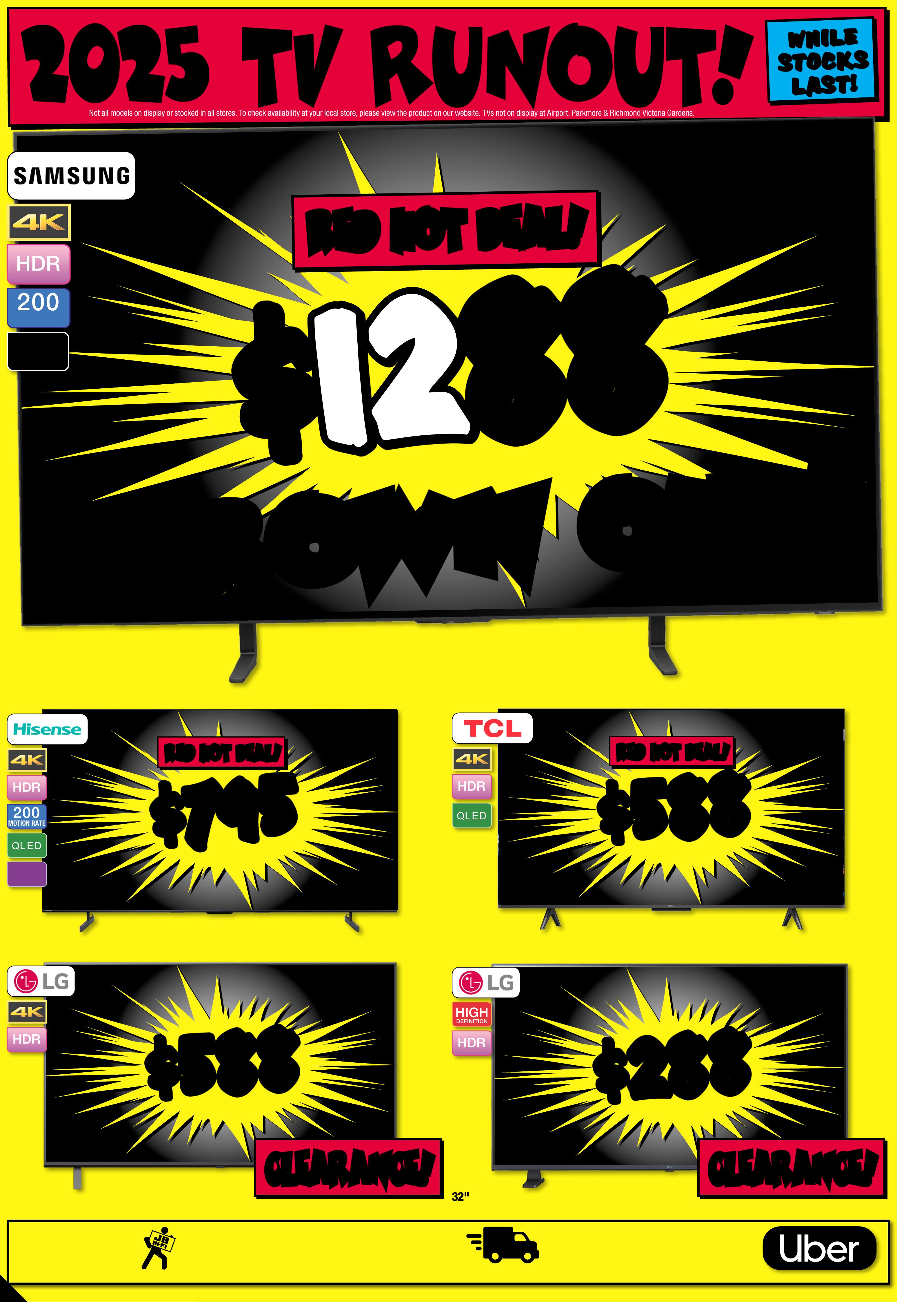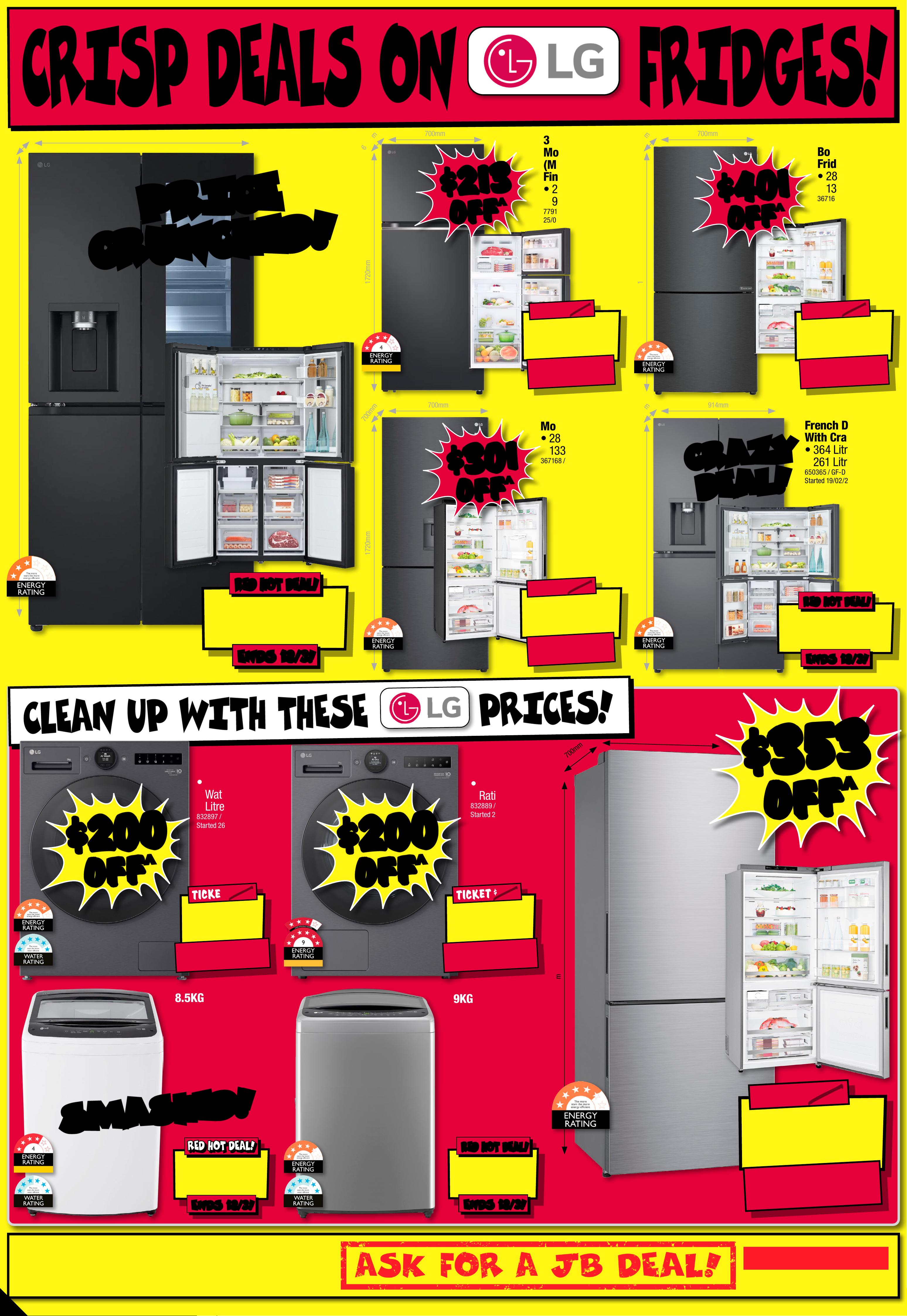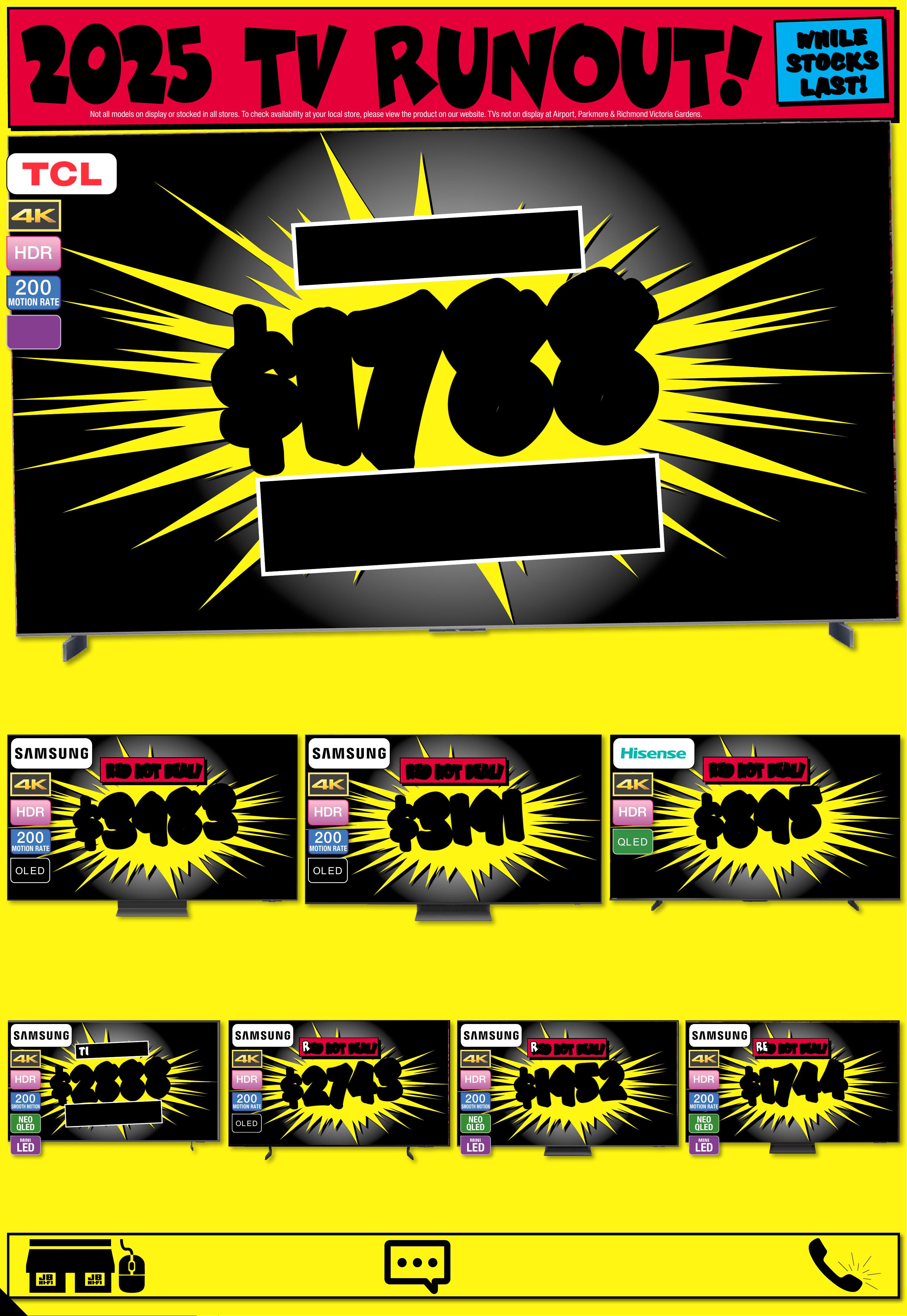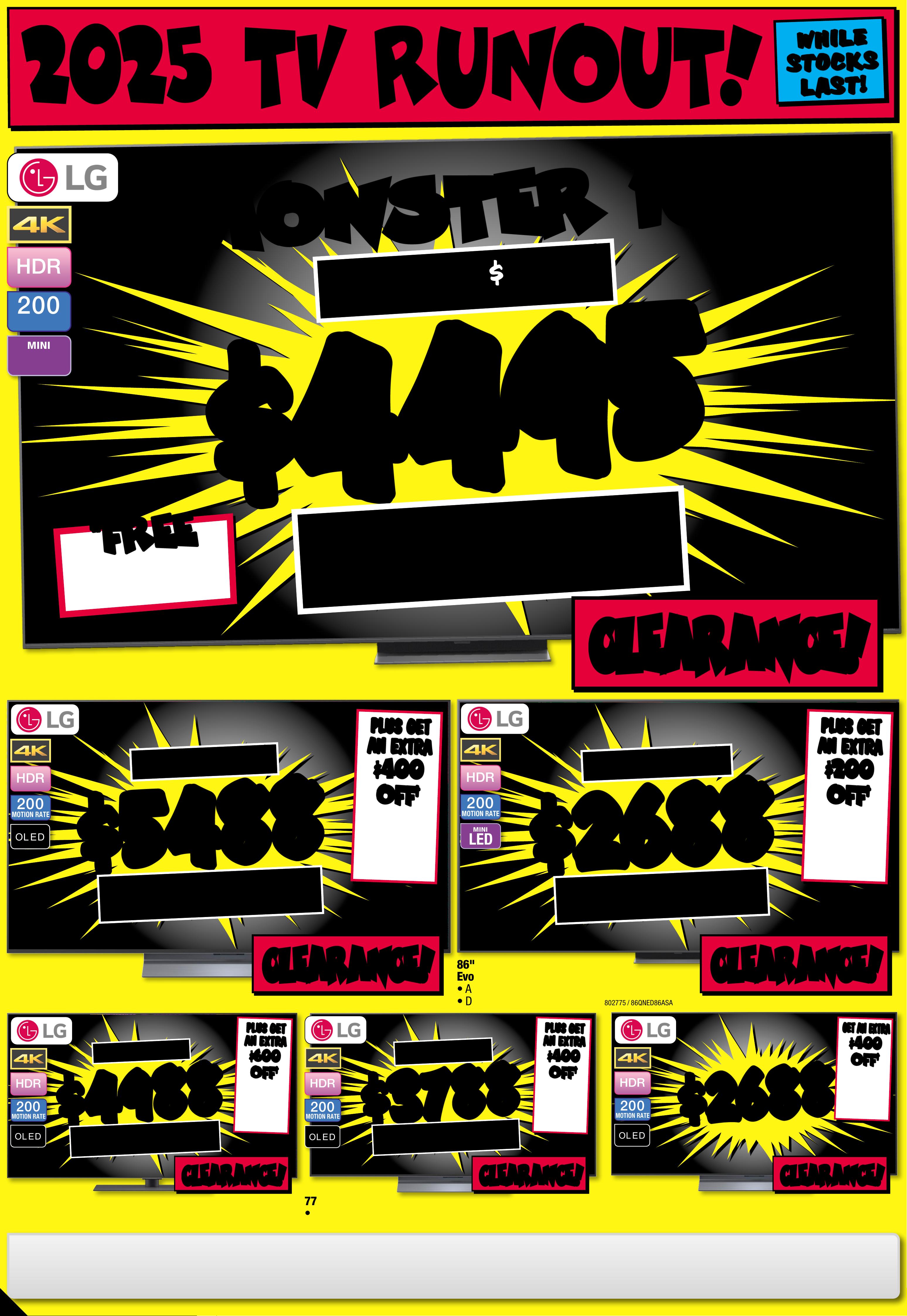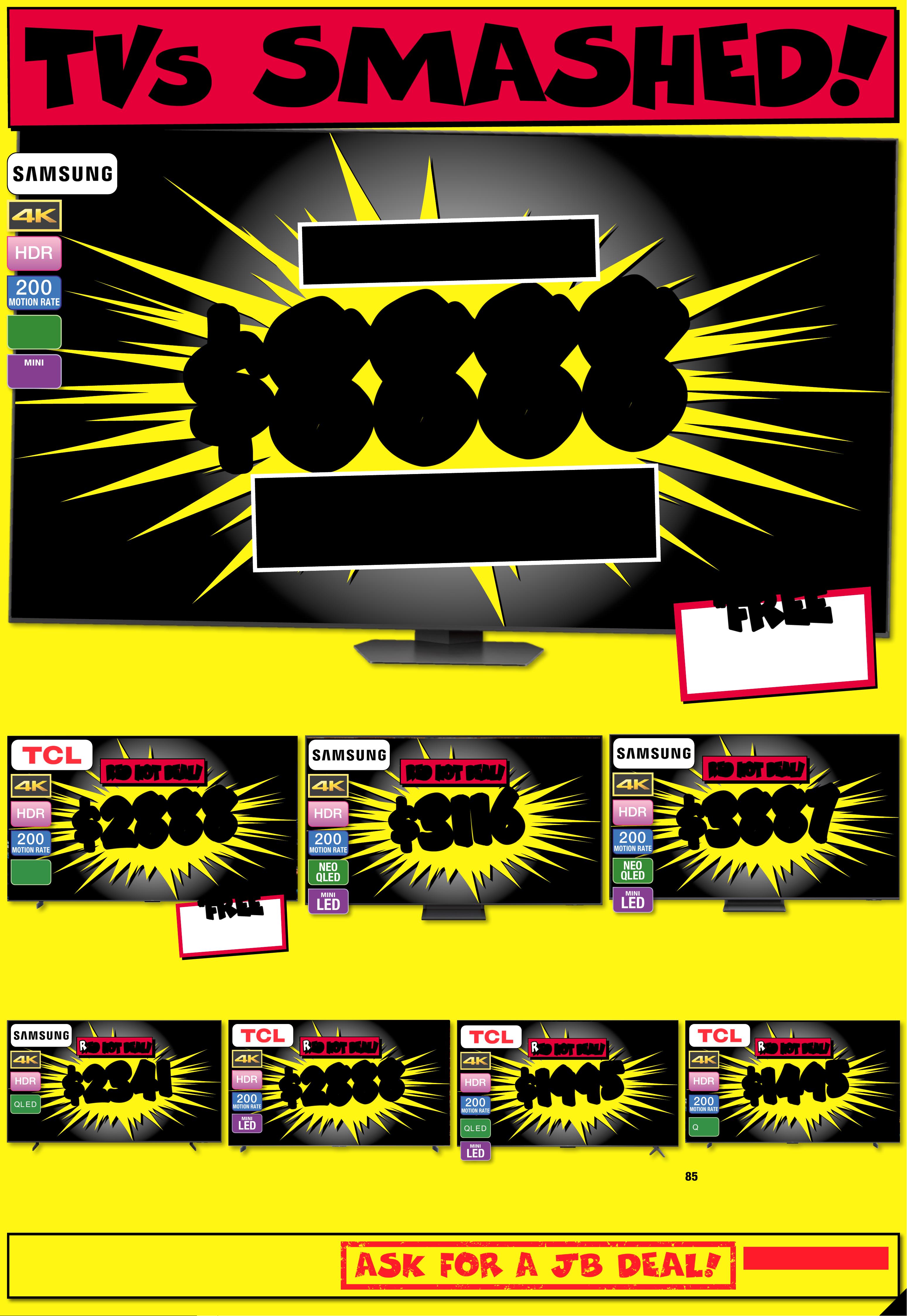 JB7242_ JBHIB E0824_ March Ma dness_PP2 289( W ) x 4 05(D) mm – PRO OF 4 CHANGES BEYOND PROO F 3 WI LL BE CHARGED EX TRA . 20 25 T V RU N OU T ! No t all mo dels o n disp lay or s to cked i n all s tor es. To check av r loailabili t y at you ca l sto re, pl eas e vie w the p rod uct o n our we bsi te. T Vs no t on dis play a t Ai rp or t, P ar kmo re & R ic hmond Vic toria Gardens. # Fre e lo cal d eliv er y, tabl e top s et- up & c onn ec t of fe r is avail able o n 98" & a bove T Vs o nly. Of fer n ot ava ilable f or online p urcha se s or in some region al areas. Exclu des wall m ount ins itallation, audio component installat on and o ld T V r emov al. Additional charg es ma tallation locaty apply f or ins ions beyond 2 5K M o f the s tore/s octock pick up l atio n. Fo r full te rms & co ndit ions v is it jbhifi.com.au /del iver y. Exclu des Bl aupunk t T V. † When Purc hased in th e Same Tr ansactio JB Hin. Excludes -F i Mar ket place Products. Discount is appli t ticketeed at po int of s ale in s tor e and applied automatic ly at caal r t if pur chas ed onlin e. This o f fer ap plies t o curre n d/advertise d price s. P rice s of so me prod uct s ar e likely to have c hange d and may h ave incre ase d prio r to this o f fer . Bec aus e of thi s and as w e regula rly negotiate on price, some produc ts ar e likely to h ave been s old below the curren t tick eted/adv ertise d pr ior to t his of f er . Pri ces may ch ange a f ter t his of fer. If T V or S oundb ar is ret e chanurned for eligibl ge of mind, o f fer w ill be for feite d and of fe r amoun t will be de duct ed fr om ref und amount. ^ Dis cou nt s apply t o previ ous t ickete d /adver ti sed pr ice pr ior to t he dis coun t of fer a t the t ime of pr intin g 1 9/ 02 /2 02 6. A s we negot will likeiate, products ly have be en sol d below t icket ed /adver t ised pr ice pr ior t o the dis coun t of f er. Price s may di f fer a t air por t s t ores. $ $ 4 49 5 4 495 T I CK E T $ 89 9 5 1/2 PR I CE ! ^ LED MINI 200 MOTION RATE 1 00" 4K QNED Evo AI Smar t Mini L ED T V • Advanced L ocal Dim mi ng • Dynamic Q N ED Co lou r Sol utio n 80 2776 / 10 0 Q N E D 8 6 A S St arted 1 9/02/2026 # # F R EE F R EE DEL I VERY , SE T UP & C ONNECT! M O NS T E R 1 0 0 ' ' M O NS T E R 1 0 0 ' ' $ $ 26 8 8 26 8 8 T I CK E T $ 42 95 $ 16 0 7 OFF ^ LED MINI 200 MOTION RATE 8 6 " 4K QNED E v o AI Smart Mini L ED T V • A dvanced Local Dimm ing • D ynamic QNE D Colo ur Solution 8 0 2 7 75 / 86 Q N E D 86 A S A $ $ 37 8 8 37 8 8 T ICK ET $ 5995 $ 2 2 0 7 O FF ^ O L E D 200 MOTION RATE 7 7 " 4K Evo AI Smart O LE D T V • A lpha 9 A I Proc essor 4 K Gen 8 • Brightness Booste r 802795 / OL ED77C 5P SA $ $ 49 8 8 49 8 8 T I CK E T $ 799 5 $ 3 0 07 O FF ^ O L E D 200 MOTION RATE 77" 4K Evo AI Smar t G aller y OL ED T V • Alp ha 1 1 AI P roces sor 4K G en 2 •Slim Wal l Mount Included 802799 / OL ED77G 5P SA $ $ 26 8 8 26 8 8 O L E D 200 MOTION RATE 65" 4K Evo AI Smar t O LED T V • A lpha 9 A I Proc essor 4 K Gen 8 • Brightness Booste r 802794 / OLED65C 5PSA $ $ 54 8 8 54 8 8 T I CK E T $ 79 95 $ 25 07 OFF ^ O L E D 200 MOTION RATE 83" 4K Evo AI Smar t OL ED T V • A lpha 9 A I Proc essor 4 K Gen 8 • Brightness Booster 802796 / OLED83C5P SA PLUS GE T PLUS GE T AN EXTR A AN EXTR A $60 0 $60 0 OFF OFF † † Current Ticke ted/ Adver tised Price WHE N YOU A DD AN S 95 T OR SG 10T SOUNDBAR! ENDS 25 /03 /202 6 PLUS GE T PLUS GE T AN EXTR A AN EXTR A $40 0 $40 0 OFF OFF † † Current Ticke ted/ Adver tised Price WHE N YOU A DD AN S C9S O R S8 0T SOUNDBAR! ENDS 25 /03 /202 6 GET GET AN EXTR A AN EXTR A $40 0 $40 0 OFF OFF † † Current Ticke ted/ Adver tised Price WHE N YOU A DD AN S C9S O R S8 0T SOUNDBAR! ENDS 25 /03 /202 6 PLU S G E T PLU S G E T AN EX TR A AN EX TR A $ 400 $ 400 O FF O FF † † Current Ticke ted/ Adver tised Price WHEN YOU ADD AN SC9S OR S80T SOUND BAR! ENDS 25/03 / 202 6 PLU S G E T PLU S G E T AN EX TR A AN EX TR A $20 0 $20 0 O FF O FF † † Current Ticke ted/ Adver tised Price WHEN YOU ADD AN S 70T SOUND BAR! Page contents: LG 65" OLED EVO G5 AI 4K UHD Smart TV [2025], LG 65" NANO80A AI LED 4K UHD Smart TV [2025], LG 65" OLED B5 AI 4K UHD Smart TV [2025], LG 75" NANO80A AI LED 4K UHD Smart TV [2025], LG 75" QNED86A EVO AI Mini-LED 4K UHD Smart TV [2025], LG 86" NANO80A AI LED 4K UHD Smart TV [2025],JB7242_ JBHIB E0824_ March Ma dness_PP3 289( W ) x 4 05(D) mm – PRO OF 5 CHANGES BEYOND PROO F 3 WI LL BE CHARGED EX TRA . *O f fe r St ar t s 5 /3 / 20 26 , unt il so ld ou t. E xcl ude s LG S ta nd By Me mo del s. Di sc oun t is app lied t o the c urr ent t icke te d pri ce of ex- disp lay mo del s (as ma rke d) in st ore o nly. Of f er no t avail abl e onlin e. Ava ilab ilit y in st ore lim ite d and s ubje ct t o chan ge, ch eck o nline a nd ca ll you r loc al s tor e to ch eck av aila bili t y. Y our lo ca l st ore w ill no t be ab le to ac ce ss ex-d ispl ay st ock f ro m ano the r loc at ion . E x-dis play m ode ls ar e in wor ki ng or der bu t have b een di spl ayed a nd use d ins to re fo r demo ns tr ati on fo r sig nifi ca nt pe rio ds. M ay ha ve con sid era ble s cree n time, c os met ic dam age, mi ss ing s ta nds , legs a nd pr odu ct ma nua l, an d be so ld wi th a 3 rd pa r t y remo te co nt rol . May n ot co me wi th or igin al pa cka ging o r par t s. D eliv er y & ins ta ll co st s may b e requ ire d for s ome s cree n size s and m ode ls. 2 0 2 5 E X - D I S P L A Y T V C L E A R A N C E I N S T OR E O N L Y ! 2 0 2 5 E X - D I S P L A Y T V C L E A R A N C E I N S T OR E O N L Y ! TH E C U R R E N T T I C K E T E D P R I C E O F L G E X - D I S P L A Y T V TH E C U R R E N T T I C K E T E D P R I C E O F L G E X - D I S P L A Y T V S S TA K E A N EX TRA C H E C K O UT C H E C K O UT T H E R A N GE T H E R A N GE A T Y O U RA T Y O U RL O C A L S T O RE! L O C A L S T O RE! 30 30 % % O FF O FF * * L O O K F O R T HIS T IC K E T ! 2 025 EX-D I SPLA Y T V C L EARANCE!THE CURRENT TICKETED PRIC